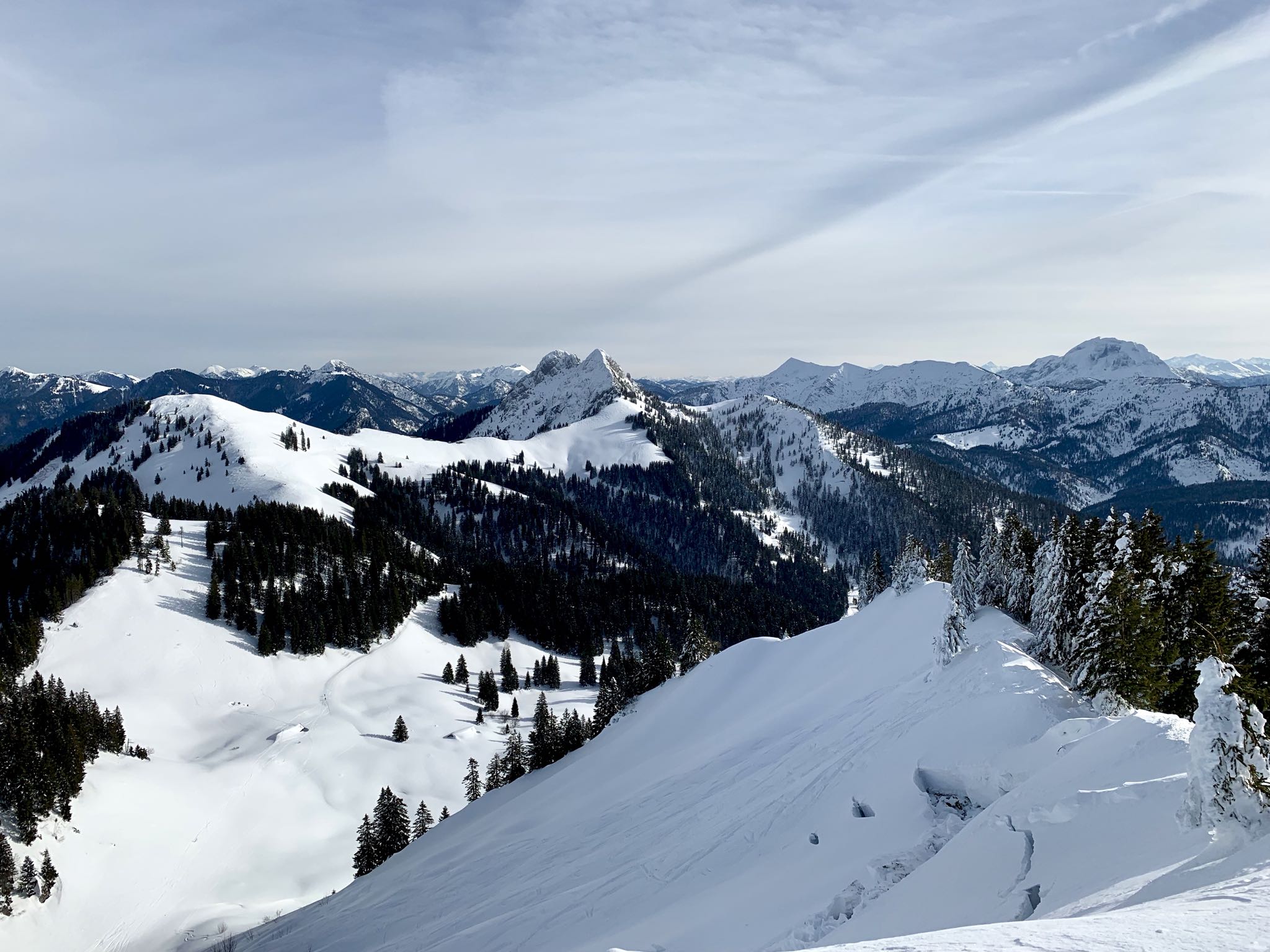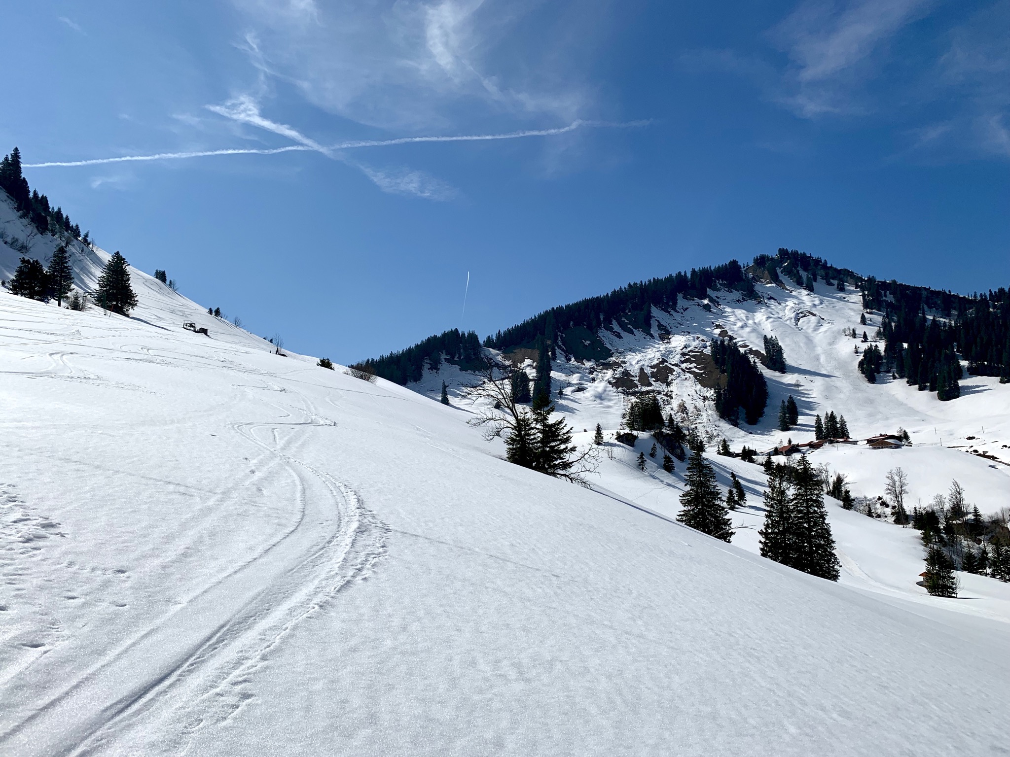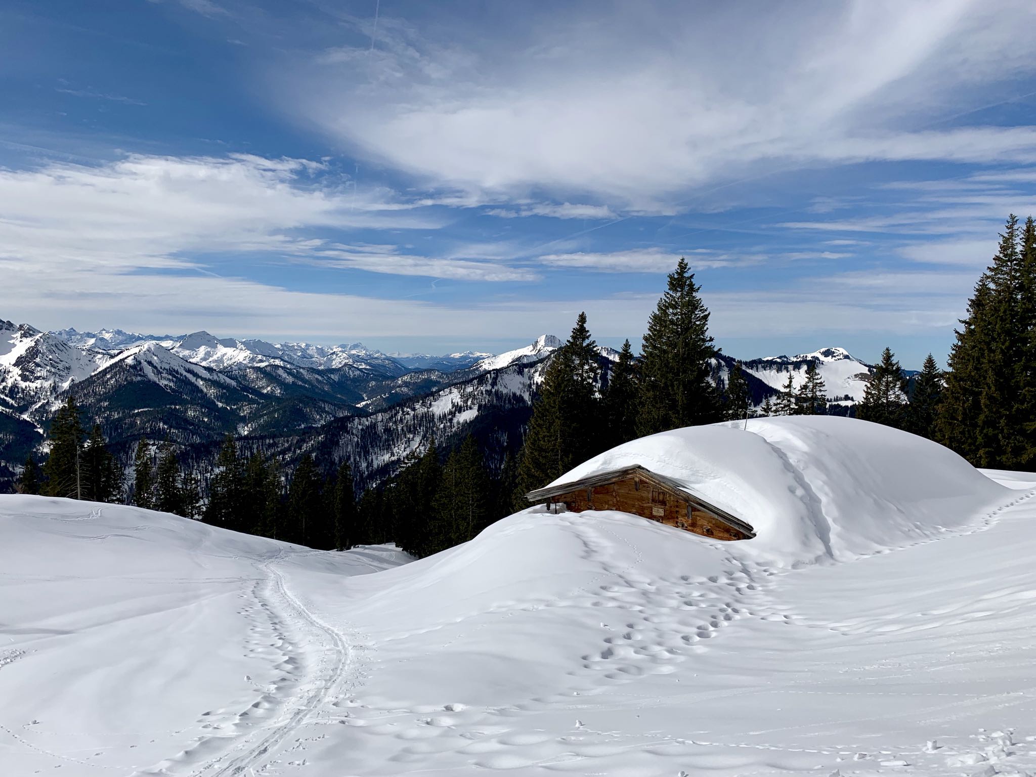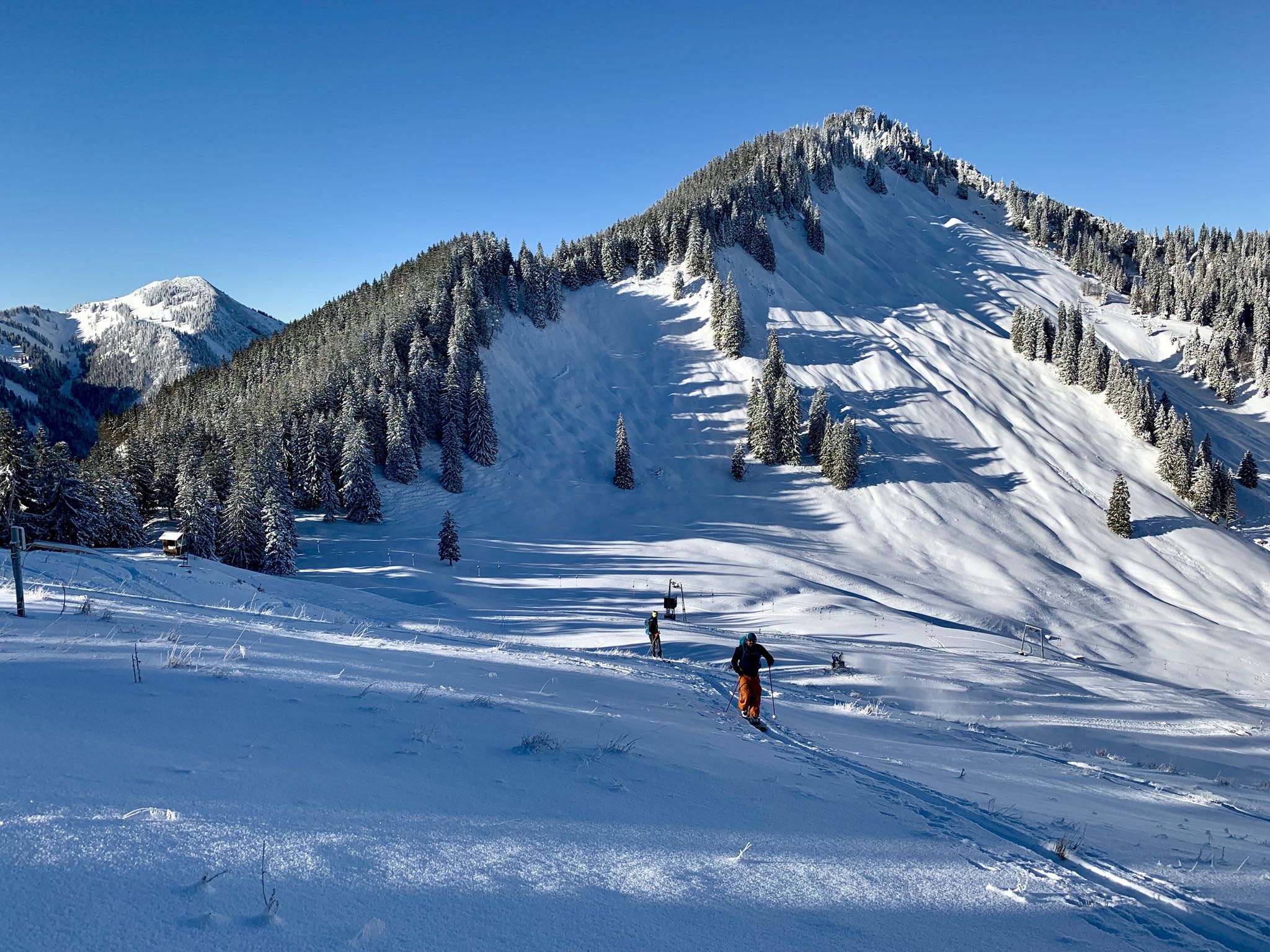 Tourenverhältnisse: -11°C, Strasse bis Lasseln geräumt, im Aufstieg zum Mariaeck unter den Bäumen harschig, Alpel pistenmäßig eingefahren, Schönberg zerfahren, östl. Mariaeck feiner Pulver fast spurlos, runter zur Rauhalm mit sporadischem Deckel, N-Hang vom Seekarkreuz unterhalb der Waldgrenze noch sehr gut zu fahren (oberhalb verblasen), unterhalb der Seekarstrasse dann schon schwerer Schnee