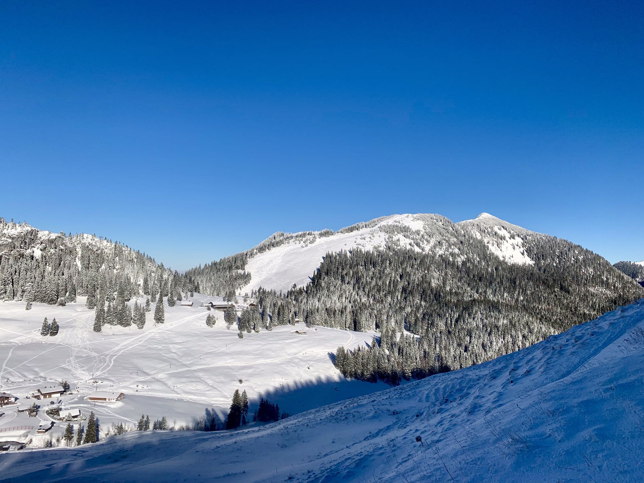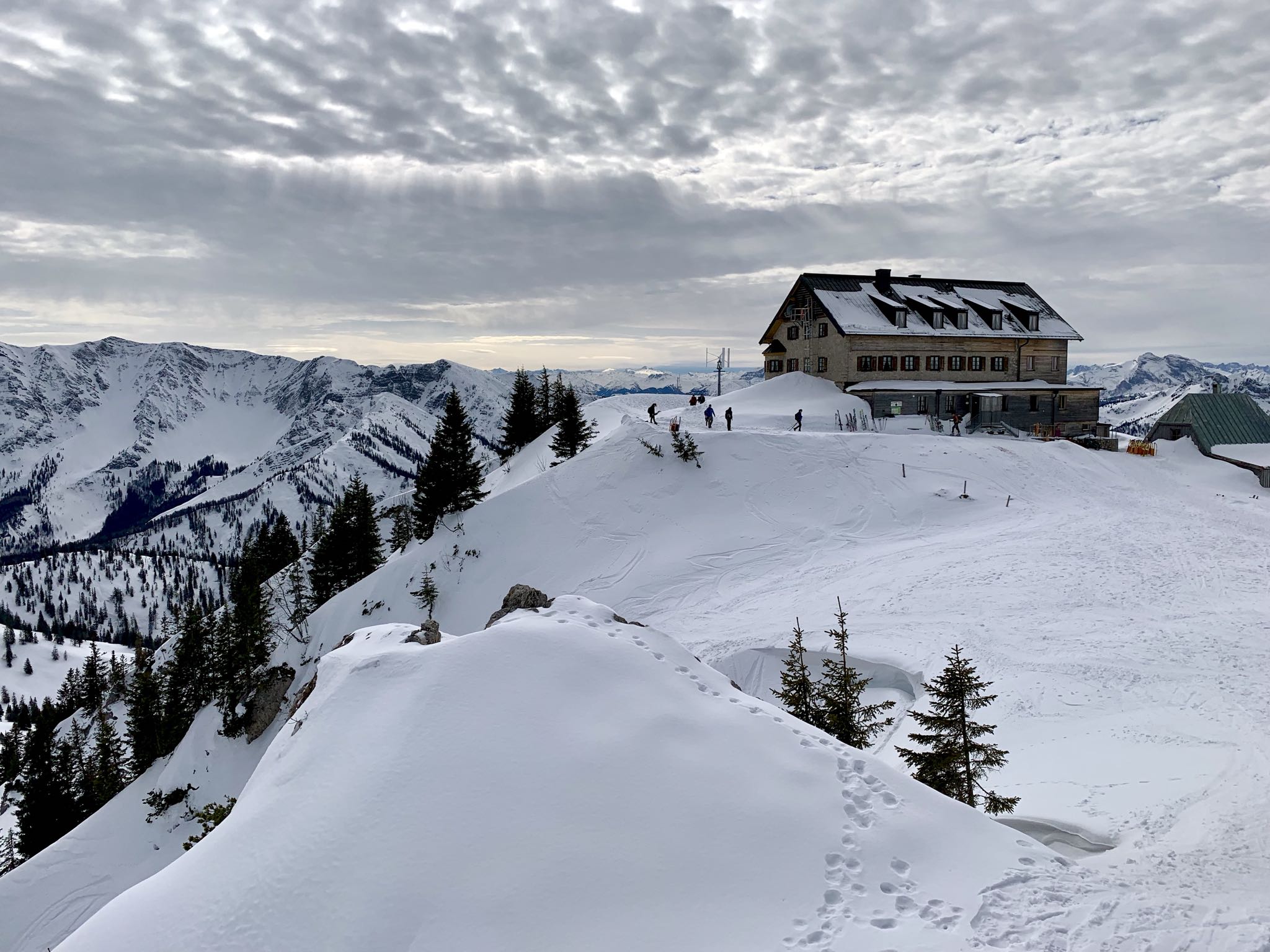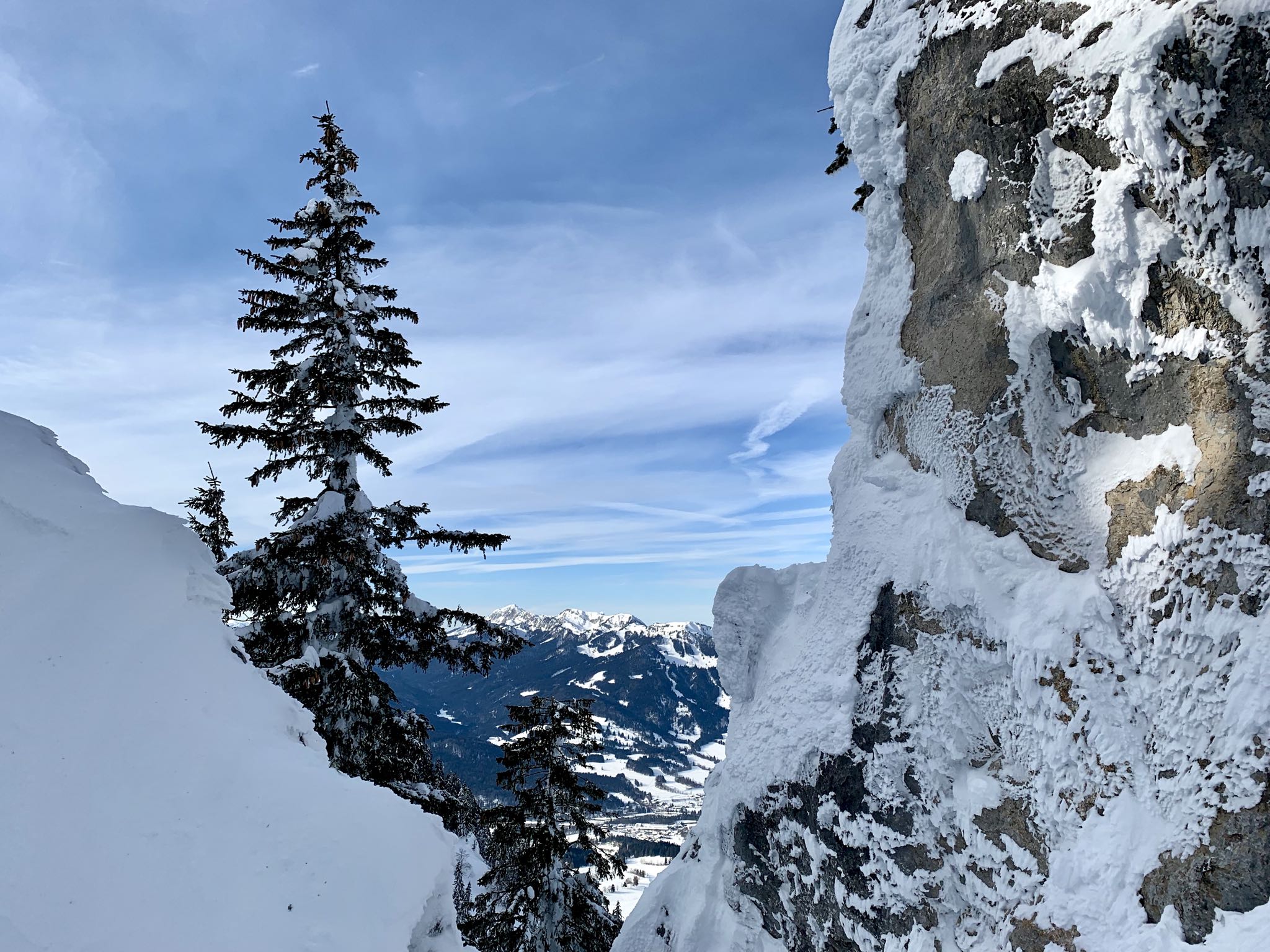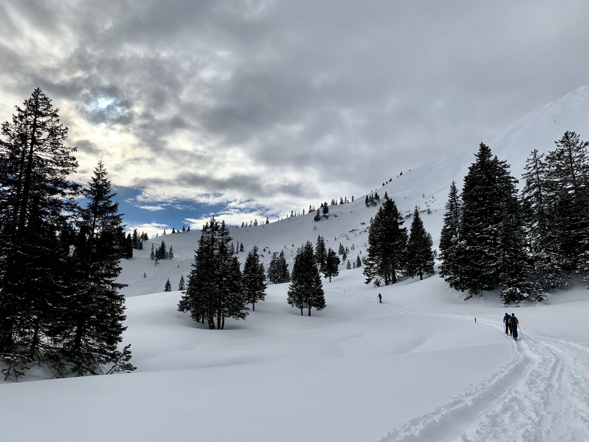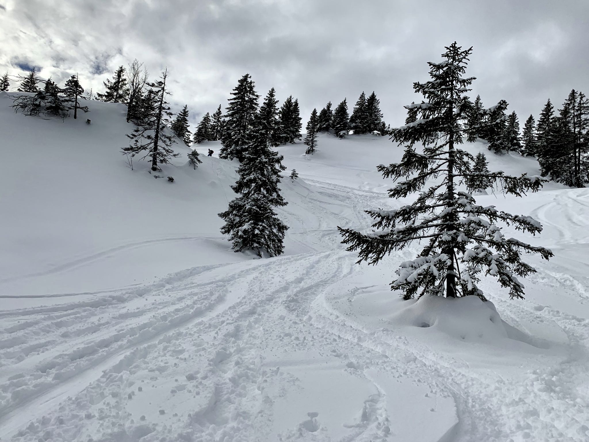 Tourenverhältnisse: -11°C, Strasse bis Lasseln geräumt, im Aufstieg zum Mariaeck unter den Bäumen harschig, Alpel pistenmäßig eingefahren, Schönberg zerfahren, östl. Mariaeck feiner Pulver fast spurlos, runter zur Rauhalm mit sporadischem Deckel, N-Hang vom Seekarkreuz unterhalb der Waldgrenze noch sehr gut zu fahren (oberhalb verblasen), unterhalb der Seekarstrasse dann schon schwerer Schnee