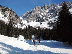 Runter 100m Richtung S, dann Richtung WSW steil auf den Schöntalsee (2120m) zu, auf 2000m dann Richtung NW zwischen Schöntalsee und Schöntalalm (2113m) auf die Jagglfeldalm (1891m) zu. Diese bleibt links liegen und es geht Richtung N über idealgeneigte Hänge an der Hocheggalm (1699m) vorbei. Auf 1580m schließlich die Bärentalstrasse Richtung SW zur Langer Grund Ache hinab. Dieser talauswärts folgend flach an der Martl Erlau Alm (1328m) vorbei zurück zum Ausgangspunkt.