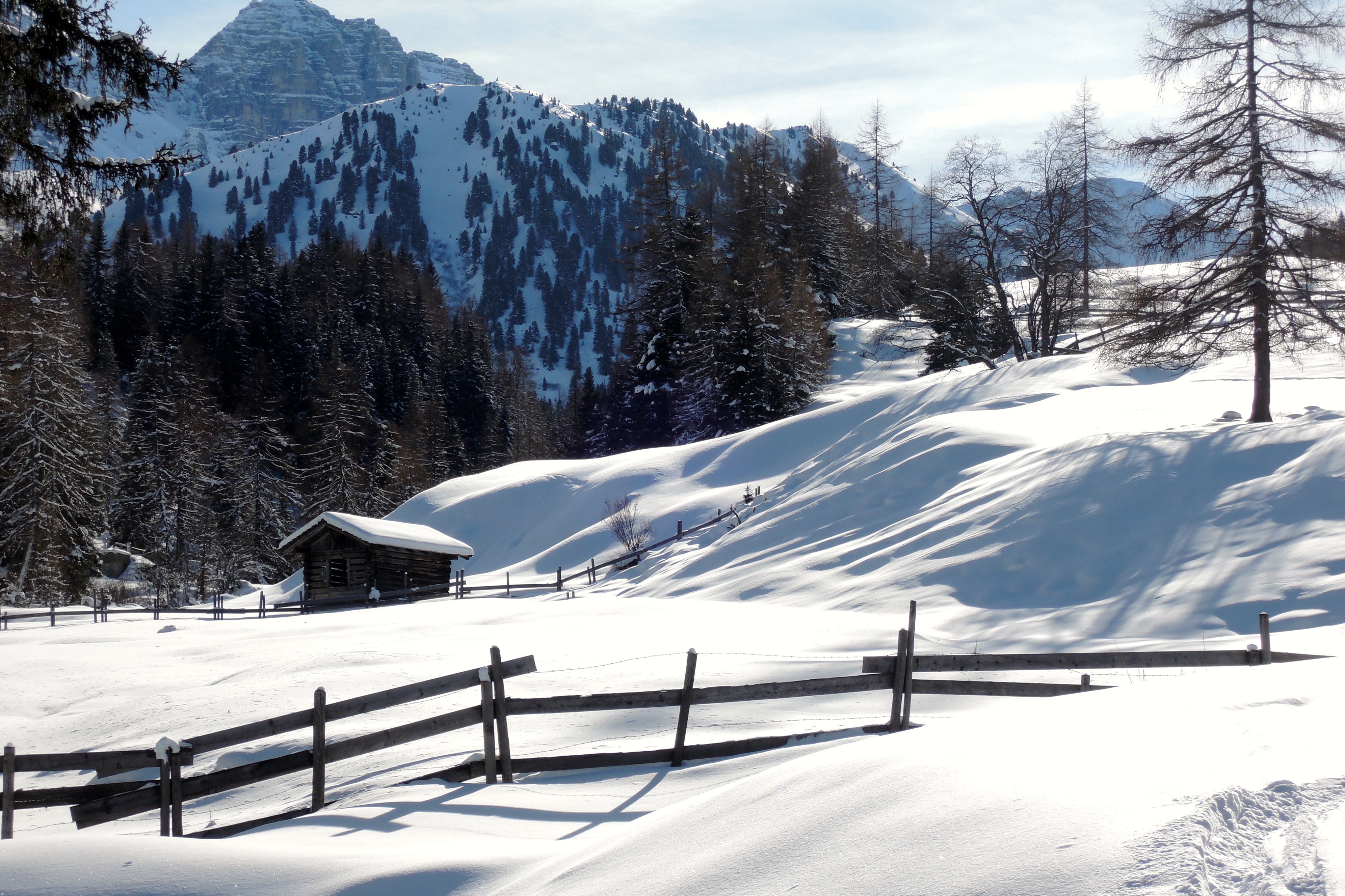 Sonstiges: Der Wirt empfiehlt die Zehnerspitze mit Schneeschuhen bzw. Bergstiefeln. So sei es :). Also von der Lavarellahütte (2050m) Richtung N den Hang hinauf und Richtung W weiter über die Kleine Fanesalpe (2200m). Sobald das Castel de Fanes (2657m) in NO liegt, Richtung NW direkt auf die Zehnerspitze (3026m) zu, zuletzt in etlichen Spitzkehren bis unter den felsigen Gipfelaufbau, dort nochmals kurz nach W queren und das Skidepot (3000m) ist erreicht. Leider kommt gerade ein Schwung Leute den kurzen Klettersteig vom Gipfel herunter, so dass wir bei -18°C nicht länger warten, sondern absteigen.