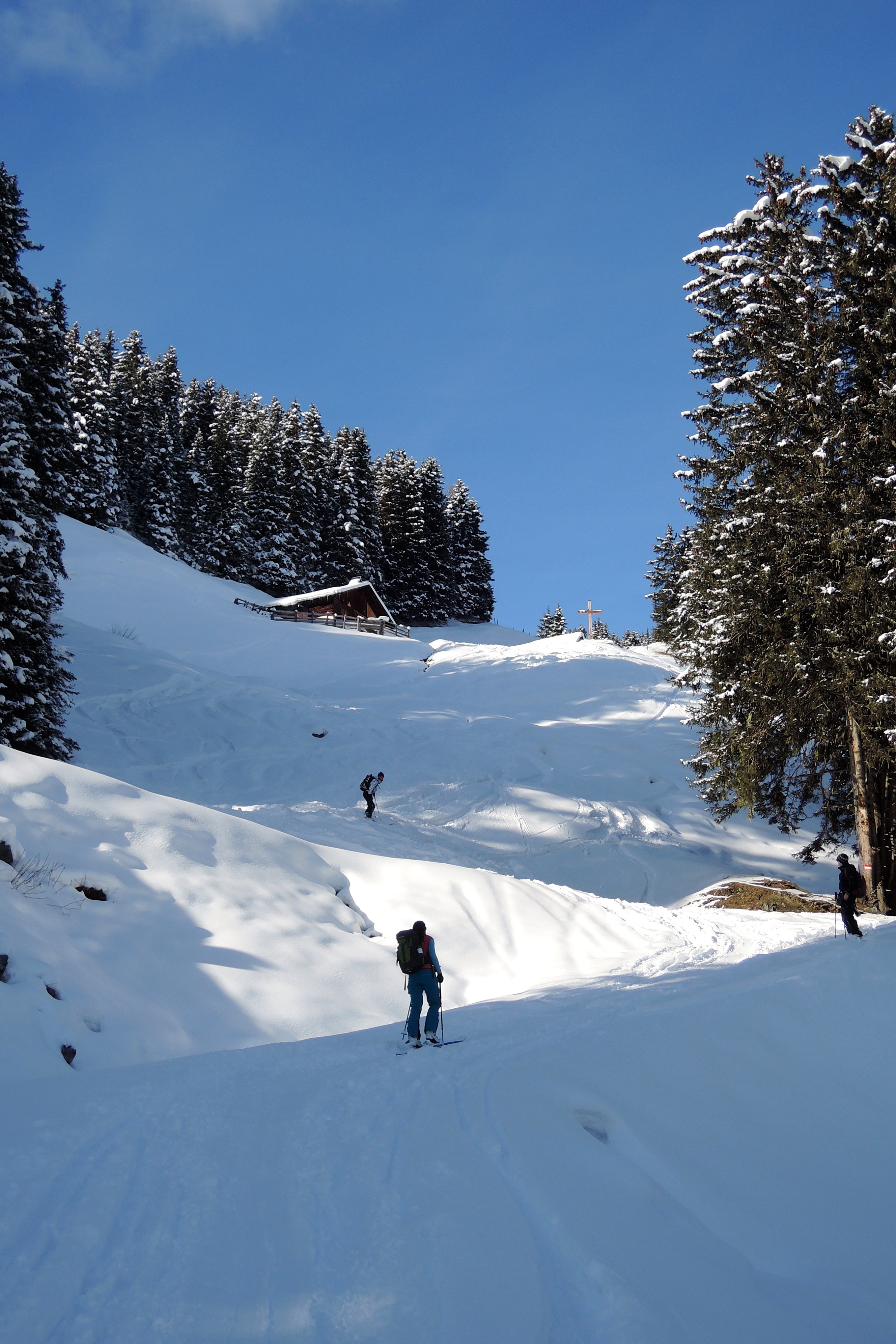 Tourenverhältnisse: Im Wald gute Bedingungen im Aufstieg, präparierte Pisten 1a, Hornabfahrt abgeschrubbt