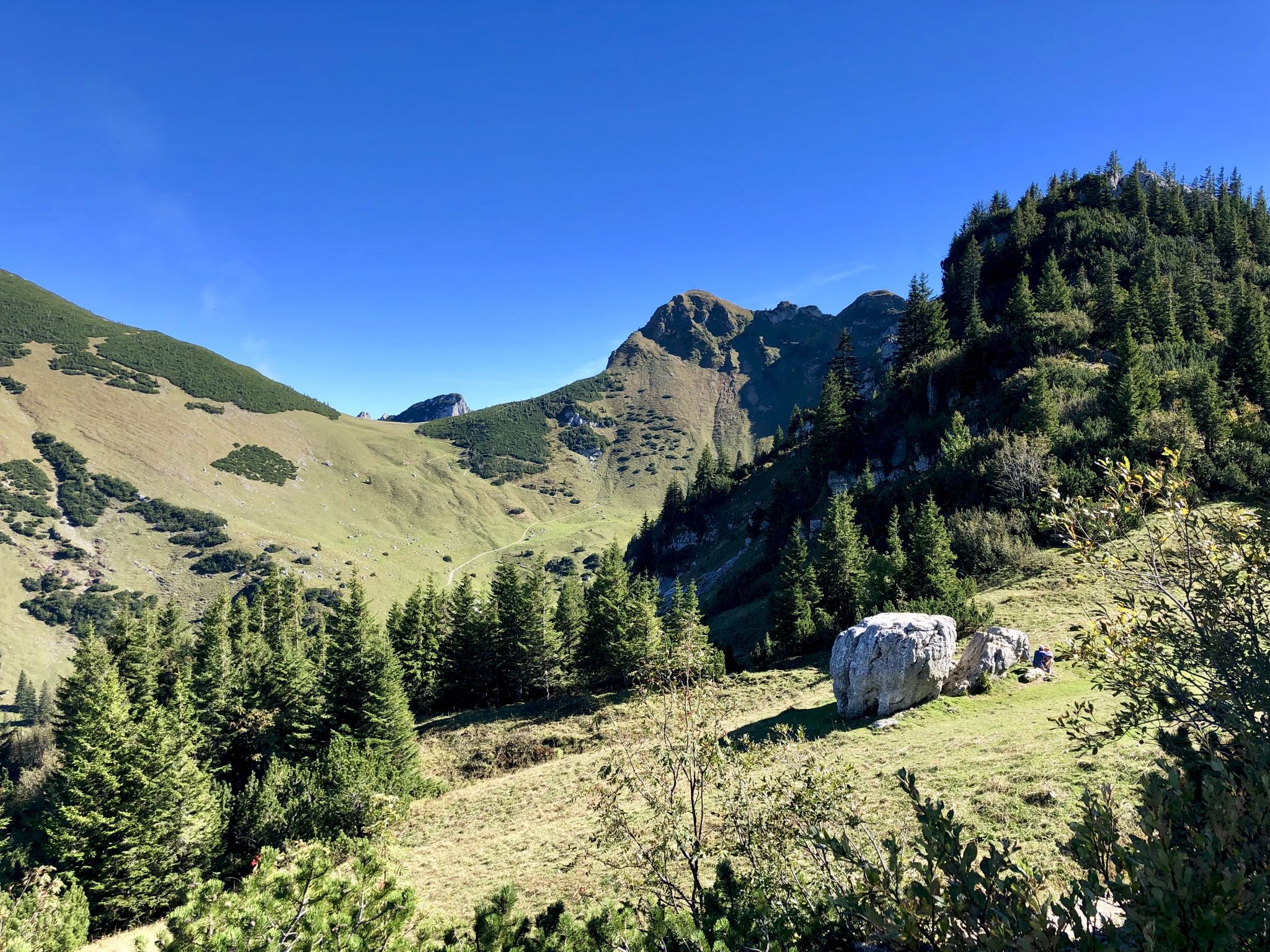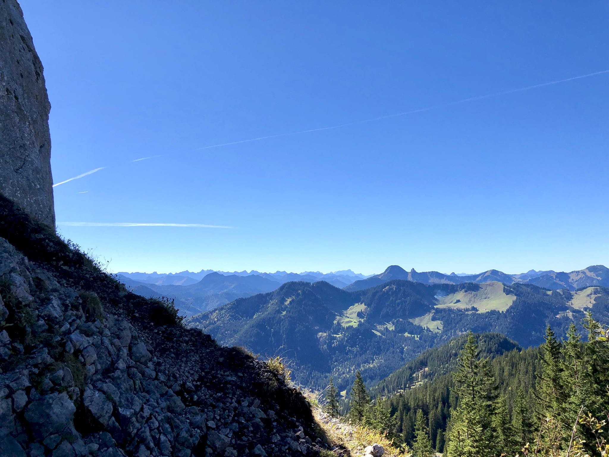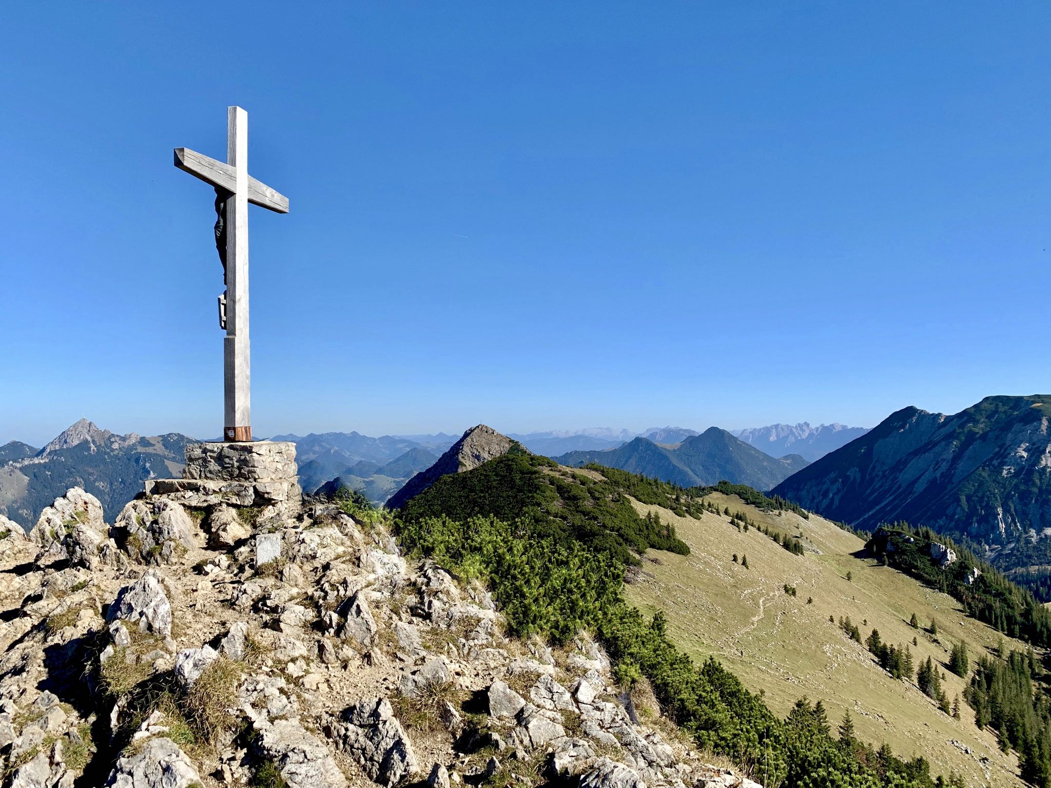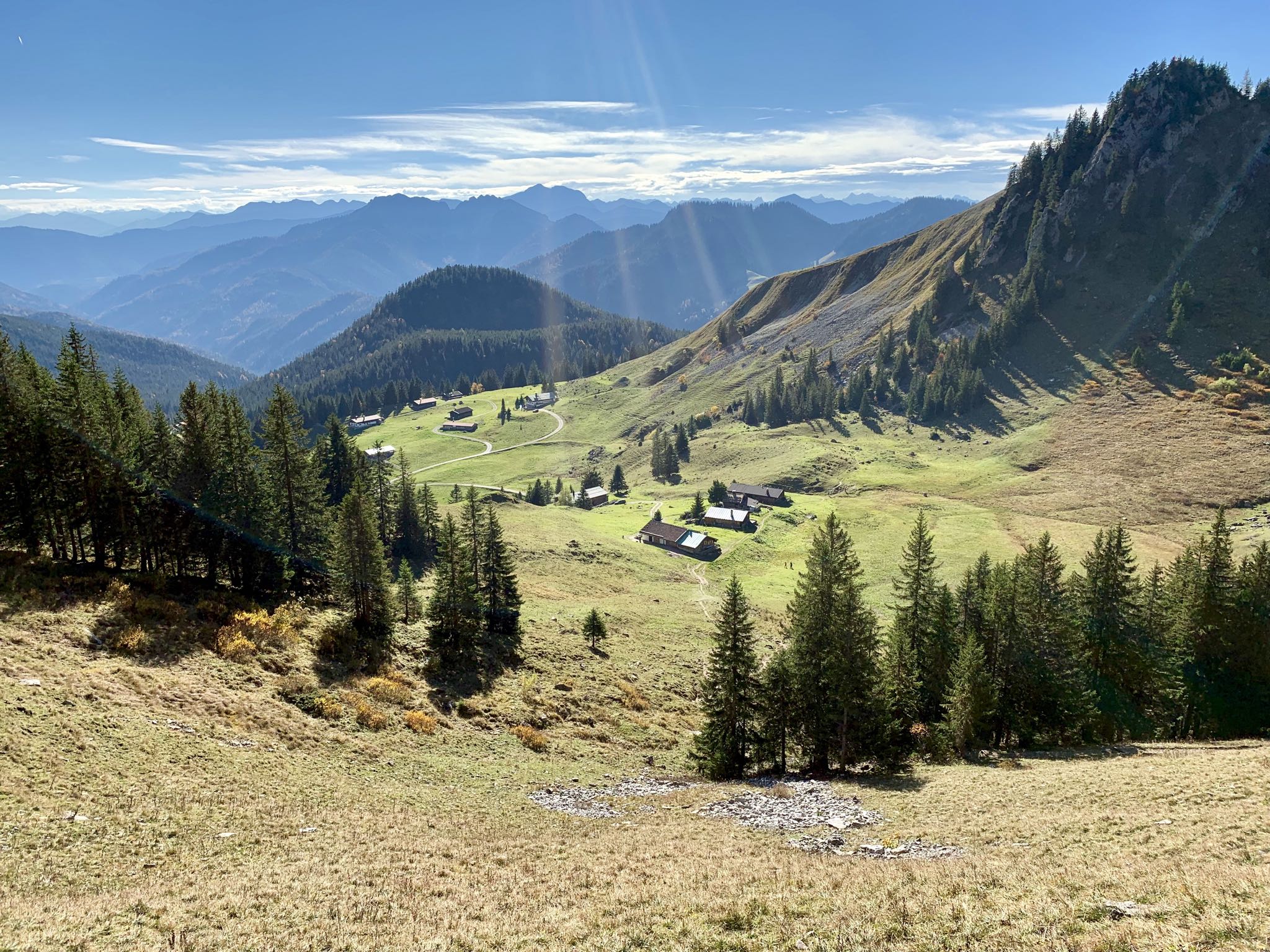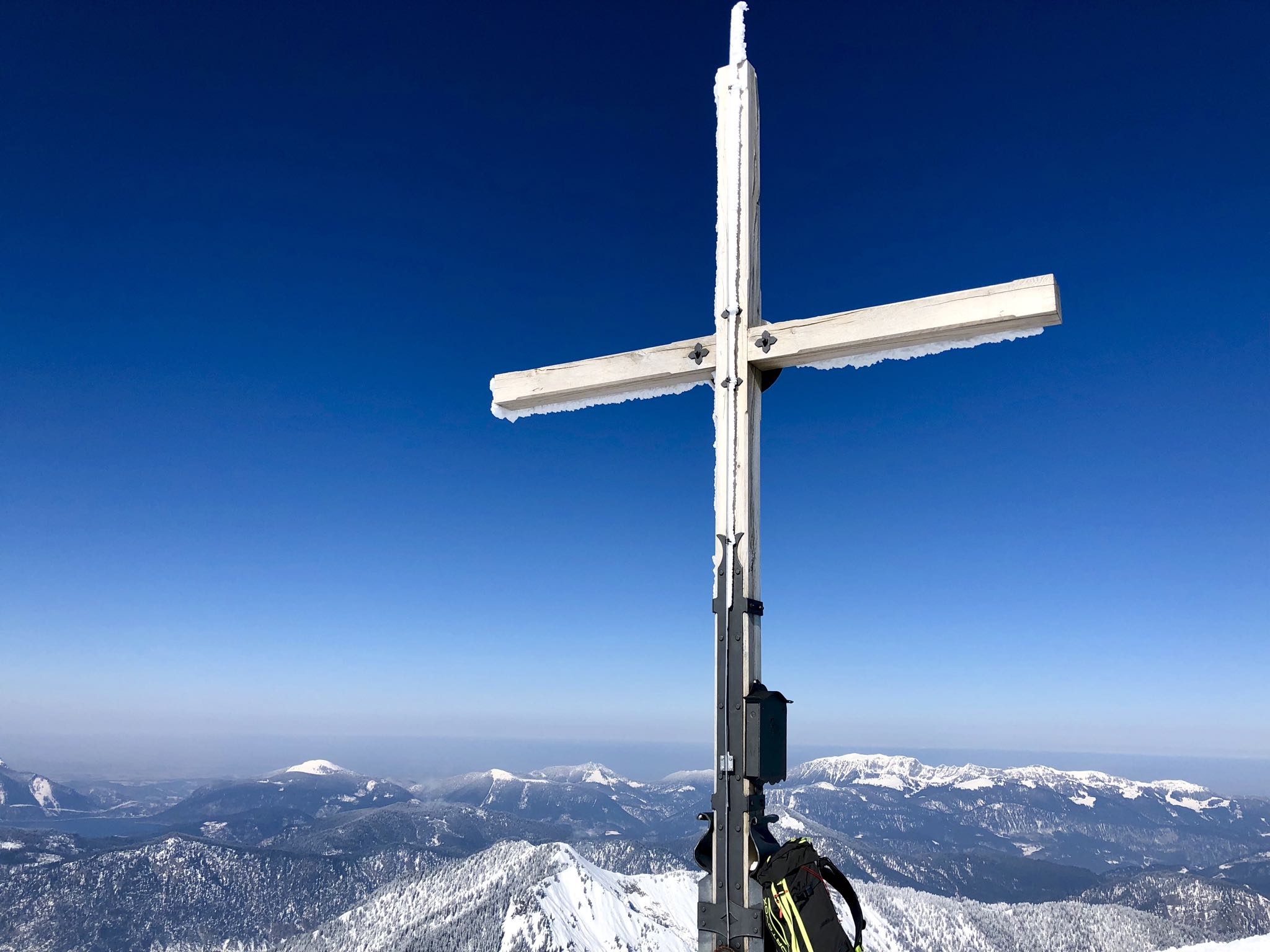 Sonstiges: Vom PP (5 €) am Spitzingsattel (1130m) beim Omnibuswendeplatz auf die Wiese und auf dem Pfad stets in Richtung NNO in den Wald hinein. Der Pfad verliert sich bald zu einer schmalen Pfadspur, aber nach 1km in immer derselben Richtung quert auf 1100m der 642er. Auf diesem felsigen Wanderweg geht es zügig, aber nicht zu steil durch etliche Kehren Richtung OSO, zuletzt Richtung SSW hinauf in den Kessel unterhalb des Jägerkamp. Dort links zur Jägerbauernalm (1540m) und diese links liegen lassend Richtung NO sausteil zum Nordgrat hinauf und diesem folgend durch die Latschen zum hölzernen Gipfelkreuz des Jägerkamp (1745m) hinauf. Von dort Richtung SO unterm Benzigspitz leicht abschüssig querend zum Wegekreuz und ab hier auf dem 643er Richtung SW zur Oberen Schönfeldalm (1450m) und weiter zur Unteren Schönfeldalm mit der Schönfeldhütte (1410m) hinab. An dieser rechts vorbei und in einem weiten Rechtsbogen zuletzt Richtung NW zum 644er hinab (1300m). Auf diesem in den Wald hinein und über Stock und ganz viel Stein bergab. An der Wiese oberhalb des Sattels darf die Konzentration nachlassen, in wenigen Minuten ist der Ausgangspunkt erreicht.