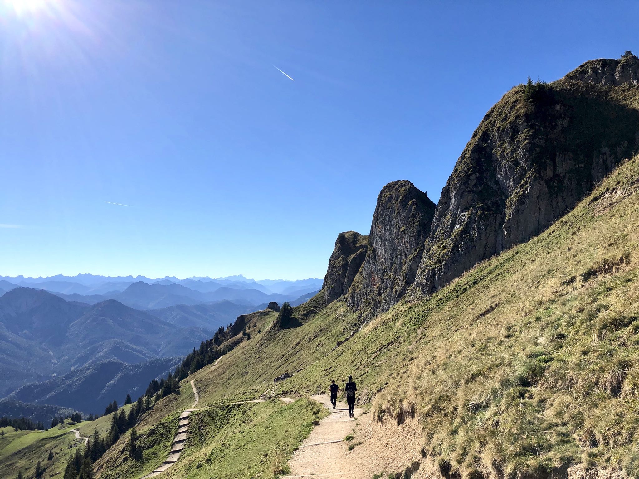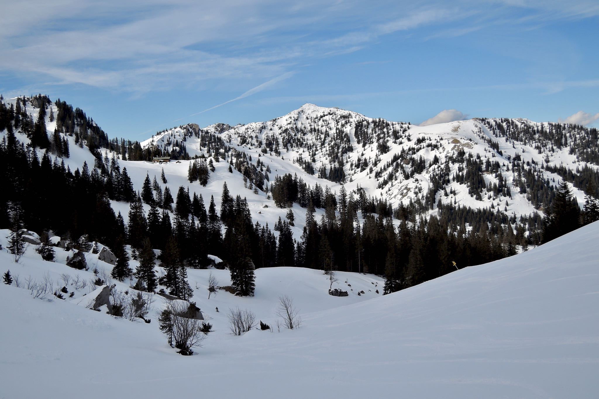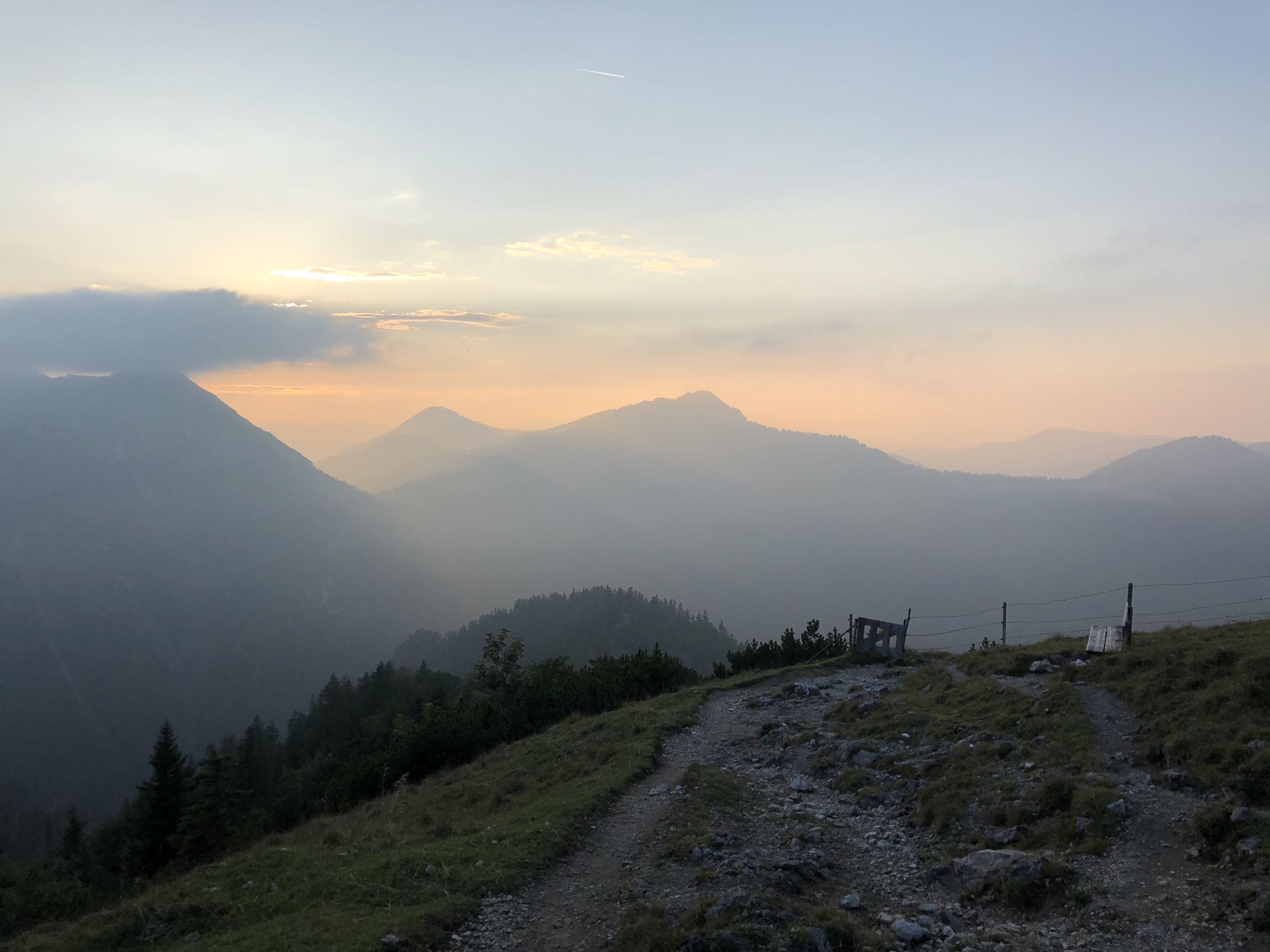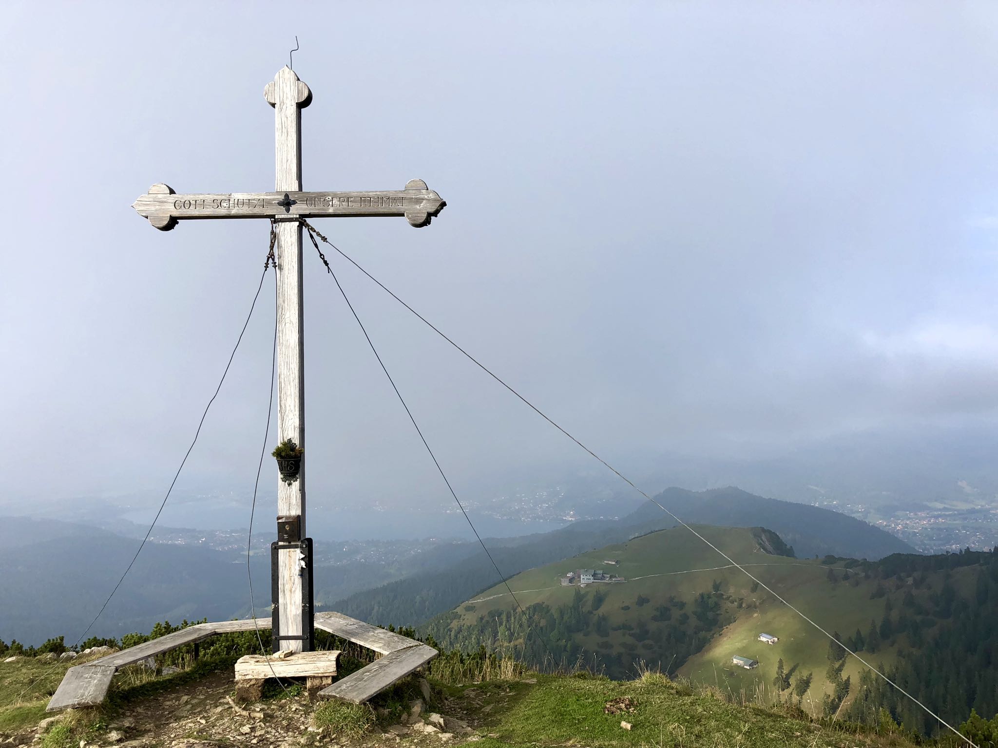 Sonstiges: Vom PP (5 €) am Spitzingsattel (1130m) beim Omnibuswendeplatz auf die Wiese und auf dem Pfad stets in Richtung NNO in den Wald hinein. Der Pfad verliert sich bald zu einer schmalen Pfadspur, aber nach 1km in immer derselben Richtung quert auf 1100m der 642er. Auf diesem felsigen Wanderweg geht es zügig, aber nicht zu steil durch etliche Kehren Richtung OSO, zuletzt Richtung SSW hinauf in den Kessel unterhalb des Jägerkamp. Dort links zur Jägerbauernalm (1540m) und diese links liegen lassend Richtung NO sausteil zum Nordgrat hinauf und diesem folgend durch die Latschen zum hölzernen Gipfelkreuz des Jägerkamp (1745m) hinauf. Von dort Richtung SO unterm Benzigspitz leicht abschüssig querend zum Wegekreuz und ab hier auf dem 643er Richtung SW zur Oberen Schönfeldalm (1450m) und weiter zur Unteren Schönfeldalm mit der Schönfeldhütte (1410m) hinab. An dieser rechts vorbei und in einem weiten Rechtsbogen zuletzt Richtung NW zum 644er hinab (1300m). Auf diesem in den Wald hinein und über Stock und ganz viel Stein bergab. An der Wiese oberhalb des Sattels darf die Konzentration nachlassen, in wenigen Minuten ist der Ausgangspunkt erreicht.