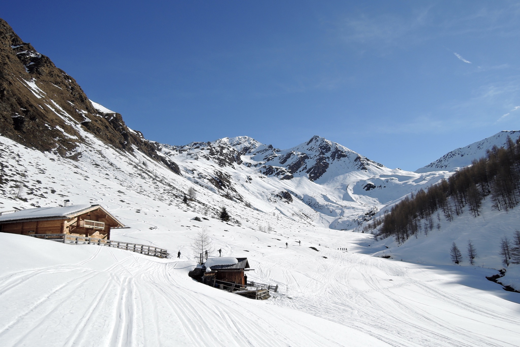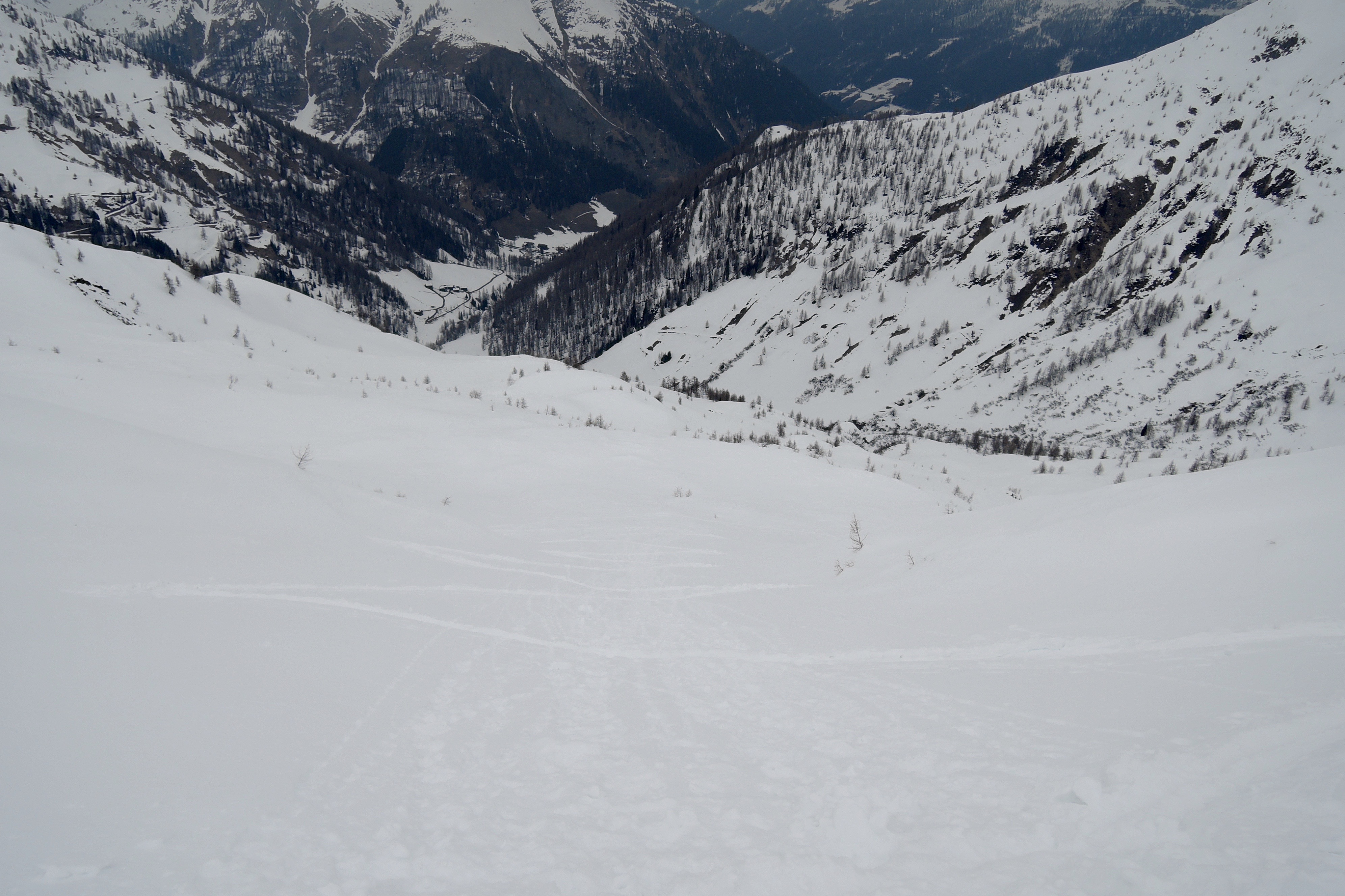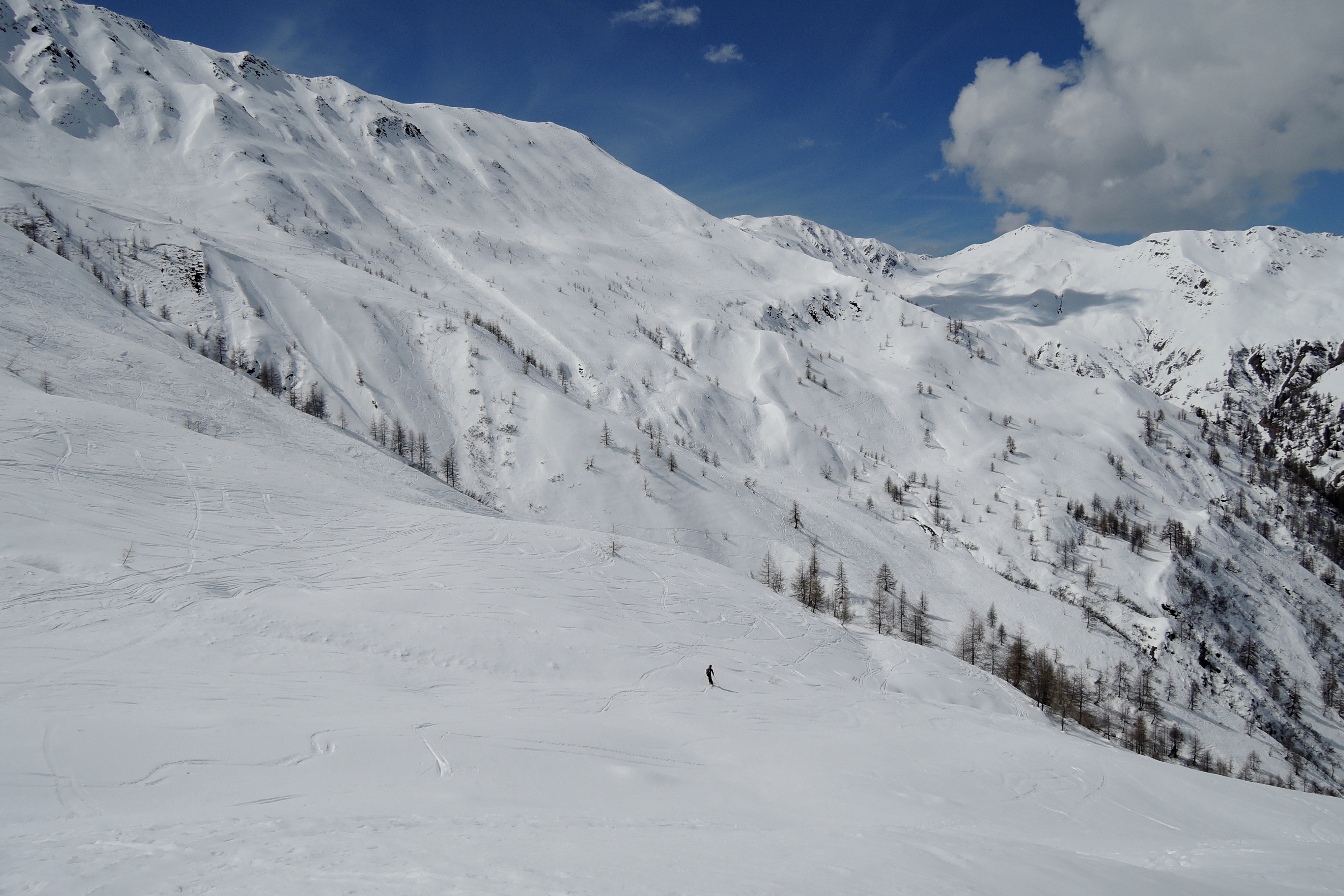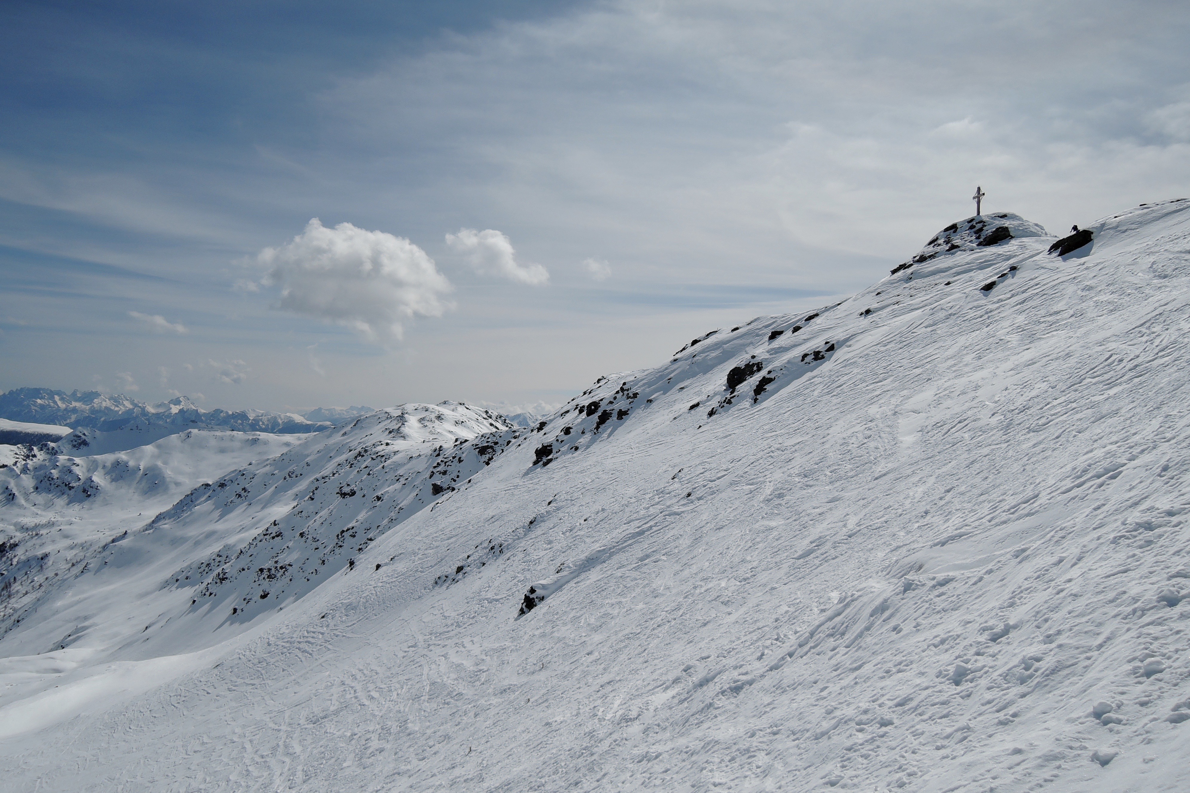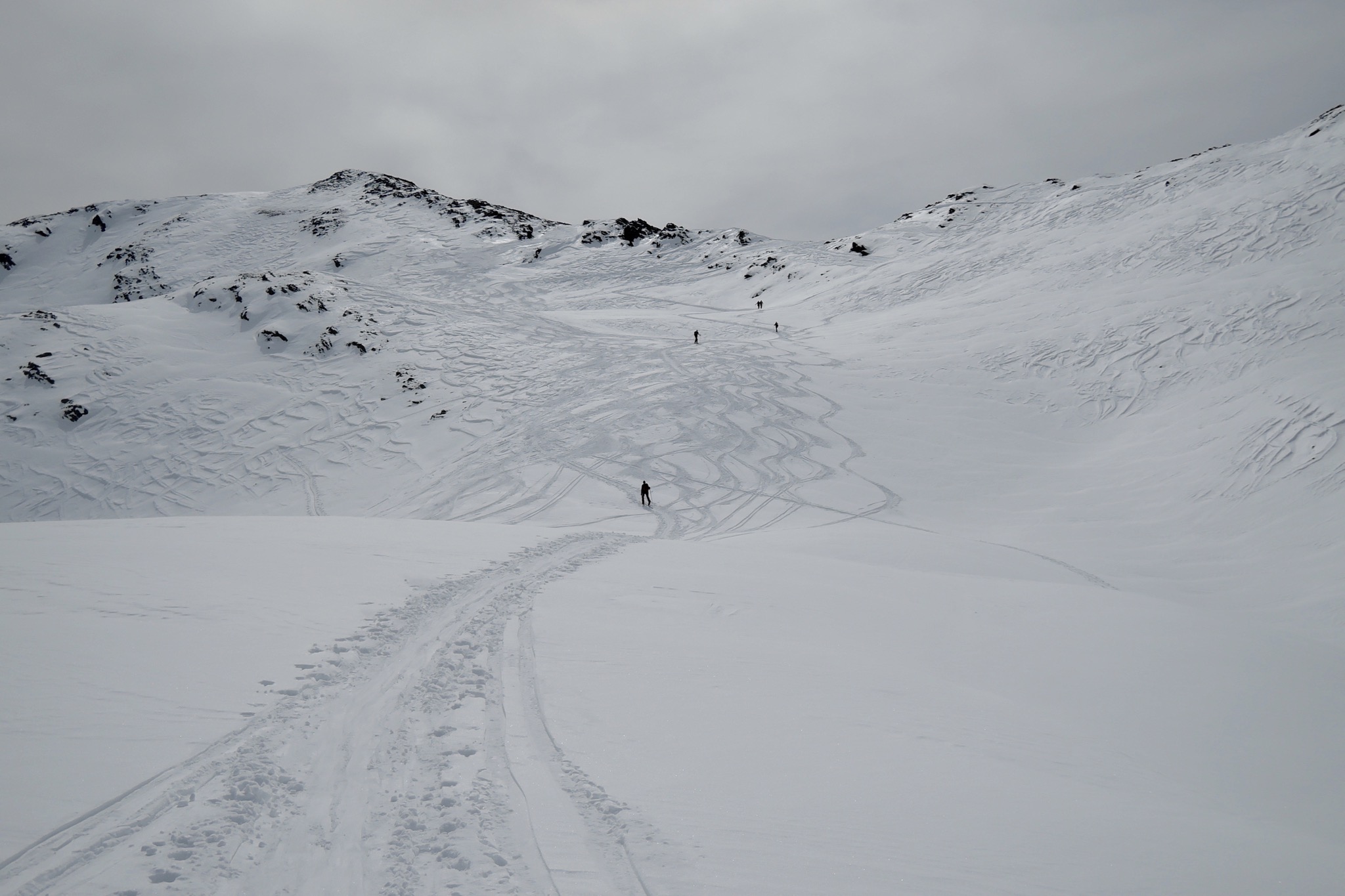 Tourenverhältnisse: Auf der Fahrstrasse bereits ausreichend Schnee (3 Unterbrechungen), ab der Schmidhofalm schaftseitig Pulver oder leicht gepresst. In der Abfahrt Variationen von Pulver, tragfähigem Harsch, Firn und Sulz.
