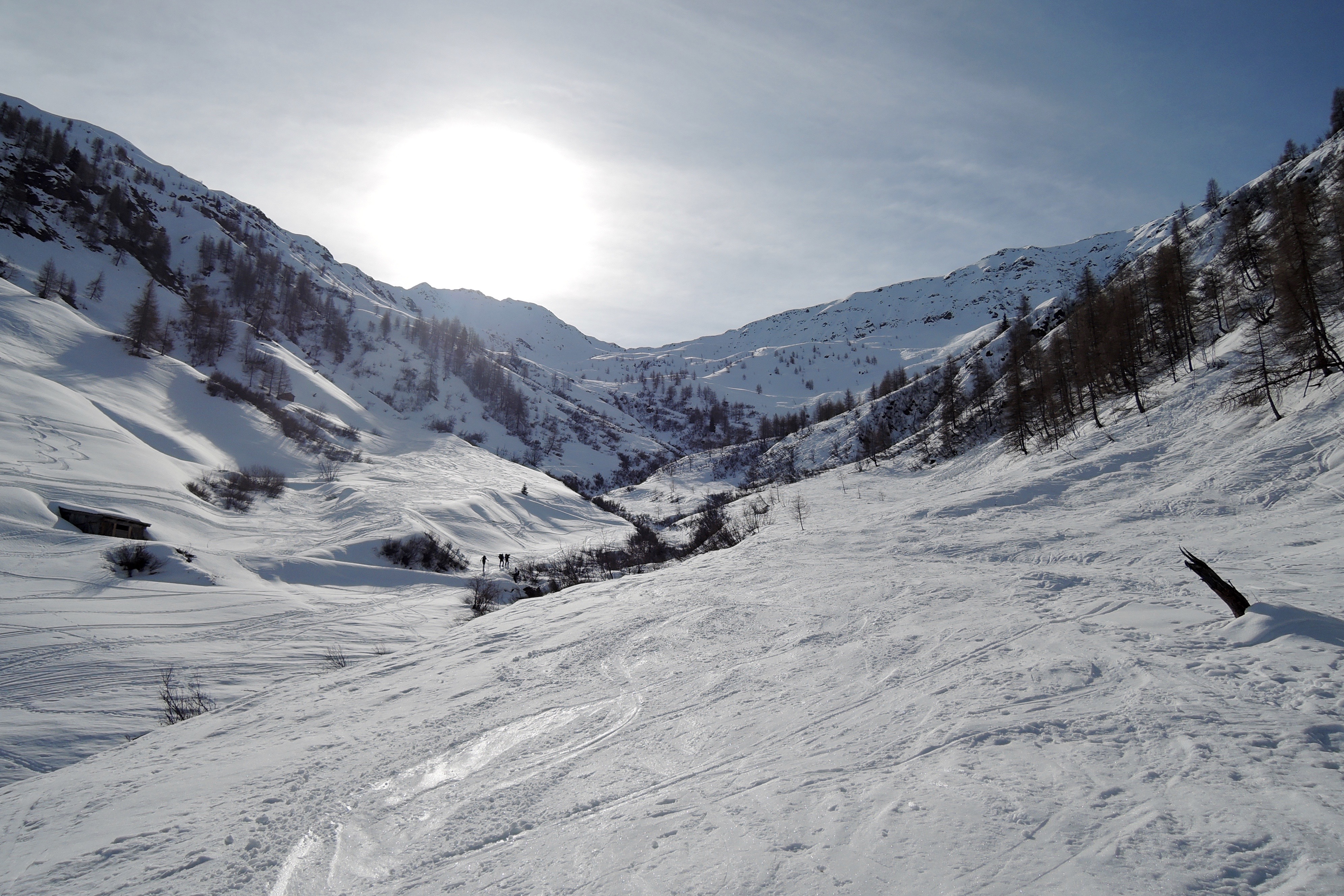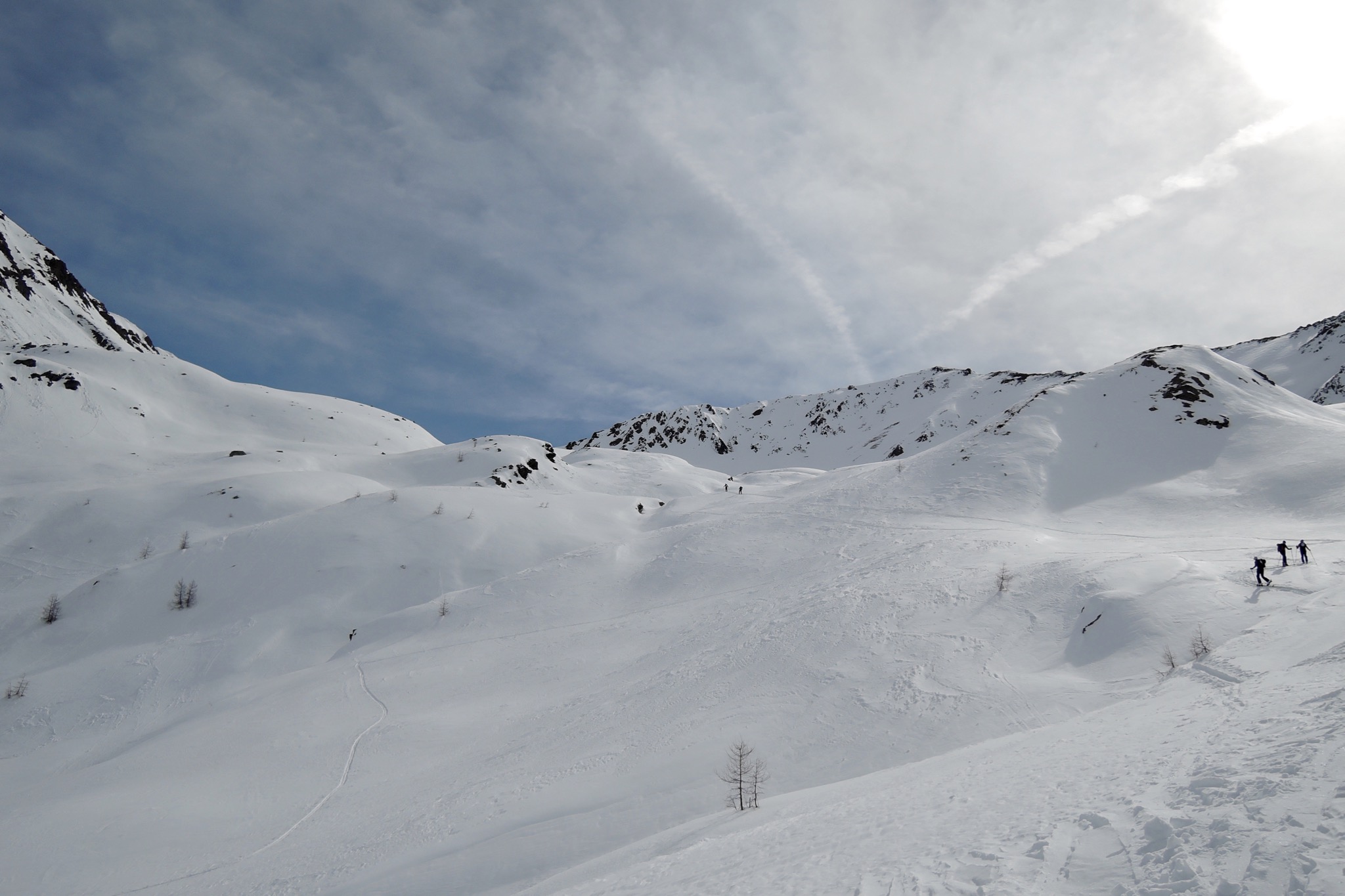 Tourenverhältnisse: Unten 15, oben 25cm lockerer Schnee, der sich insb. nachmittags unten ordentlich setzt und schwer wird. Anhaltende Grundberührungen, Steinski oder gute Nerven ;-) Auf der Webcam sieht es besser aus, als es in der Abfahrt dann ist...