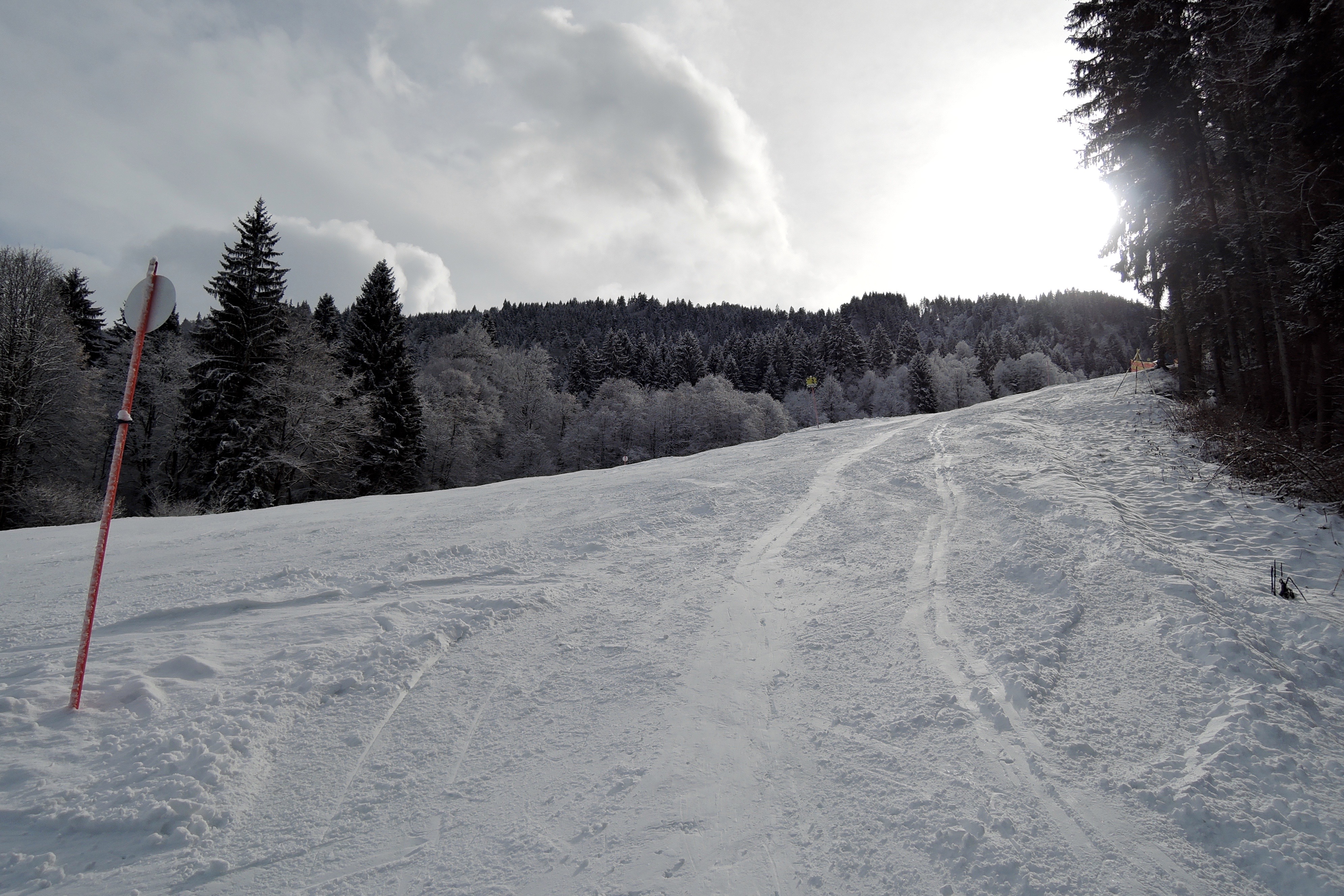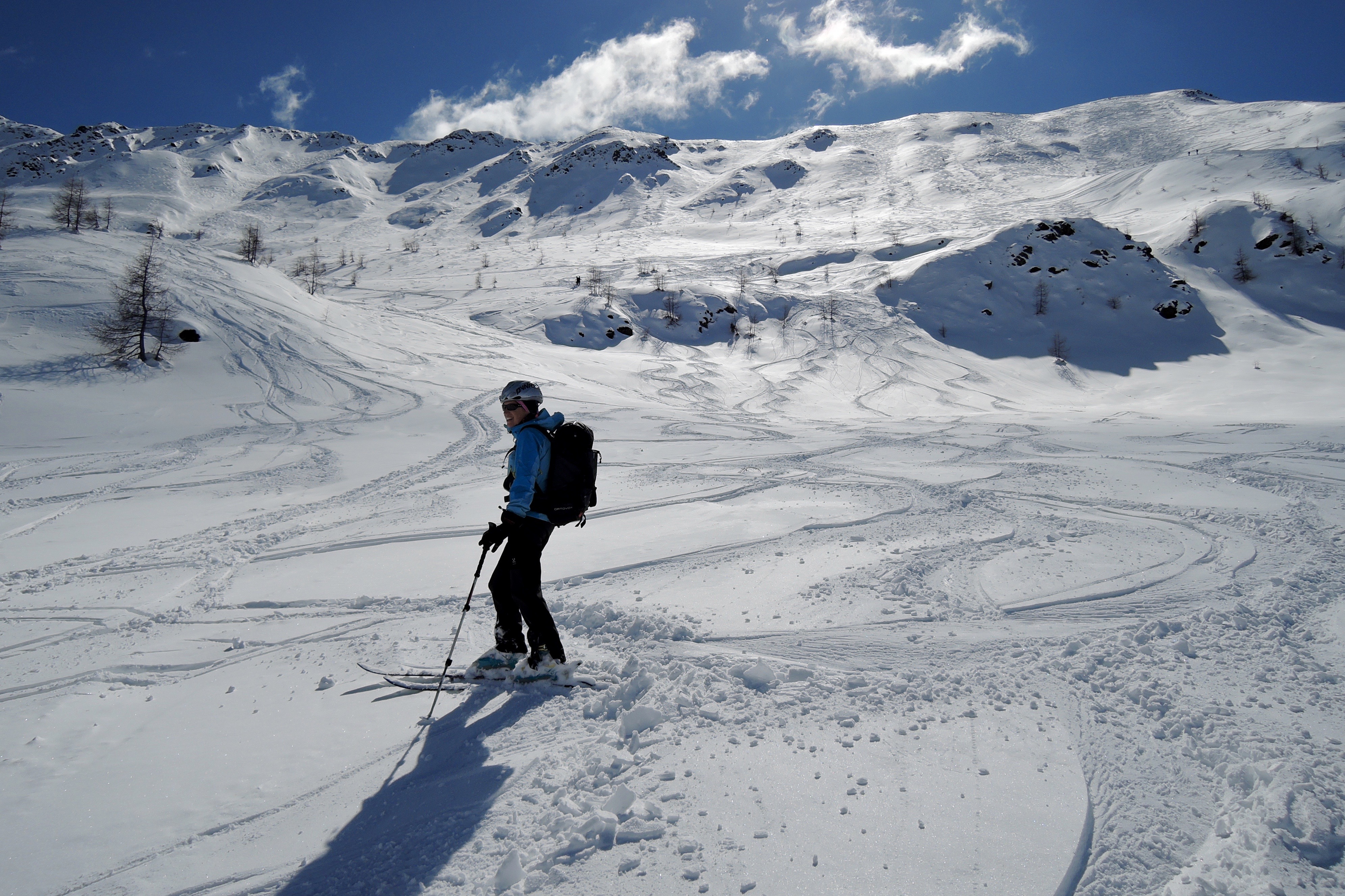 Tourenverhältnisse: Oben 25cm Pulver, sonnseitig ganz leichter Deckel, luvseitig Sharks, Pisten griffig, Hornabfahrt sehr schön griffig