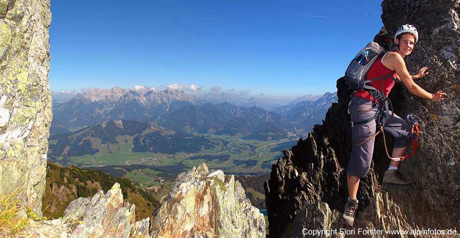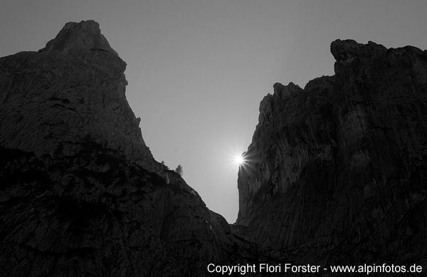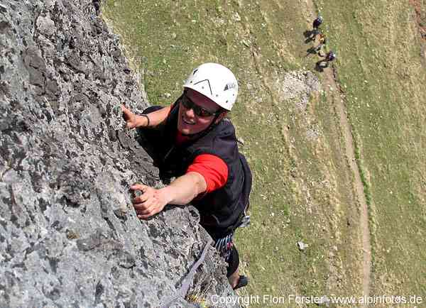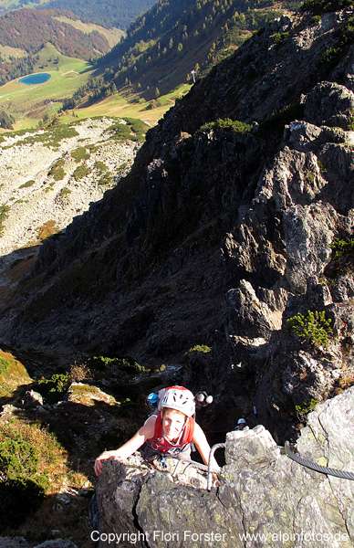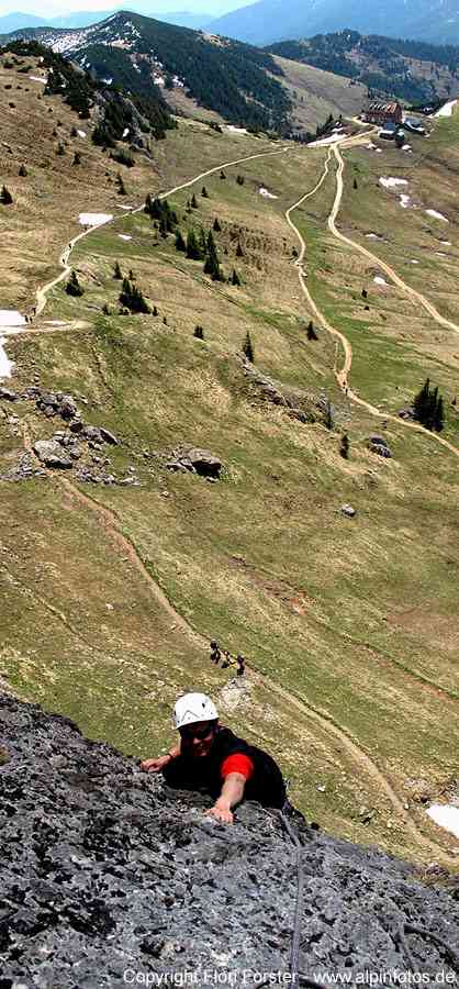 Am Samstag vom Jagerwirt 900m Zustieg über Wasserfall ins Schneekar 1800m, Einstieg links vom Sonnenpfeiler am Sonneck. In 15 SL, meist der Gratkante entlang, auf die Kopfkraxen. Eine Stelle 4-, sonst überwiegend 3 und 2, gut mit BH abgesichert, weiter oben dann Sicherung an Felsköpfeln. Schöne Kletterei, im leichteren Gelände etwas brüchig. Abstieg über Normalweg zurück zum Jagerwirt. Alles trocken, auch Blue Moon und Via Romantica trocken und begangen.