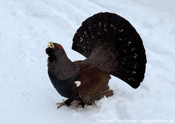 Heute Vormittag übers Breitenbachtal auf den Lahnenkopf. Viele Leute unterwegs, Hang schon ziemlich zerfahren. Kurios: Auf der Fahrstraße kam mir ein balzender Auerhahn über den Weg, der ganz schön angriffslustig war, als er über meine Skier lief....