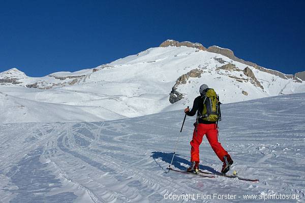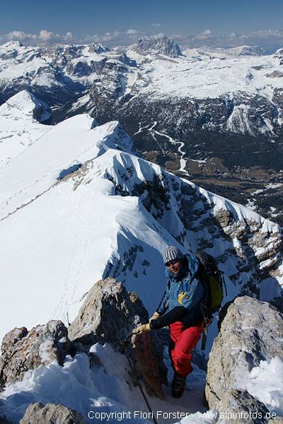 Nach angenehmer Nacht im Zelt um kurz nach 5 Uhr von Pederü Richtung Fanes gestartet. (Naja, die ersten 100Hm sind wir versehentlich Richtung Seekofel gegangen...) In Pistenraupenspur bei wolkenlosem Wetter gemütlich zur Lavarellahütte, von dort weiter zur Zehnerspitze, zuletzt über netten Klettersteig zum Gipfel, 4 1/4 Std. Kurz vor 11 Uhr Abfahrt, hätte heute locker eine Stunde später sein können, es war sehr kalt und es firnte trotz SO-Seite sehr spät auf, bis nach Pederü. Hier auch noch recht viel Schnee, vor allem abe den Faneshütten. Traumhaftes Wetter!