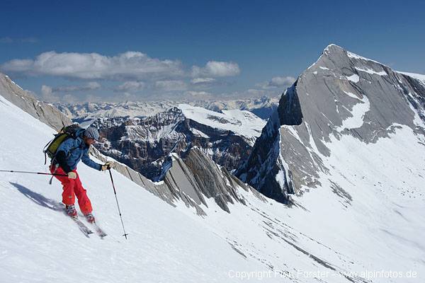 Alleine am Freitag noch zum Schlegeis, nach kurzer Nacht am Samstag um 1 Uhr mit Fahrrad am See entlang bis zur Materiallseilbahn. 15 Min zu Fuß über Blockwerk, dann ab 2000m mit Ski bis 2300m, 100m über steile Rinne zu Fuß, dann wieder mit Ski aufs Schlegeiskees und weiter bis zum Einstieg auf 3150m, Schnee gut gefroren. Bei Sonnenaufgang über den Bergschrund, dann in sehr gutem Trittschnee, teils pulvrig, teils leichter Deckel, trotz Spurarbeit in 1 Std. bis zum Ausstieg. In 10 Min über schönen Firngrat zum Gipfel. 5 3/4 Std. ab Schlegeis. Traumhafte Fernsicht! Knapp 2 Std. das Alleinsein genossen und gewartet, bis ein Einheimischer aus der Wand war, dann Abfahrt über die Wand bei guten Verhältnissen, sehr eindrucksvoller Tiefblick! Weiter übers Schlegeiskees bei Traumfirn und über Rinne mit eindrucksvollen Schneemäulern in den Talboden und bis zum Ende des Schnees auf 2000m. Zu Fuß und mit dem Rad zurück zum Auto, insg. 10 Std. Wenig los, ausser dem Einheimischen (fuhr die Wand ab Hälfte ab) sind nur noch 2 Leute durch die Wand, 2 weitere sind am Einstieg umgedreht. Wand geht noch länger, Bergschrund könnte aber bald Probleme machen.