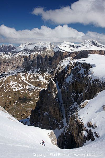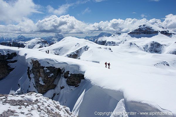 Am Pfingstsamstag vom Grödner Joch ab Auto mit Ski durch das Val Culea auf den Piz dai Ciamorces 2999m, alles mit Ski machbar. Abfahrt über Val Setus in bestem Firn, nur die Querung zum Grödner Joch war schon sehr weich. Sonne und Wolken, noch viel Schnee in den Dolomiten, nordseitig ab etwa 1900m geschlossene Schneedecke.