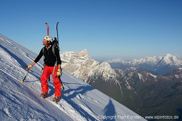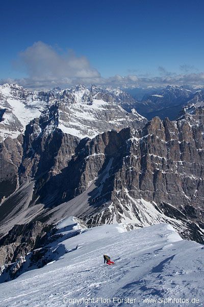Nach der Tour in der Sella abends bei Gewitterregen Auffahrt bis zum Rifugio Scotter 1580m, dort gezeltet. Um 3 Uhr über die Forcella Piccola ins Antelao Nordkar, über enge Rinne, flacheren Absatz und wieder steile Rinne auf die Lasties Bänder. Über diese bis zum Skidepot auf 3100m, alles komplett zu Fuß super gehbar. Weiter über sehr ausgestzten Grat, steile Gipfelflanke und ausgesetzte Querung zum Gipfel 5 1/4 Std. Abstieg zum Skidepot Abfahrt über die Lasties Bänder hart, aber griffig. Obere harte Rinne 100m zu Fuß abgestiegen, wurde aber auch befahren, dann wieder auf Ski steil durch enge Rinne, dann auf super Firn bis zur Forcella Piccola. Auf Lawinenschnee Abfahrt bis auf 1660m. Top Verhältnisse, oben noch sehr viel Schnee. Eine TRAUMTOUR zum Saisonabschluss!