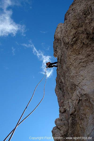2. Tag: Bei frostigen Temperaturen Aufstieg ins Gartl, der See bei der Gartlhütte war teils schon eingefroren. In der Sonne war es aber dann angenehm warm, und so waren wir bald in DER gemässigten Dolomitentour schlechthin, der Delagokante am Delagoturm. Diese bietet sehr luftige Kletterei (500m Luft unterm A...) direkt an der Kante, mit IV+ auch nicht gerade leicht bewertet, Standplätze alle gebohrt und ausreichend Zwischenhaken vorhanden. Es folgte dann 6x20m Abseilen, anfangs auch sehr luftig, bis zum Einstieg. Für meine Freundin war es die erste alpine Klettertour überhaupt, ein schöner Einstand also. Sind anschließend noch kurz zum Santnerpass rauf, dann Abstieg zurück zur Vajoletthütte.