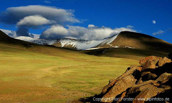Von unserem Basislager auf einer schönen Wiese mit traumhaften Blick auf die Weiten Changtangs bestiegen wir den 6270m hohen "Wild Donkey Peak" (2.Besteigung), technisch zwar einfach, aber fast 1100Hm in dieser Höhe und teils sehr lockeres Geröll forderten unsere Kondition. Unser Hochlager errichteten wir dann auf 5500m, um von dort aus unser Hauptziel, den 6541m hohen anzugehen. Nach einer extrem warmen Nacht (plus 9 Grad auf 5500m!) starteten Uli und ich am 26. Juli bei wechselhaftem Wetter. Über Blockgelände erreichten wir auf 5700m den Chalung-Gletscher, dem wir ohne Steigeisen bis auf knapp 6000m folgten. Über Geröllgelände, zuletzt immer steiler und bei zunehmend schlechterem Wetter, stiegen wir über den Südgrat auf den Gipfel.