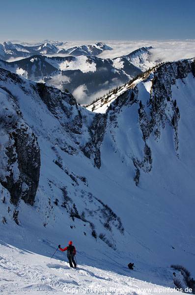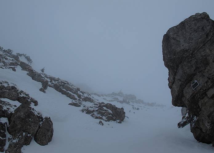 Heute Mittag über Lochgraben, Taubensteinsattel und um den Lämpersberg herum auf die Rotwand. Abfahrt über die NW-Rinne ins Kleintiefental. Einfahrt 40° griffig, im Mittelteil harte Querung 45°, dann guter Pulver. Aufstieg zu Taubensteinsattel und Abfahrt Lochgraben erstaunlich gut. Sonne pur, Nebel aber teilweise bis 1600m am Nachmittag.
