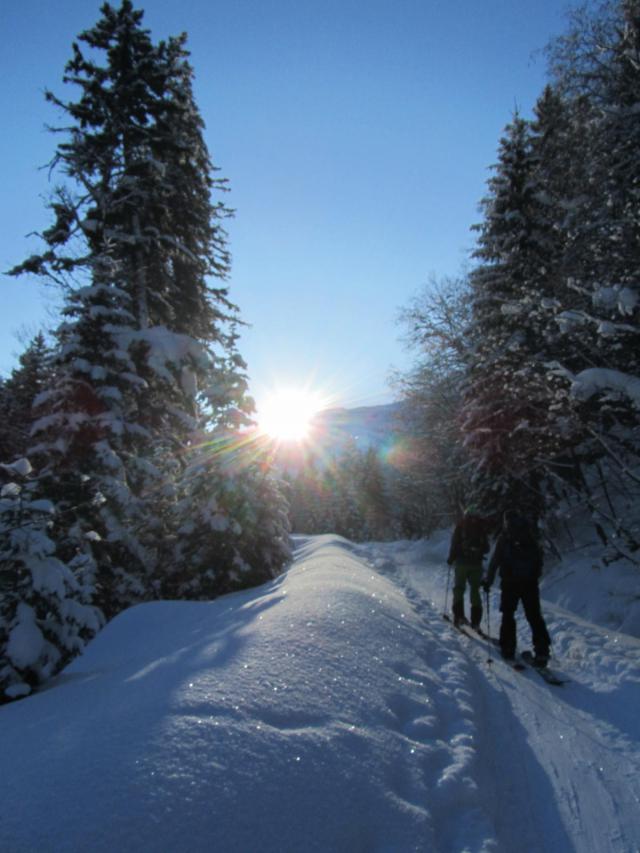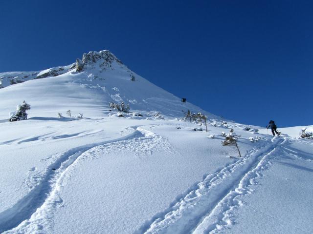 Tourenverhältnisse: Beste Bedingungen, und sehr viel Schnee im Wald! Denn Sommerweg bei ca 1140m nach rechts gegangen. Ab der Diensthütte war die Sicht sehr schlecht, und man konnte nur erahnen wo man ging, leichte Spuren waren noch zu sehen! Die Abfahrt war im oberen Drittel kein Genuss, weil absolut keine Sicht. Abfahrt durch den Wald ging gut, aber man musste auf Baumstumpfe aufpassen! Forststrasse war leider nicht gut zu fahren, da ein Traktor die letzten Tage gefahren ist, und es festgefroren ist!