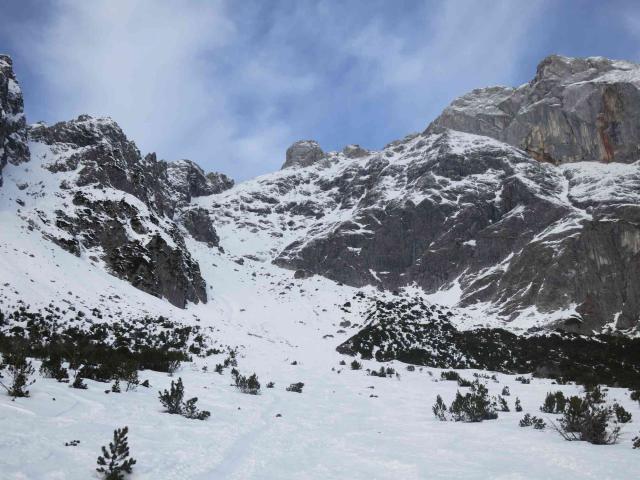 Die untersten Hänge nach der Bachquerung apern rasch aus, die Forststraße zur Koberalm hat eine gute, stabile Schneedecke.