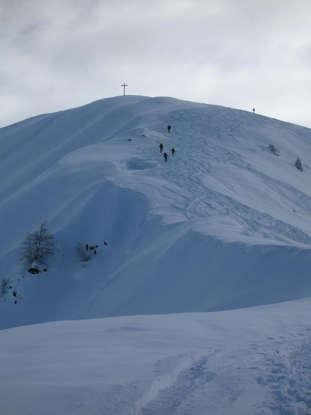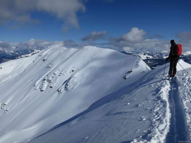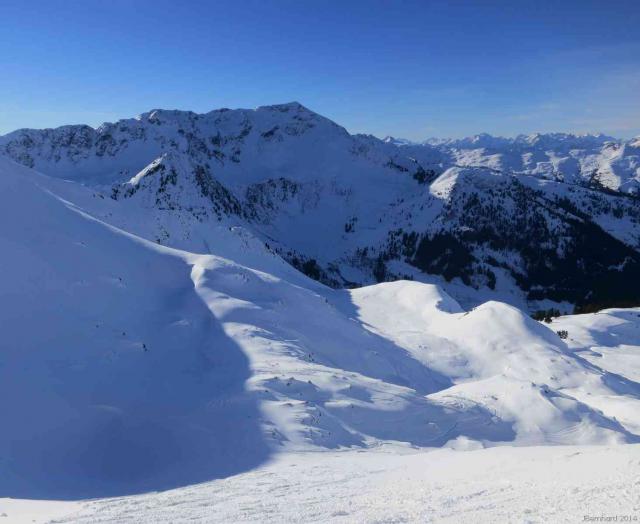 Tourenverhältnisse: Von der Koberalm bis um Gipfel herrlicher Pulver (15 - 35 cm) auf festem, aber zerspurtem Untergrund. Optimale Bedingungen, da windstill und klar. Der Nordhang des Breiteggern hat feinsten, lockeren Pulver.