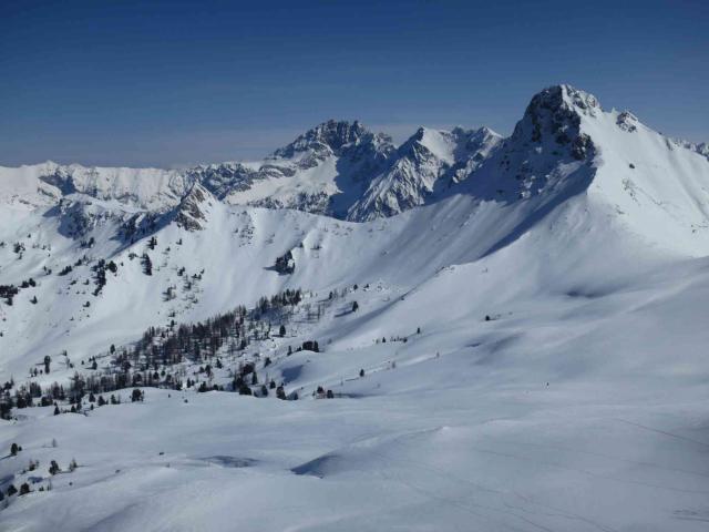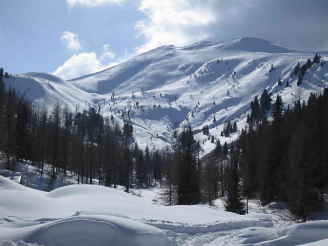 Gefahreneinschätzung: gering, da die Abfahrts-Route meist auf unpräparierten Pisten verläuft