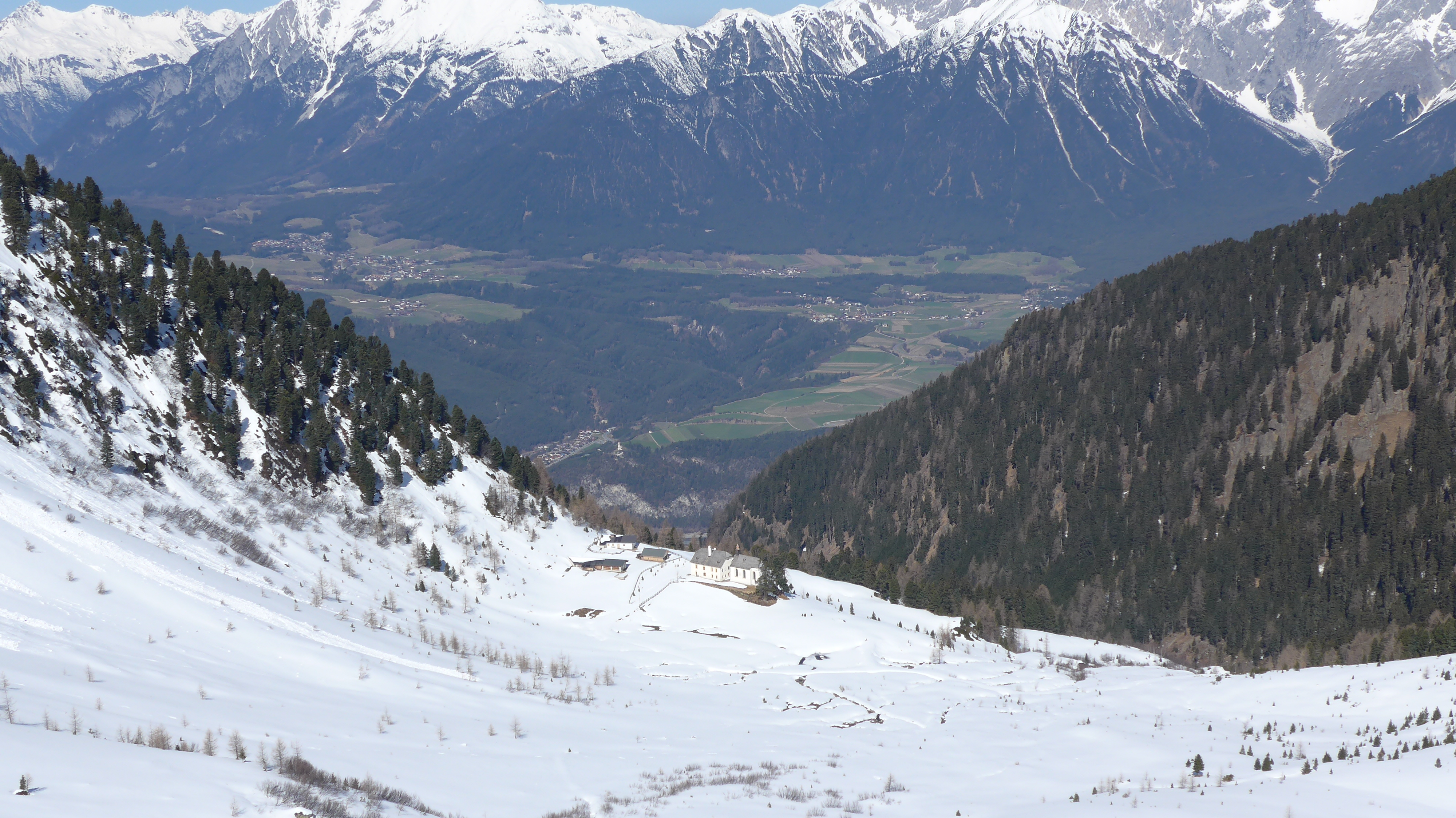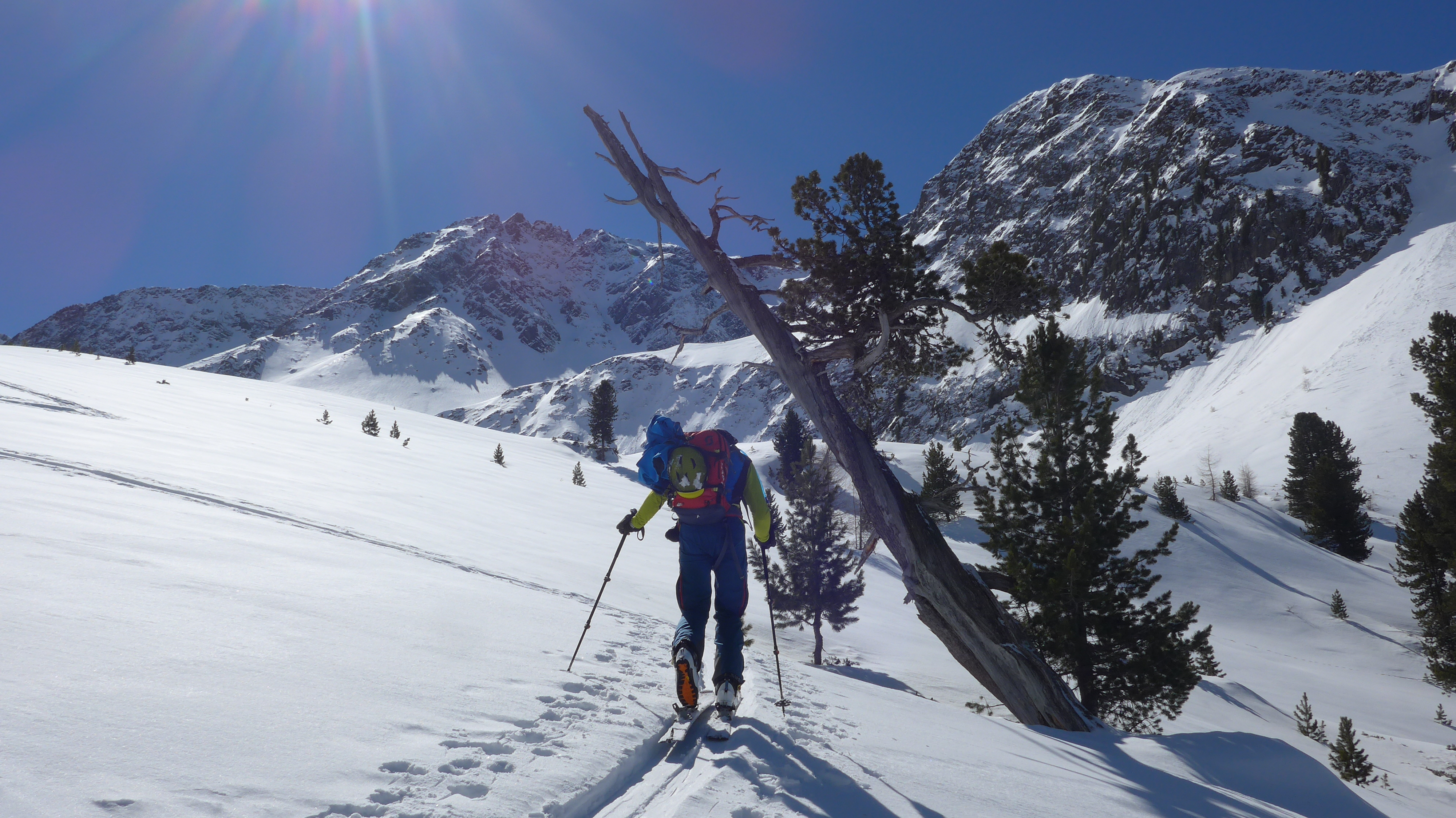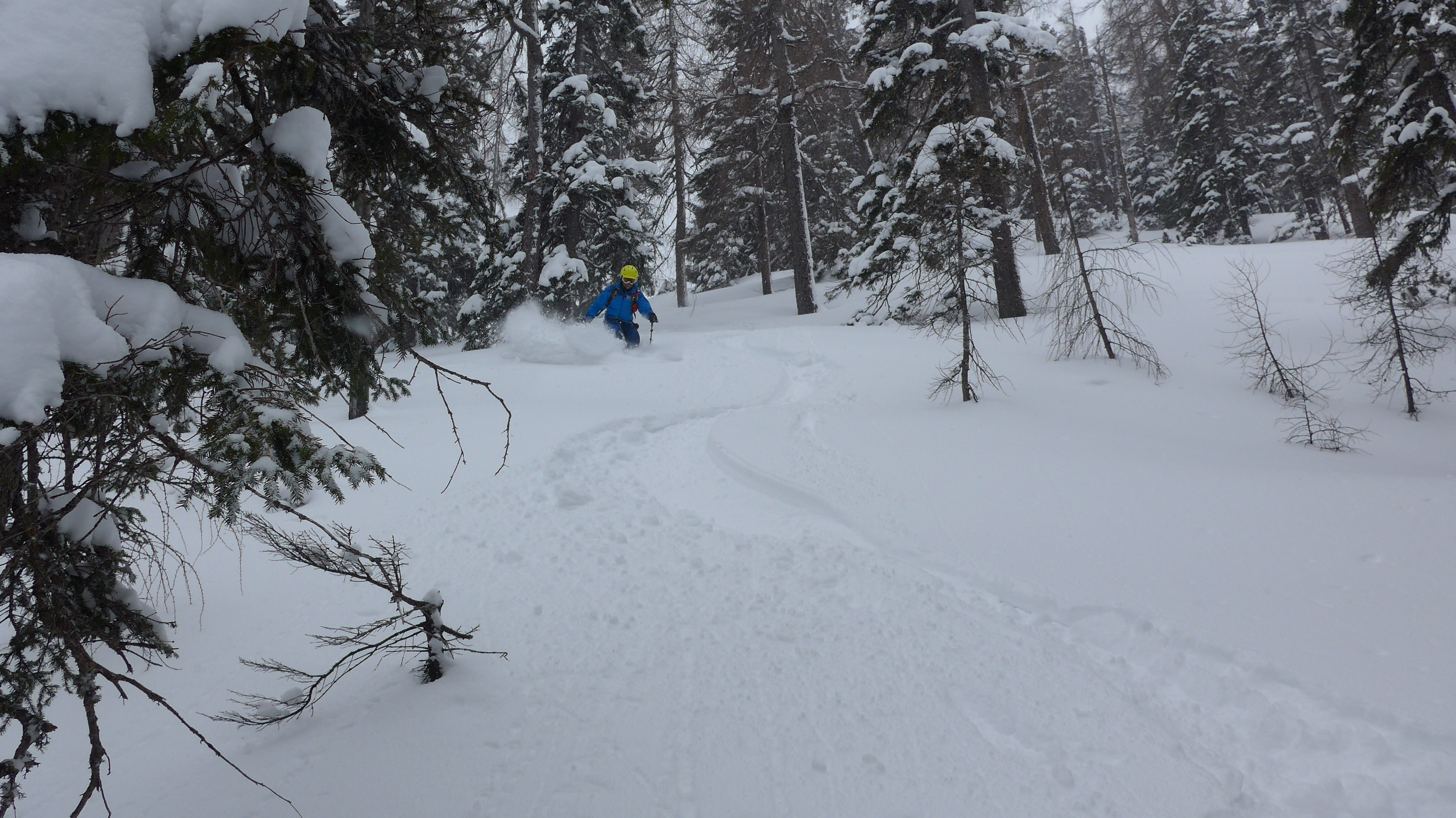Hier haben wir uns die eigentliche Etappe zur Salbithütte (im Winter Selbstversorger) erspart, weil 1 Stunde Abstieg + 1 Std. Essen kaufen + 1,5 h Ski tragen (aperer Süd Waldhang) uns dann doch unlohnend erschien.