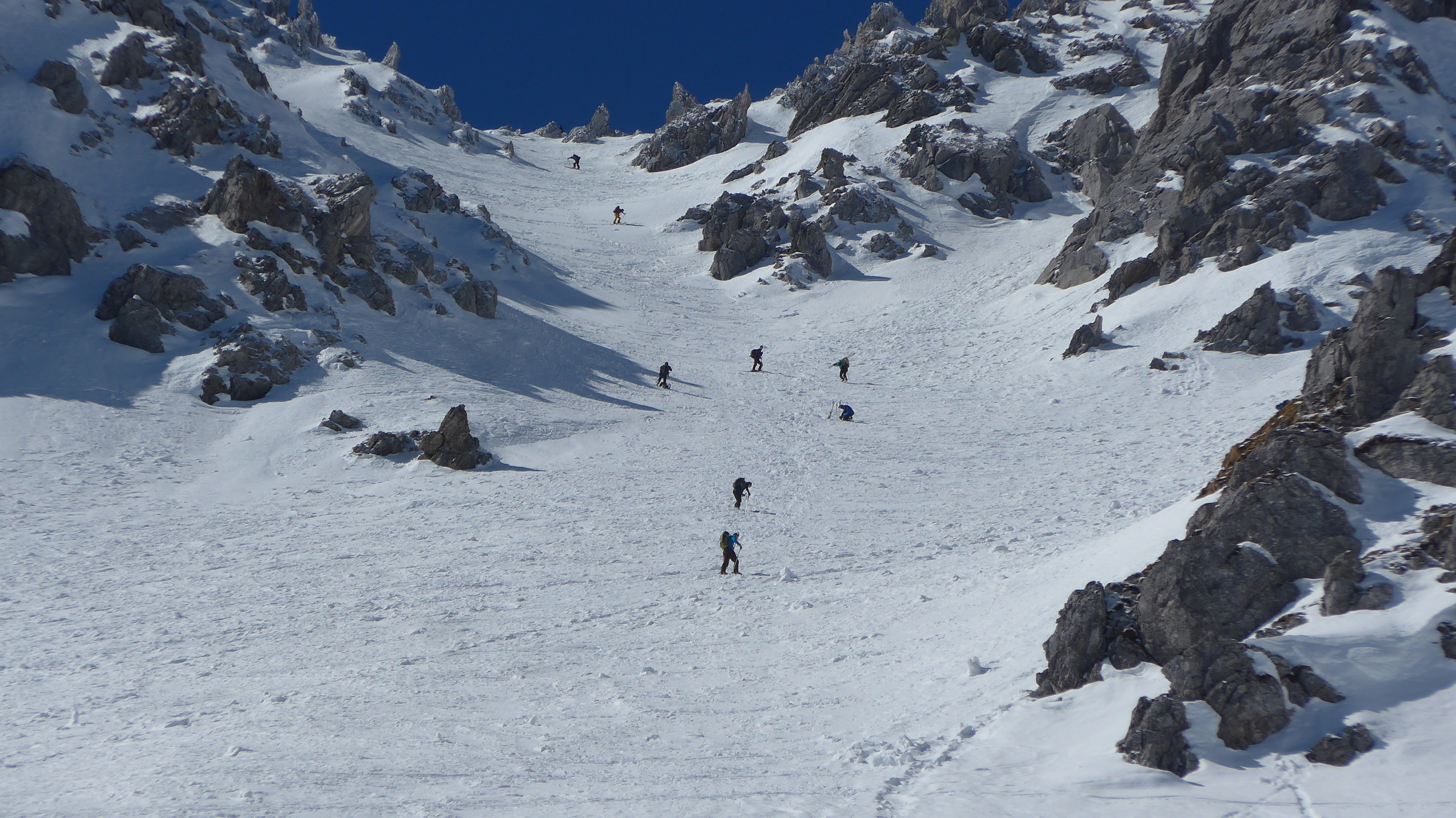 Wir haben uns für die Variante leicht abwärtsquerend nach Norden entschieden. 2 x Fixseil mit 50 m. > 42 ° felsdurchsetztes Gelände. Die eigentlich