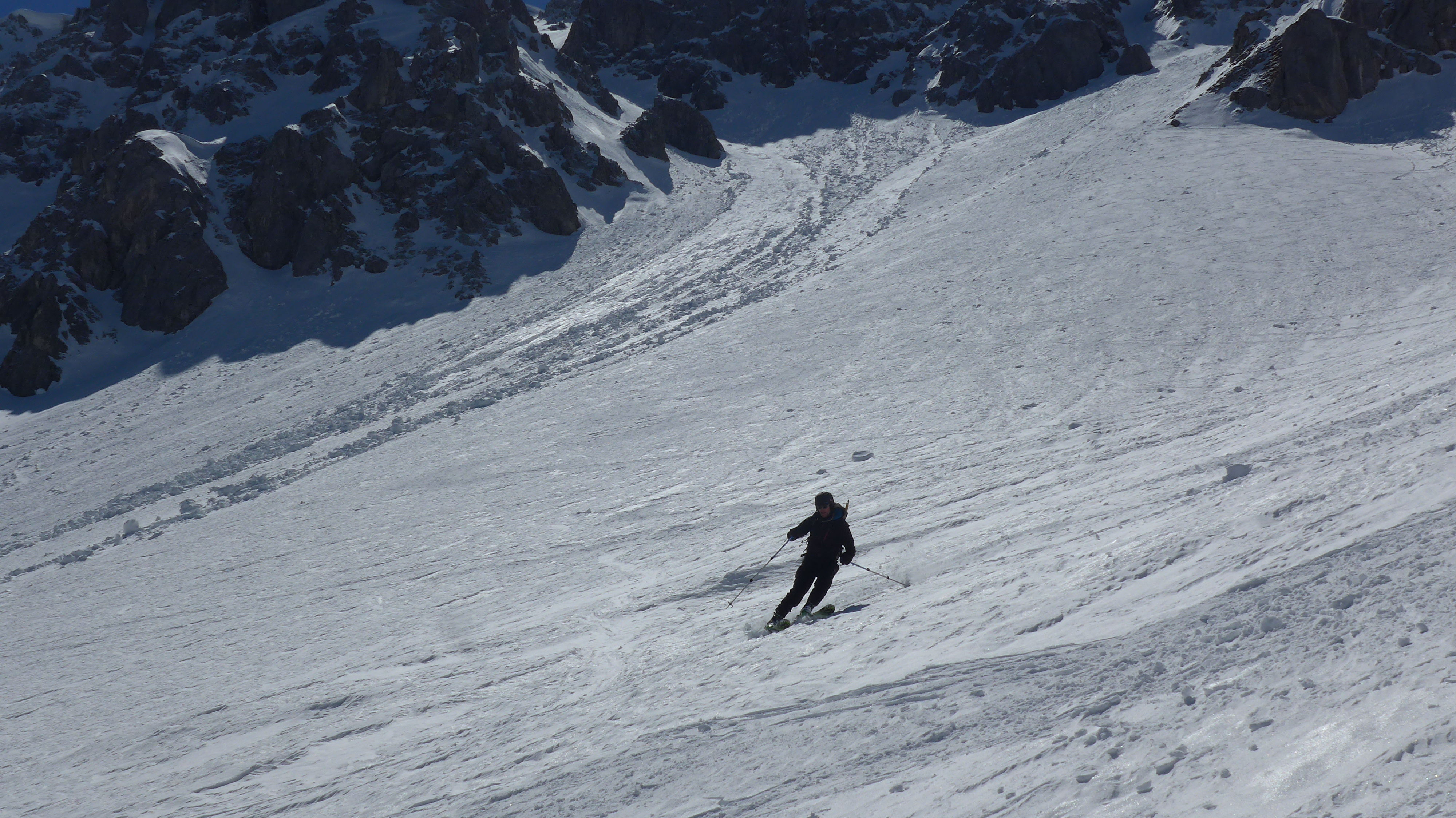 5. Tag Aufstieg über den sehr steilen harten (39°) Hang mit Steigeisen (220 Hm), weiter mit Ski zur Nördlichen Fluelücke. Unter dieser wurden wir schon mit Steinschlagsalven empfangen. Vor kurzer Zeit gab´s hier einen Felssturz. Umdisponiert. Die Rinne östlich davon mit Steigeisen (200 Hm) aufgestiegen, hier war kein herunterkommen auf den Gletscher zur Abfahrt nach Meien. Schade. Abstieg zurück. Und herrliche Firnabfahrt zur