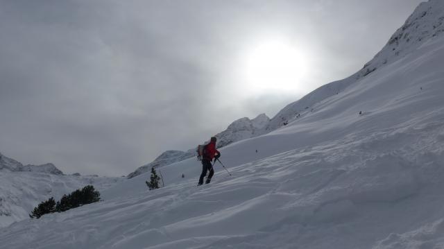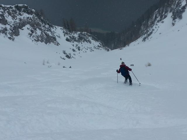 Macht nix! Wir hatten mächtig Spaß, nach 150 Hm hatten wir wieder deutlich bessere Sicht und genossen juhezend den Pulverschnee, später durch schönen lichten Lärchenwald. Herrliche Abfahrt.