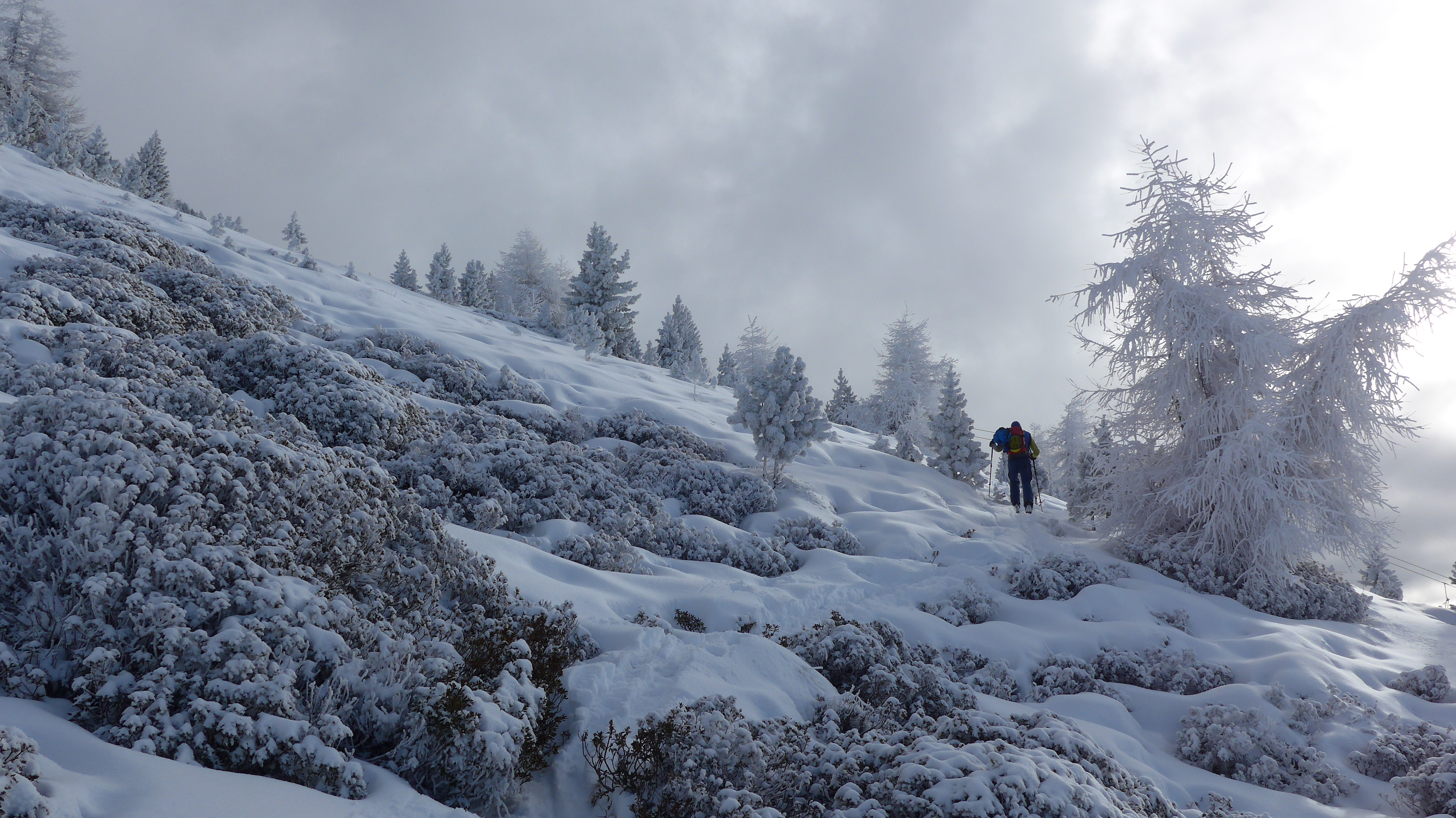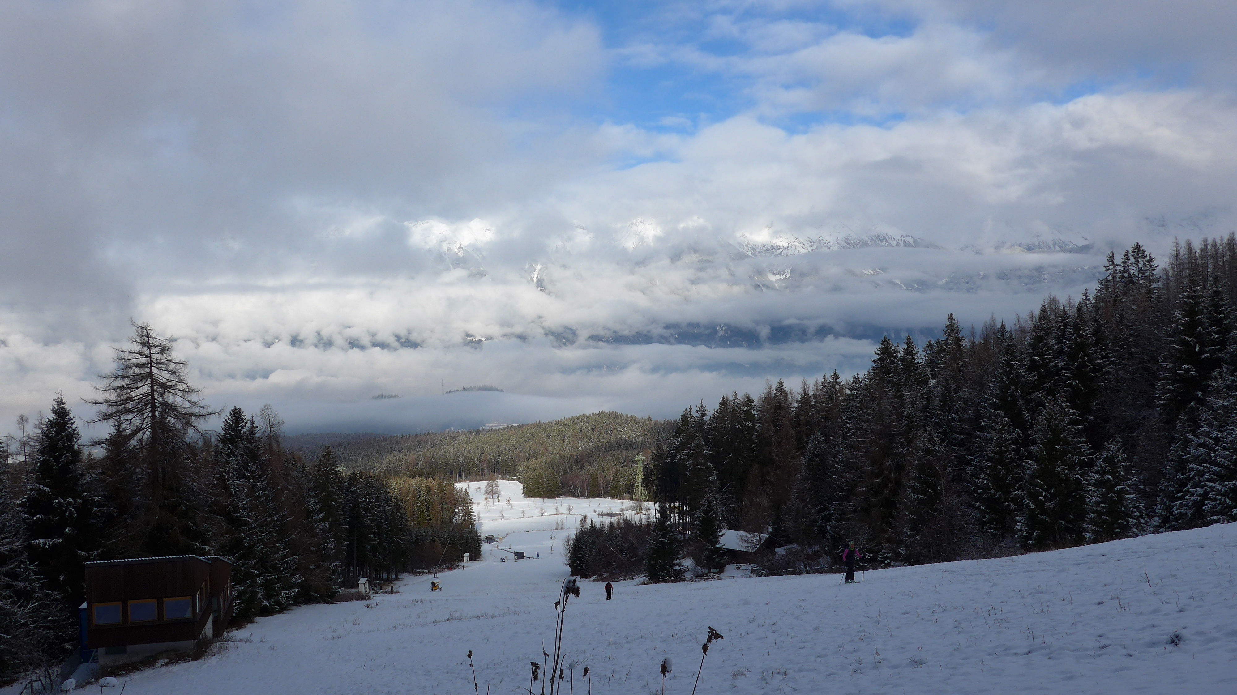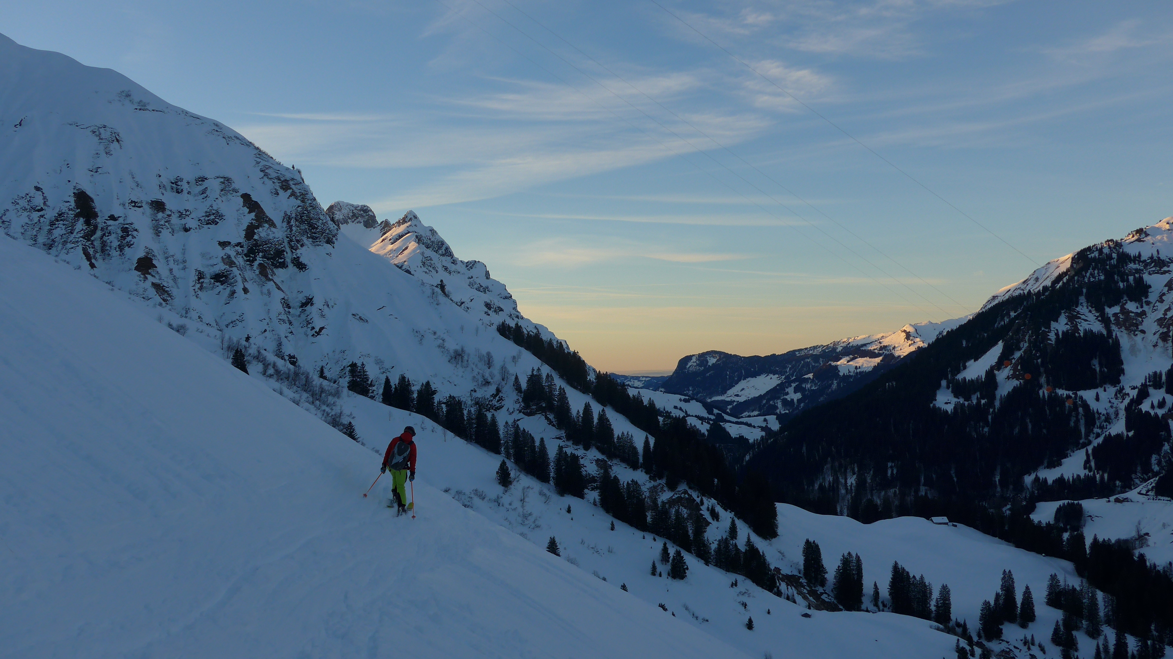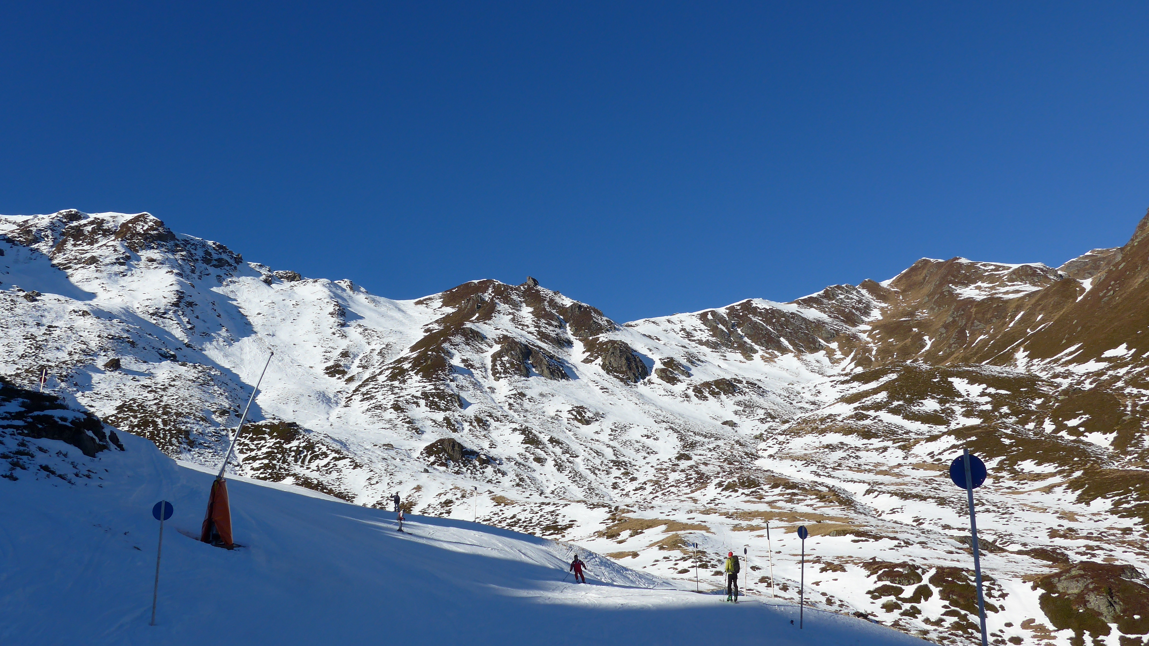 Tourenverhältnisse: von unten weg Schnee, fast etwas eisig. Die zwei Zwergal-Lifte waren heute in Betrieb. Der oberste Pistenabschnitt ist teils schon aper od. sehr geringe Schneedecke. Der Weiterweg ist gut mit Schnee bedeckt, ausser kleine Wasserläufe + der Hüttenhang (S). Windstill.