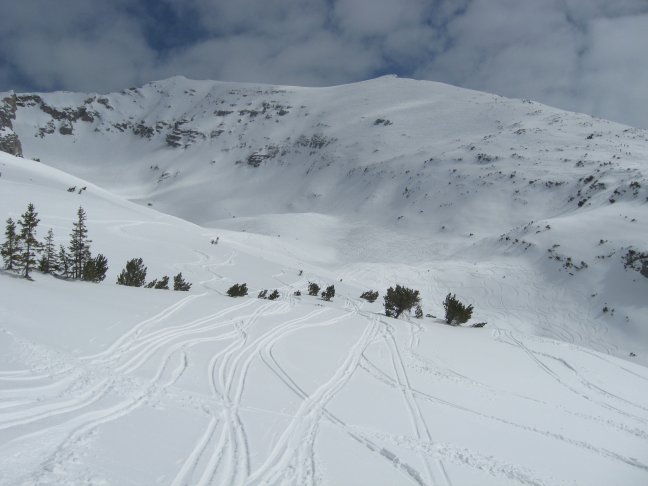 • Steigt man über den (auch sehr schönen) Normalweg ab, kommt man zuletzt wieder am Parkplatz raus. Die manchmal beschriebenen "mit feinem Schotter gefüllten Rinnen im Hochgrieskar" hatten sich leider als nicht durchwegs "fahrbar" erwiesen. Z.T. schon recht große Brocken dabei und einige Stellen, an denen der Schotter stark gepresst ist. Ist was für "Liebhaber" würde ich sagen.