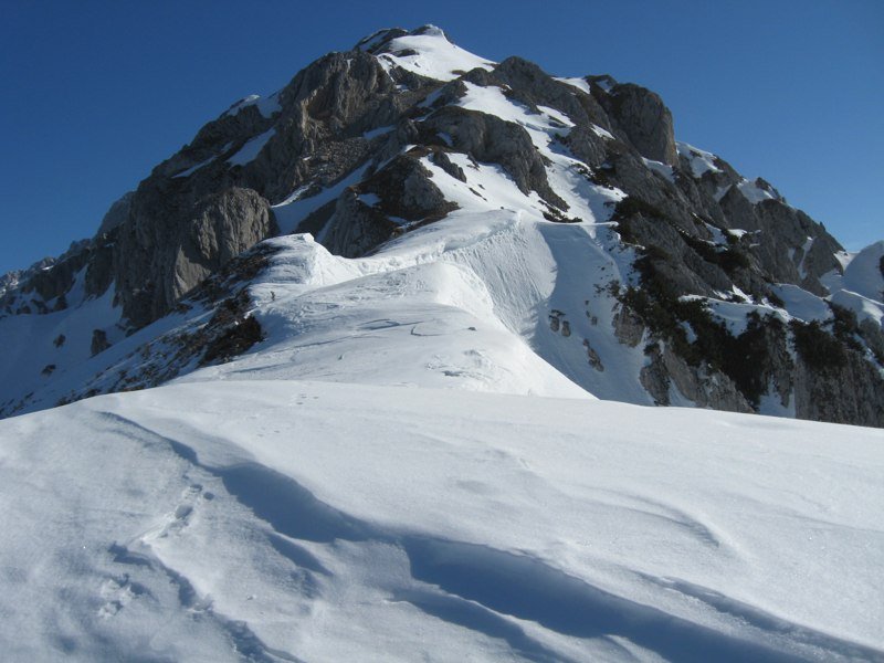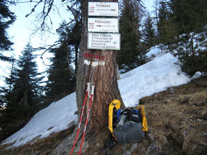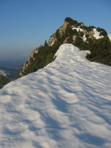 Tourenverhältnisse: Bis zur Rettensteinhütte schon sehr stark ausgeapert (südseitig). Ab der Rettensteinhütte teilweise noch geschlossene Schneedecke bis zur Ahorneggalm. Der Gratanstieg liegt im unteren Bereich noch unter recht viel Schnee. Teilweise muss "auf" den Latschen gegangen werden, mit der Gefahr eine dünne Stelle zu erwischen. Die Markierungen sind ab dem Schild beim "Bankerl" nur selten zu sehen (unter Schnee verborgen). Ab der Latschengrenze den Gratverlauf im Auge behalten und meistens nord-westseitig oder direkt auf dem Grat über nur noch wenig Schnee hochkraxeln (I). Durch eine steilere Rinne ist tagsüber Schmelzwasser geflossen und festgefroren. Das Eis macht die Stelle etwas heikel, aber wenn man sich obern rausgezittert hat, sieht man eine Möglichkeit die Rinne (v. u. gesehen links in tiefem Schnee) zu umgehen (evtl. für Rückweg interessant). Auf dem (teilweise ausgesetzten) Gipfelgrat liegt noch viel (Press)Schnee mit z.t. mächtigen Wächten zur Südseite runter.