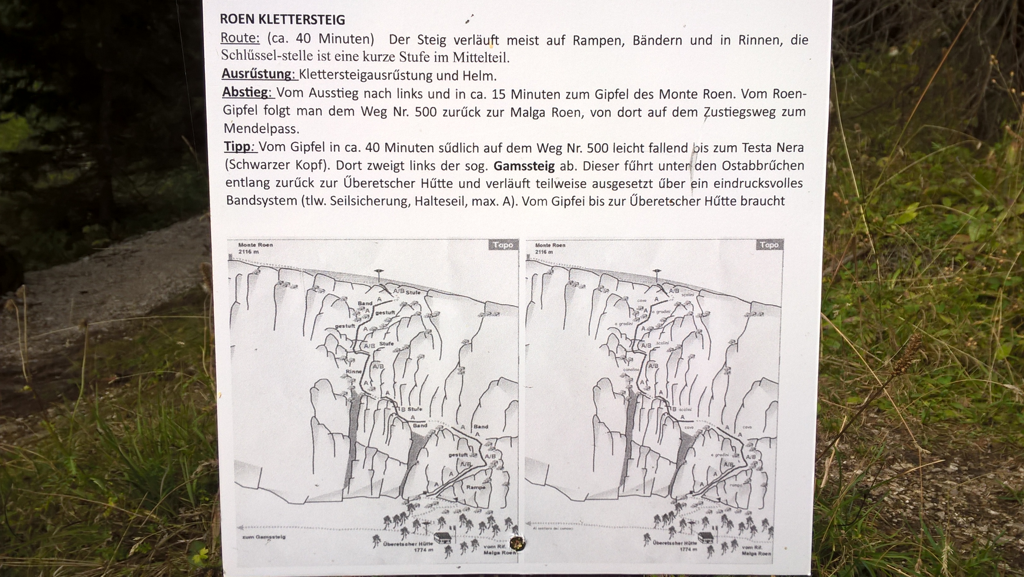 Tourenverhältnisse: Zuerst führt der Weg auf geschottertem Fahrweg ca. 15 Minuten zur schön gelegenen Überetscher Hütte. Von dort gilt es noch einige Höhenmeter steilen Zustieg zu schaffen. Schwierigkeit des Klettersteigs ist A/B. Dauer des Steigs ca. 45 Minuten. Immer wieder erleben wir tolle Ausblicke auf das unter uns liegende Etschtal und wenn die Wolken es zulassen auch weiter Richtung Rosengarten und Latemar. Auch die steil abfallenden Felsen des Mendelkamms neben uns sind beeindruckend. Nach dem Ausstieg sind es noch ca. 15 Minuten einfache Wanderung bis zum Gipfel des Monte Roèn, der höchsten Erhebung des Mendelkamms. Hier bieten sich auch tolle Blicke ins Nonstal und bei guten Bedingungen noch weit darüber hinaus. Da die Wolken immer dunkler wurden, sind wir nicht wie geplant weiter zum Gamssteig sondern den einfacheren Wanderweg zurück zur Malga die Romeno.