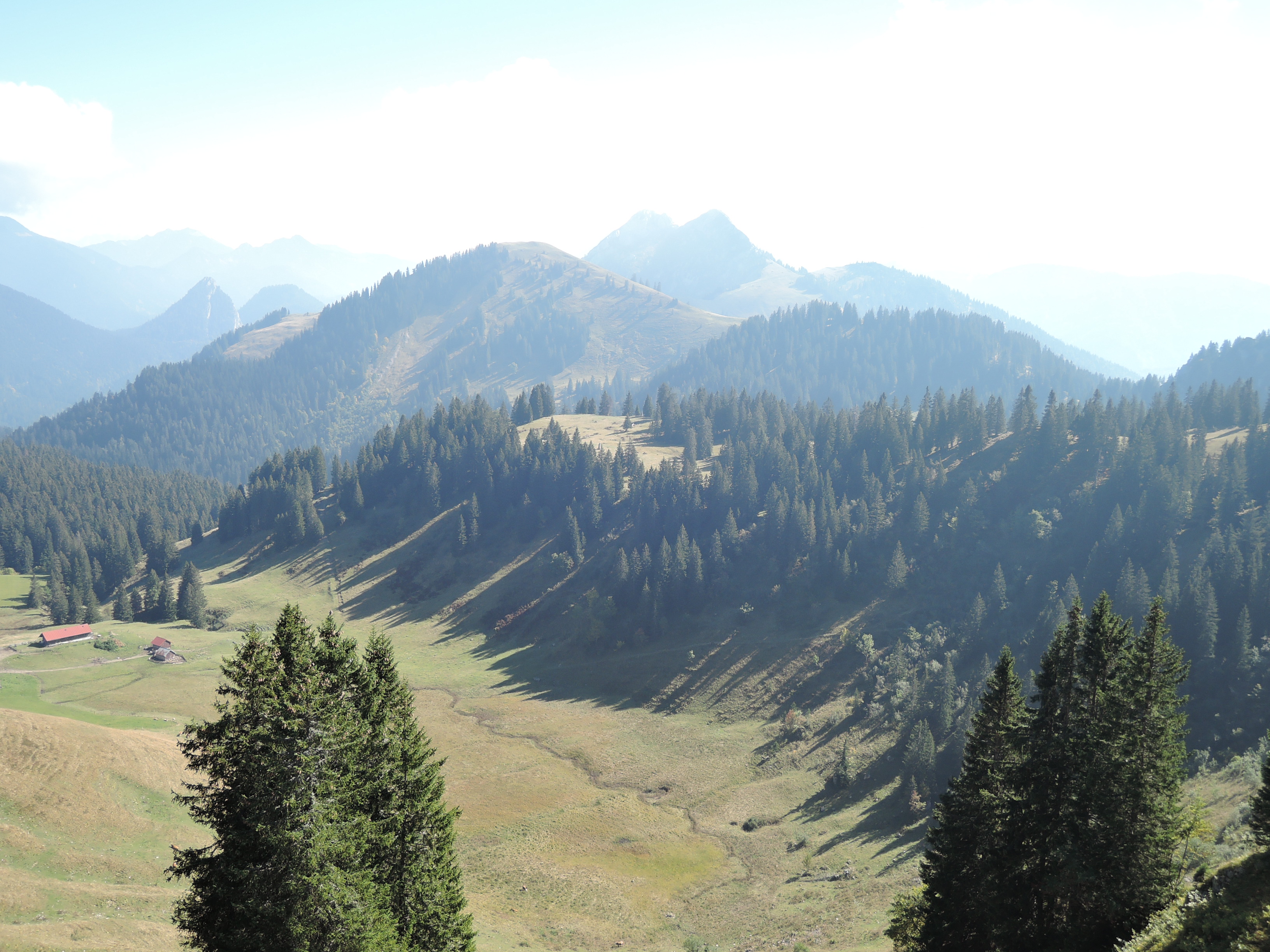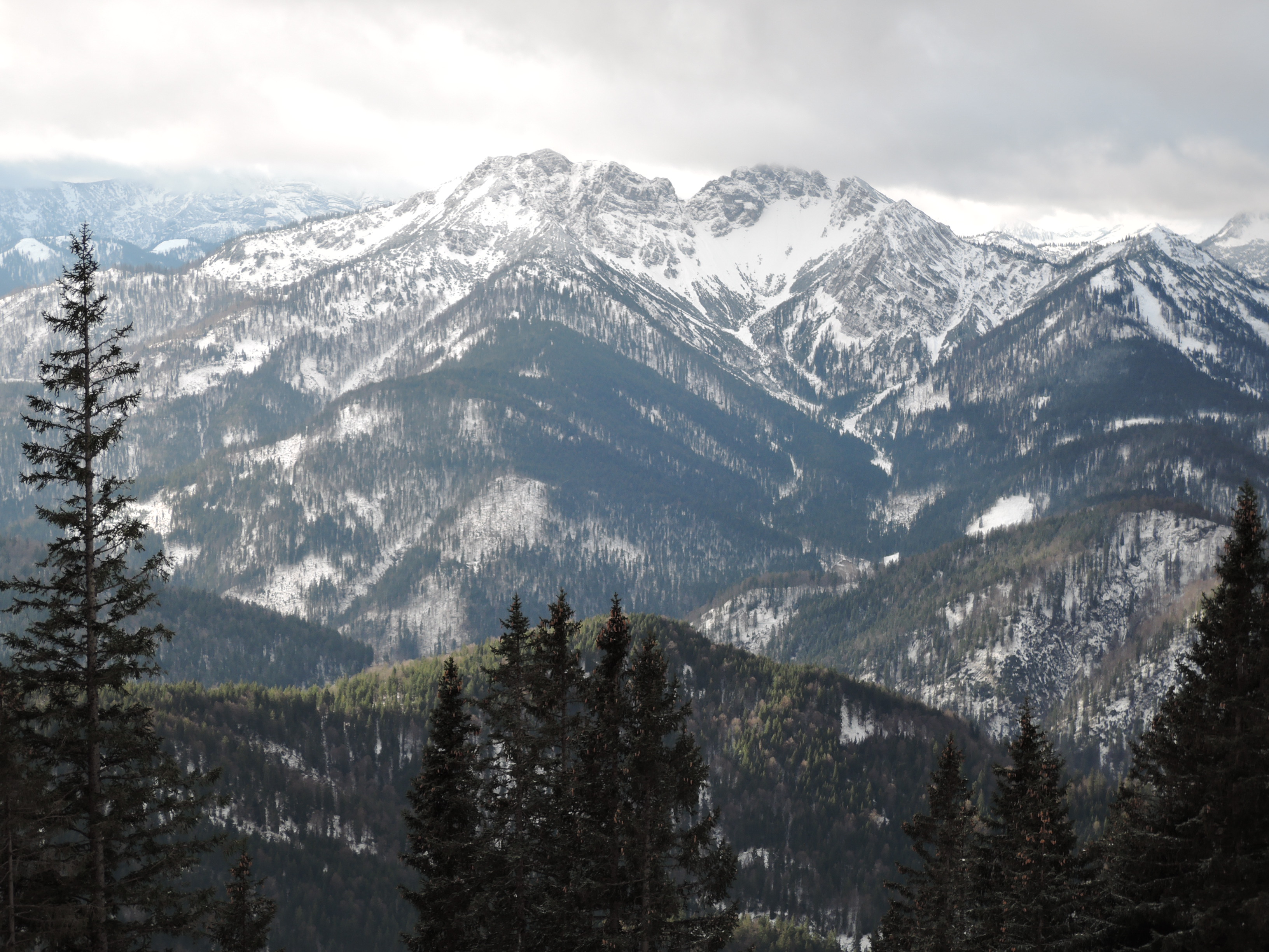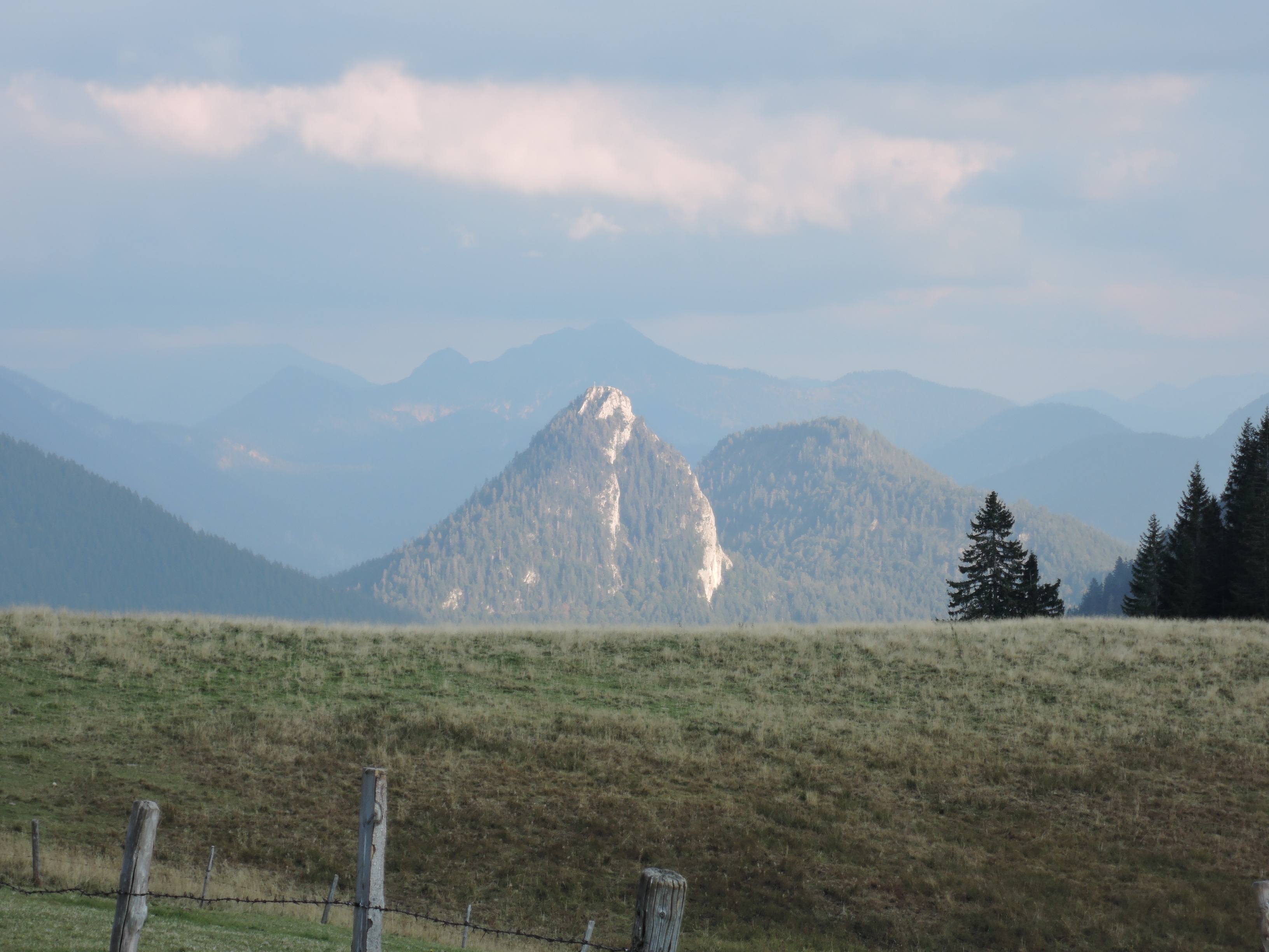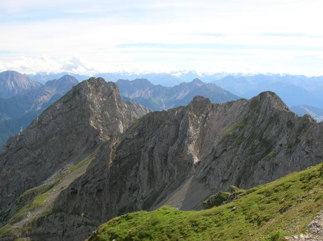 Zwei Gipfel der Vortage auf einem Bild: Links der Hochwipfel und rechts der Trogkofel von Südwesten:
