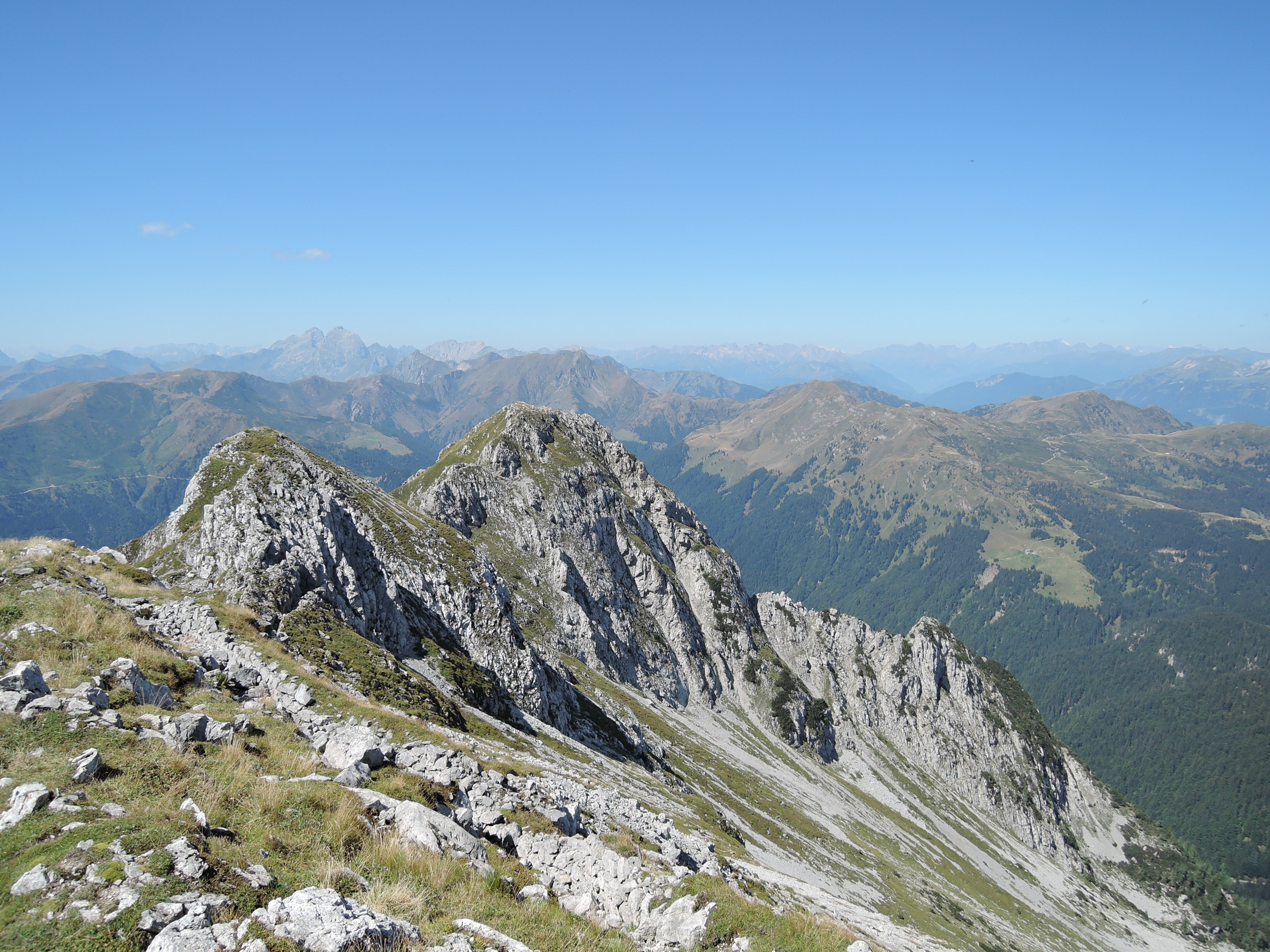 3. Monte Zermula am Passo Cason di Lanza (Friaul): Der Zermula ist ein phantastischer Aussichtsberg der bei den Einheimischen sehr beliebt ist. Anfahrt über Pontebba im Kanaltal über Asphaltstraße. Viele gehen den Nordwand Klettersteig (B-C). Wir haben heute den Normalweg gewählt weil die letzten Tage anstrengend genug waren. Dieser führt östlich hinauf auf den Sattel, bevor es südlich entlang des Massivs (vorsicht steile Grashänge) hinüber zum Gipfel geht. Alternativ kann man entlang der verfallenen Stellungen der Berg auch überschreiten. Der Pfad ist einfach zu finden, er verläuft ab dem Sattel etwas nördlicher. Heute war der Gipfelblick einfach phantastisch. Die klare und trockene Luft ergab eine enorm gute Fernsicht. Montasio und Julische Alpen im Osten, die Tauern und der Glockner im Norden. Gletschergebiete um den Venediger und die Dolomiten. Paularo und Tolmezzo im Süden.