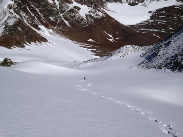 Der Anstieg vom Taschachferner in den Urkundsattel ist schon anspruchsvoller, da nur noch im rechten Bereich eine steile Firnflanke gut begehbar ist, welche im Abstieg Vorsicht erfordert und zudem kurz unterm Urkundsattel Steinschlag gefährdet ist.