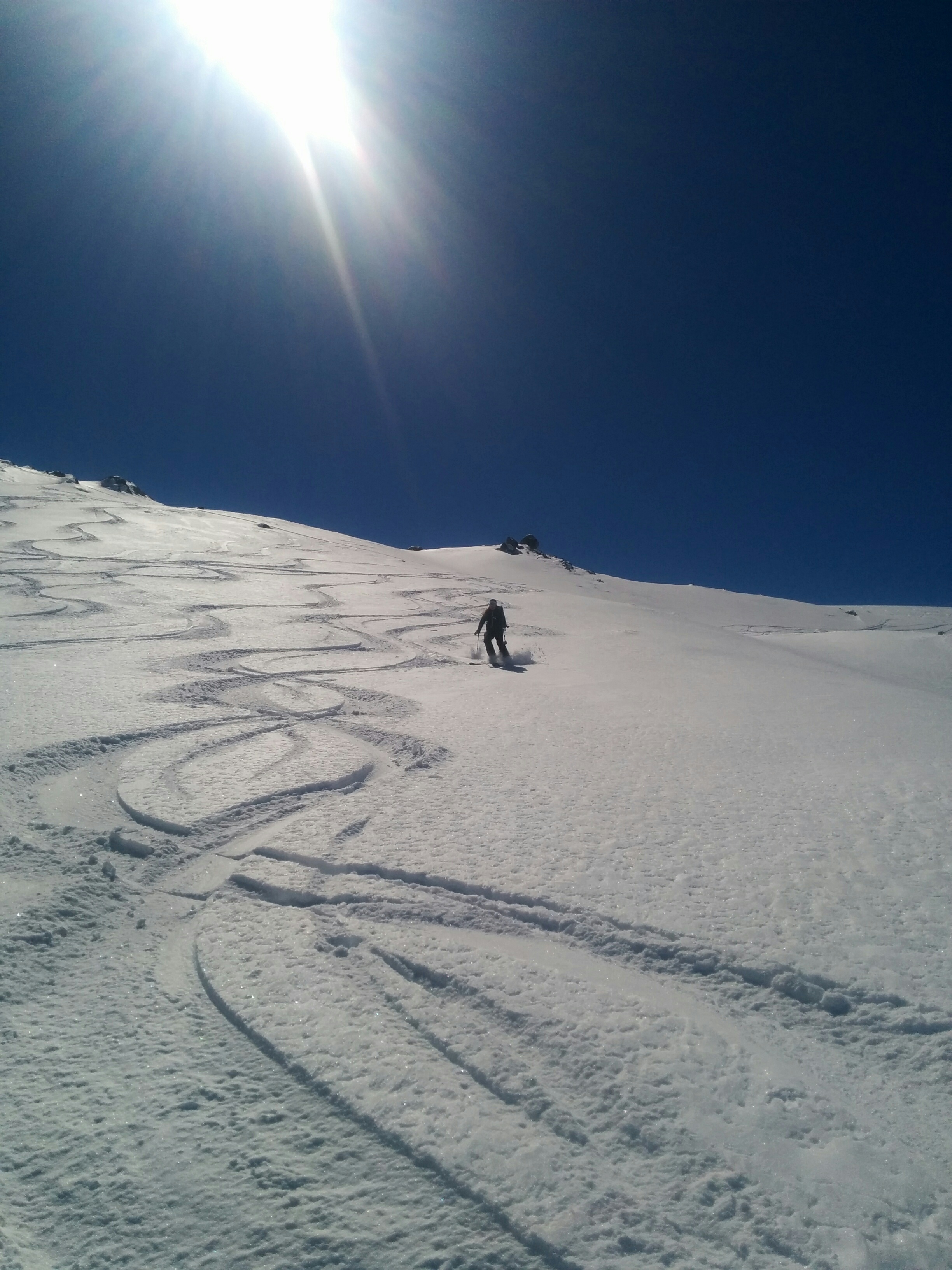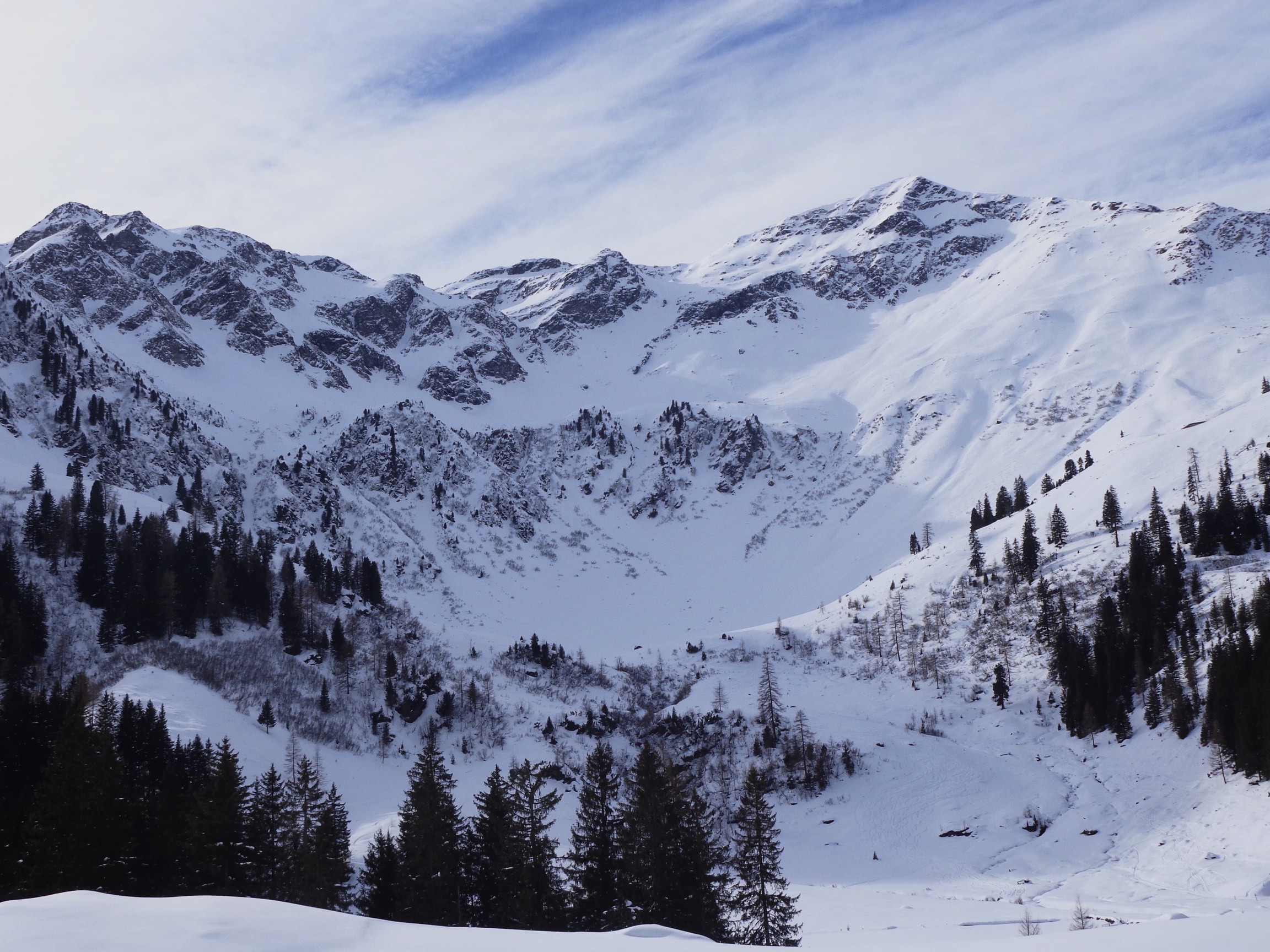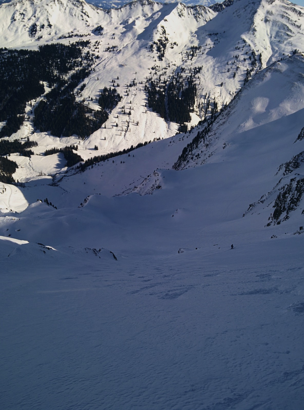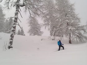 Gefahreneinschätzung: Wenig verspurtes Steilgelände .... sehr sanfte Schwünge gesetzt, Sturzverbot, 2er Gruppe, gute Absprachen ... dennoch nicht ganz sicher gefühlt. Schneeaufbau: Gesetzt bis leicht gepresst, keine ausgeprägte Schwachschit gefunden. Der Kammnahe Bereich der Abfahrt ist deutlich flacher als der Rest. In Summe für uns akzeptabel und vertretbar.