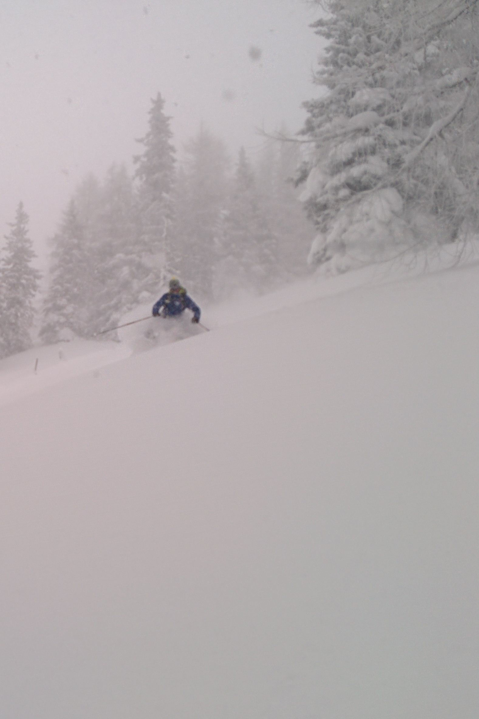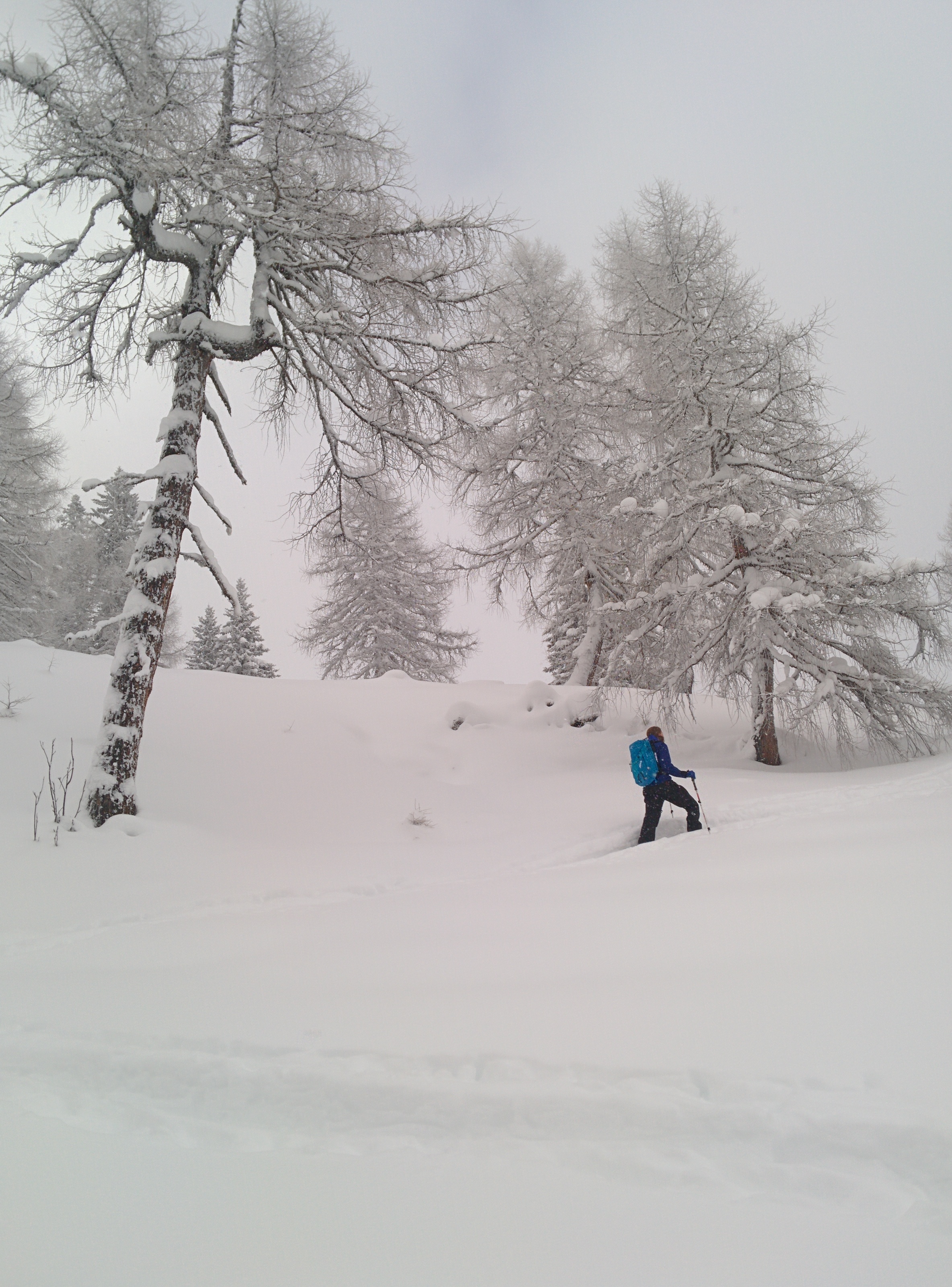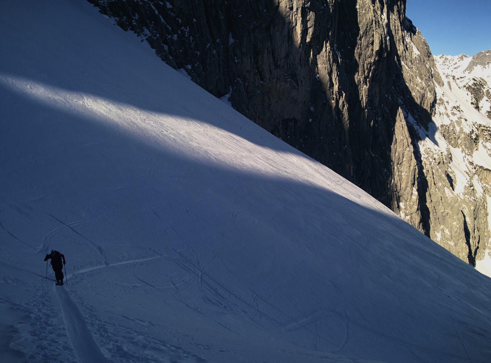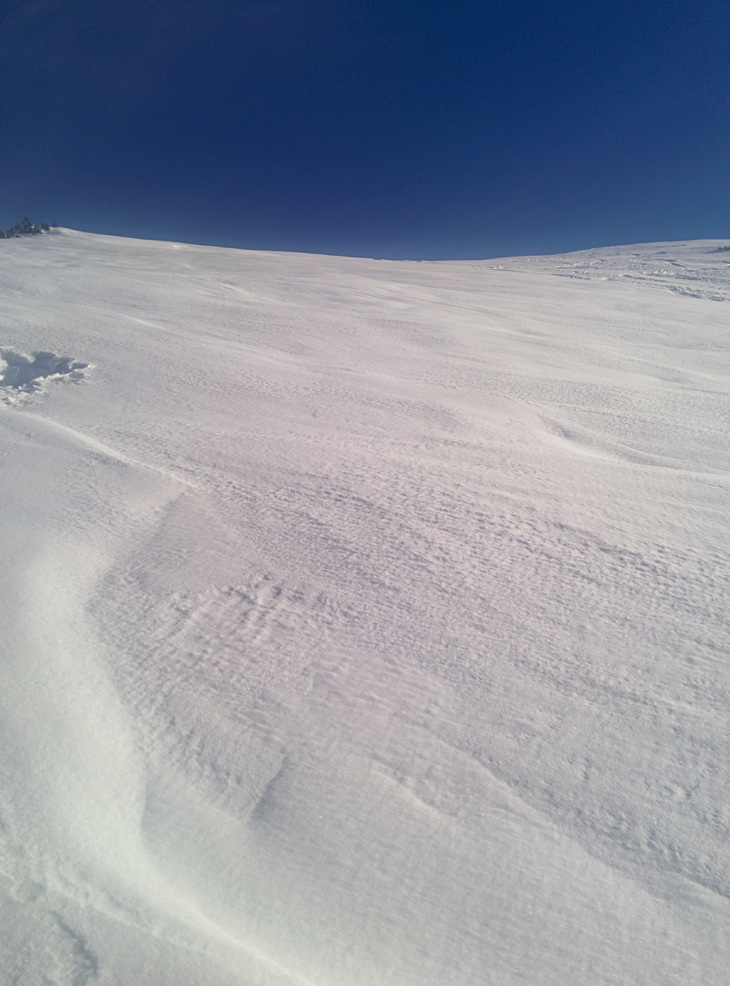 Gefahreneinschätzung: Wenig verspurtes Steilgelände .... sehr sanfte Schwünge gesetzt, Sturzverbot, 2er Gruppe, gute Absprachen ... dennoch nicht ganz sicher gefühlt. Schneeaufbau: Gesetzt bis leicht gepresst, keine ausgeprägte Schwachschit gefunden. Der Kammnahe Bereich der Abfahrt ist deutlich flacher als der Rest. In Summe für uns akzeptabel und vertretbar.