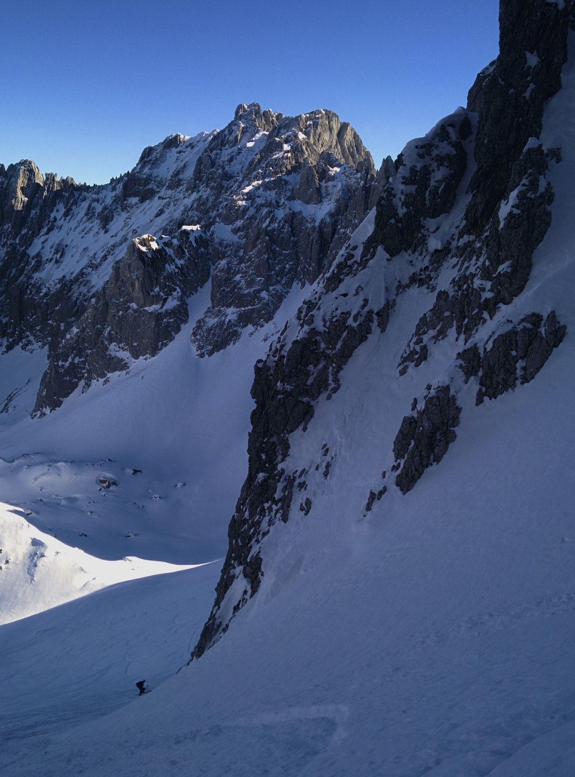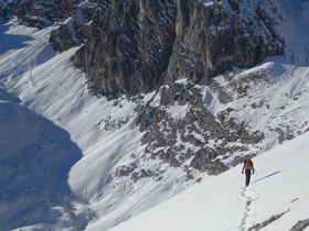 Abfahrt: Verbindungsgrat vom Gipfel Richtung Kleiner Galtenberg war mit einigen moralischen Stellen gut fahrbar, in der letzten Querung hängt noch ein kleineres durchgefrorenes Schneepaket (Achtung bei Erwärmung). Die Abfahrt (Ost) beginnt mit einem kurzen, gemütlichen Part und geht dann in einen langen (lawinösen) Steilhang mit wenigen richtig guten Wartepositionen über. In Summe leicht gepresster aber sehr gut fahrbarer Schnee (siehe Bild 1). Beim Absatz nach dem Steilhang haben wir uns etwas Richtung Ost (Richtung Torkopf) gehalten, bis man zu einem kleinen ausgeprägten Rücken zwischen zwei engen Steilrinnen (ein kleiner einzelner Baum kennzeichnet die Einfahrt) kommt. Wenn man diesem Rücken (mal links und rechts) folgt, kann man die Einfahrt in die Steilrinne meiden (Lawinen?), also sind wir genau diesen Rücken bis zum Ende runter und dann mit gutem Sichtkontakt in die Rinne gequert. Nach der Rinne gute Warteposition und danach 1A lass krachen Gelände bis zur Rodelbahn.