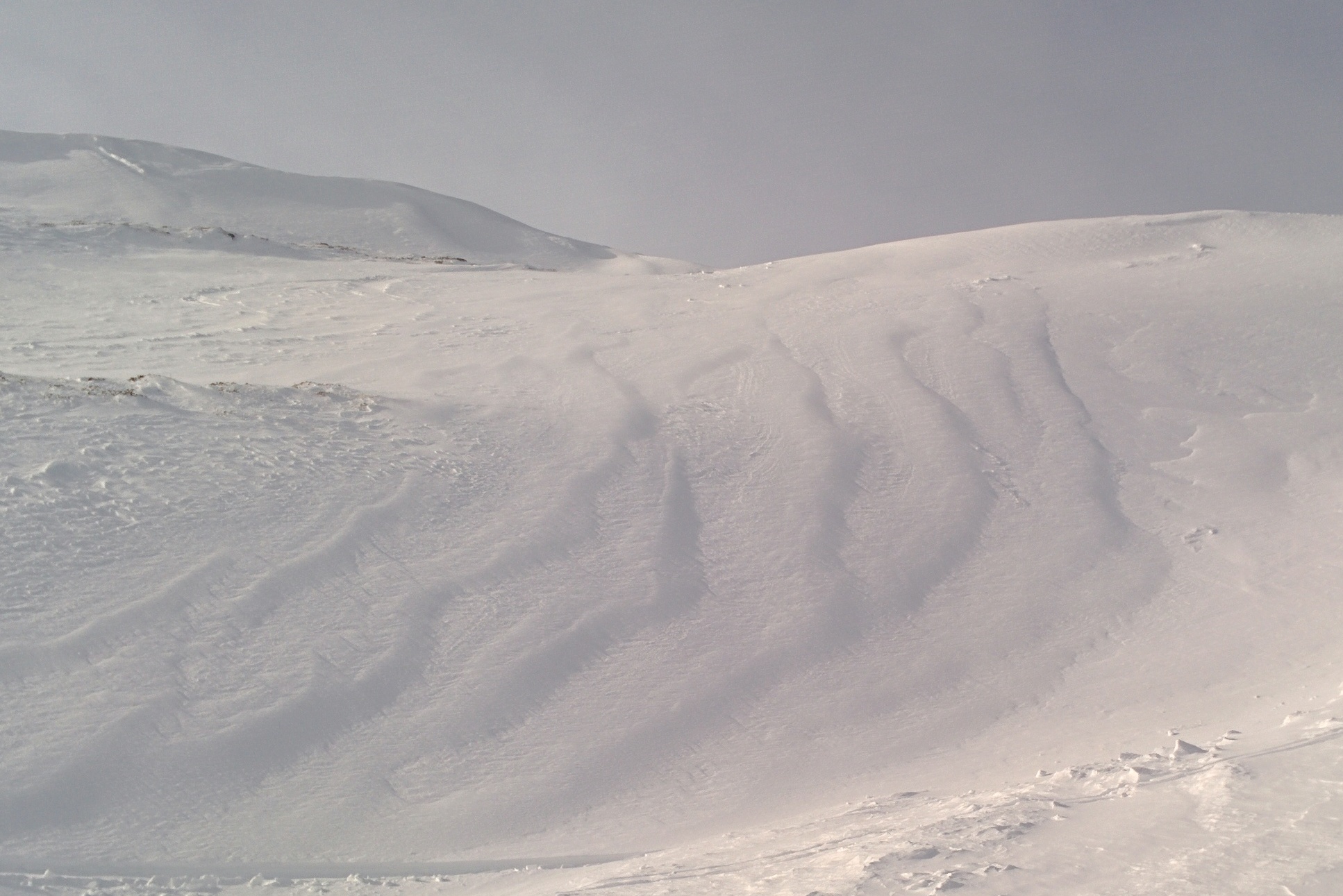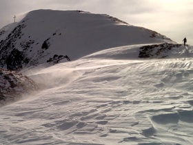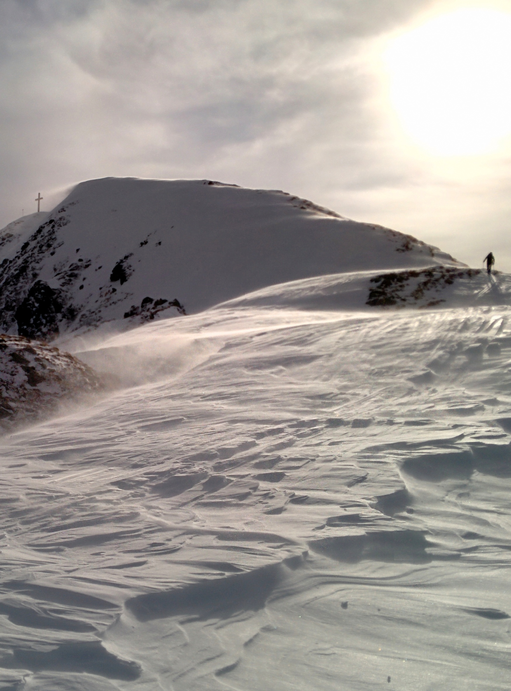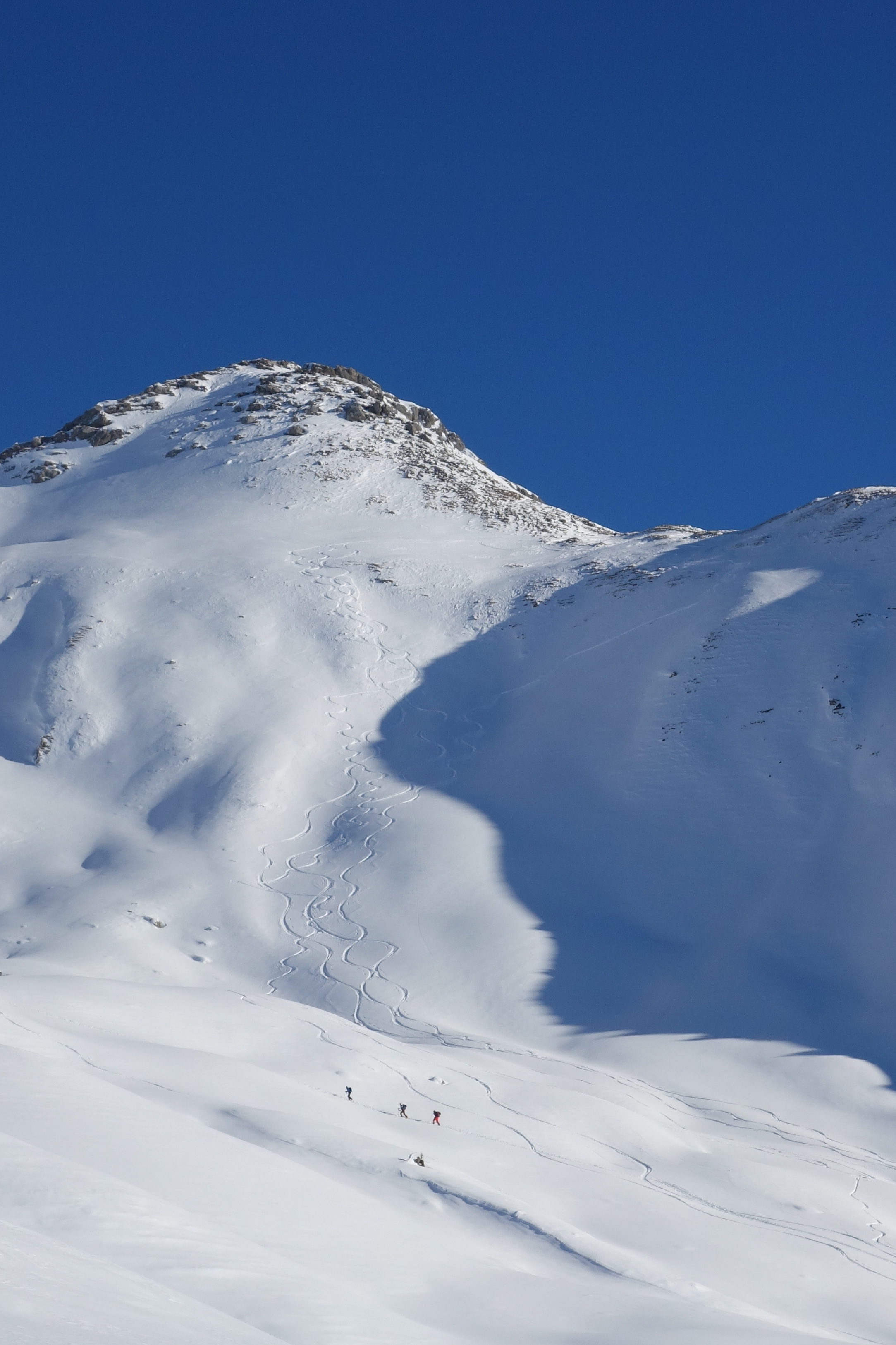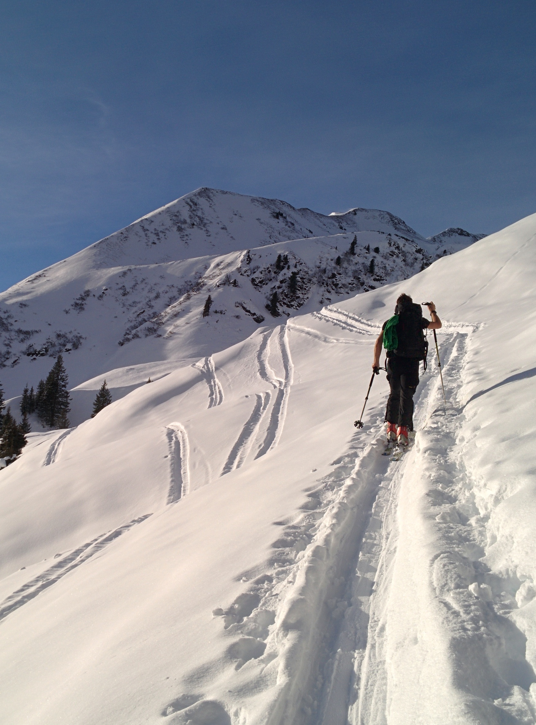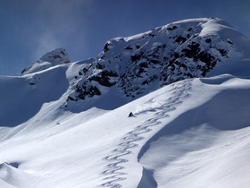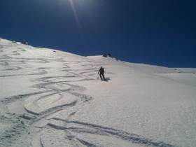 Im Aufstieg über Normalroute im unteren Teil gute Spur (abwechselnd pulvrig, gepresst, eisig), Nordwestflanke zum Gipfel mit sehr wenig Schnee und einigen unschönen