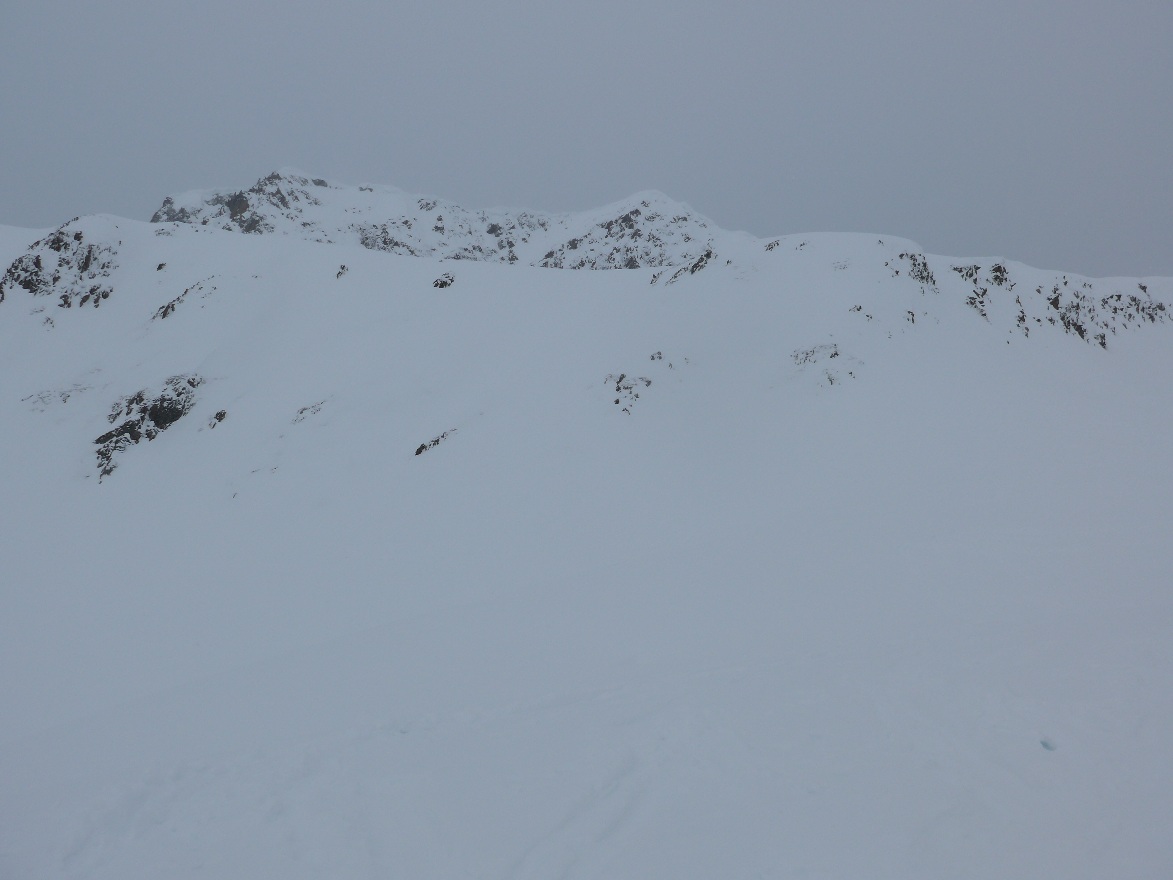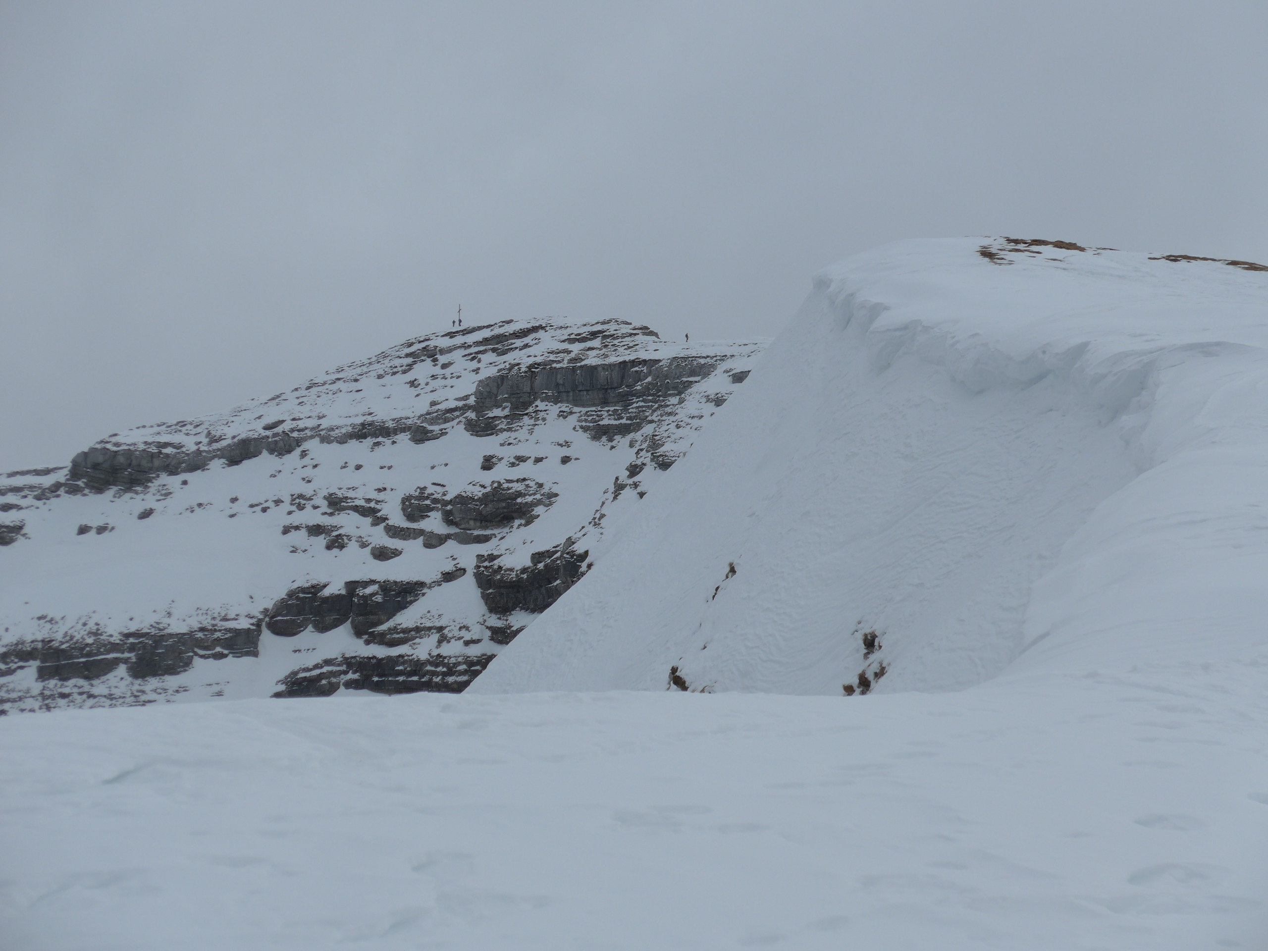 Der Harschdeckel scheint gut verfestigt. Die seitlichen westlichen Hänge waren in weiten Teilen abgeblasen.