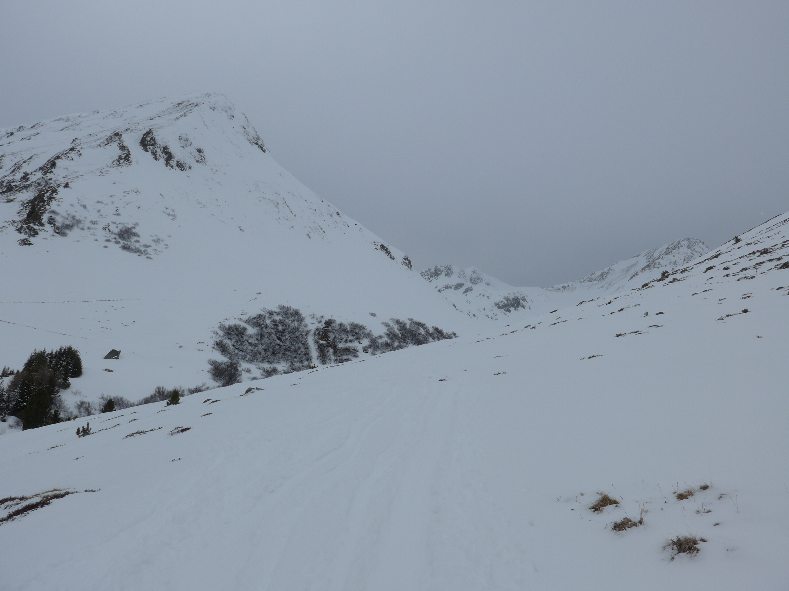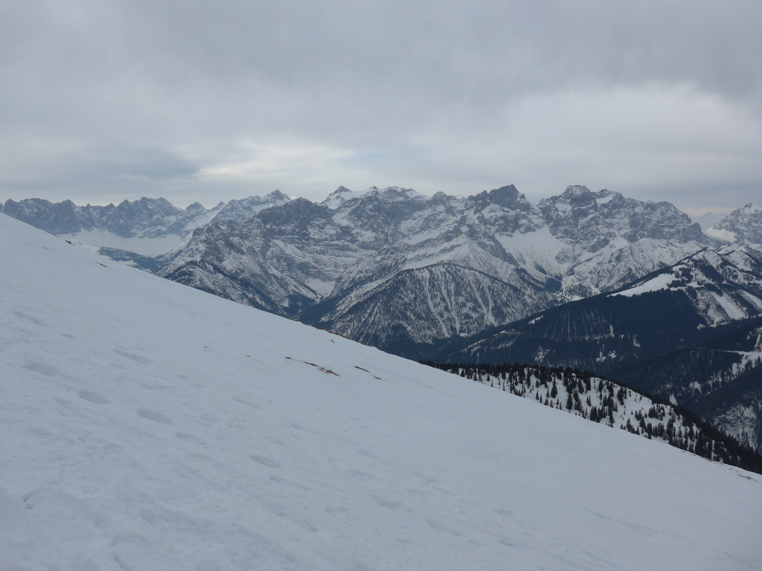 Tourenverhältnisse: Aufgrund der verhaltenen Wetterprognose, vormittags noch teils Sonne, teils Wolken, nachittags dichter, waren nur sehr wenige Tourengeher unterwegs. Am frühen morgen, 08:30 Uhr, war es ab dem ersten Steilstück etwas eisig, aber trotzdem gut gangbar. Ab dann fanden wir eine Neuschneeauflage mit 10-20 cm auf harschigem, aber tragfähigem Untergrund. Die Spur war oft verzweigt, aber im Grunde problemlos zu finden oder gut selber zu spuren. Die Gipfel waren im Nebelmeer, dahinter spürten wir die Sonne. Dies gab ein teils sehr diffuses Licht,das bei der Abfahrt die Konturen im Schnee schwer erkennen ließ. Weiter oben vor der Scharte begann es leicht zu schneien, teils mit stärkeren Windböen. Der Gipfelgrat zum Mitterzaiger war teils stark überwächtet, so dass wir uns, nach ca. 2,5 h Gehzeit, diesmal auf die windige und kalte Scharte beschränkten. Bei klarem Wetter wäre die Abfahrt sehr genussvoll gewesen. Weiter unten klarte es mehr auf und die Sonne blitzte hin und wieder durch.