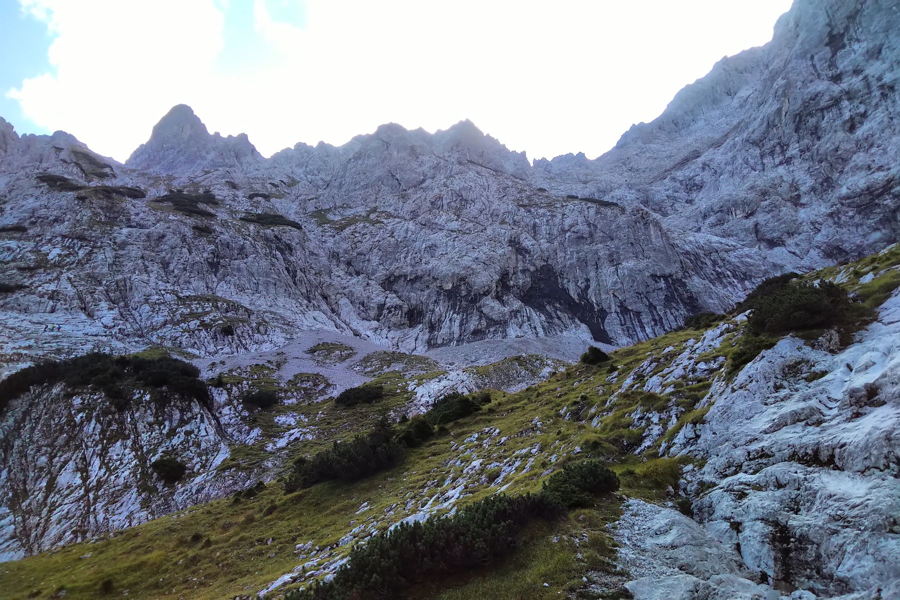 Hinten links der Laliderer Falk, unsere Route führt von links dorthin. Das eigentliche Falkenkar ist hier verdeckt (hinter der Latschenzone):