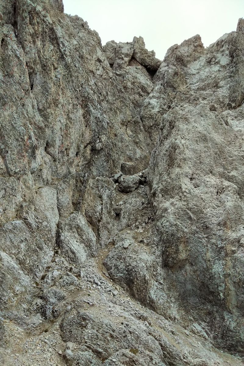 In der steilen Rinne - wenn der Untergrund kleinsplittrig wird, kann man sich meistens gut am Fels festhalten: