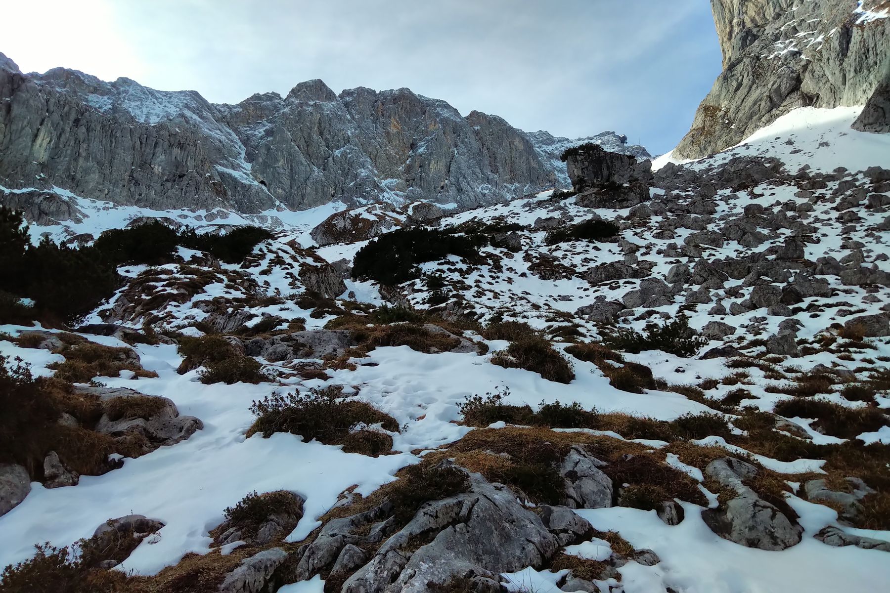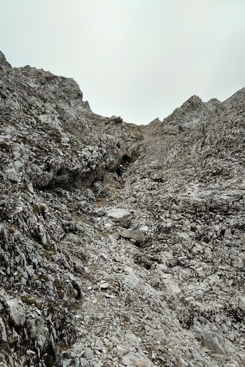 Kurz vor dem Einstieg ins Kraxel-Gelände. Rechts der Sattel zwischen Turmfalk und Laliderer Falk, wir steigen in einem Rechtsbogen dorthin auf: