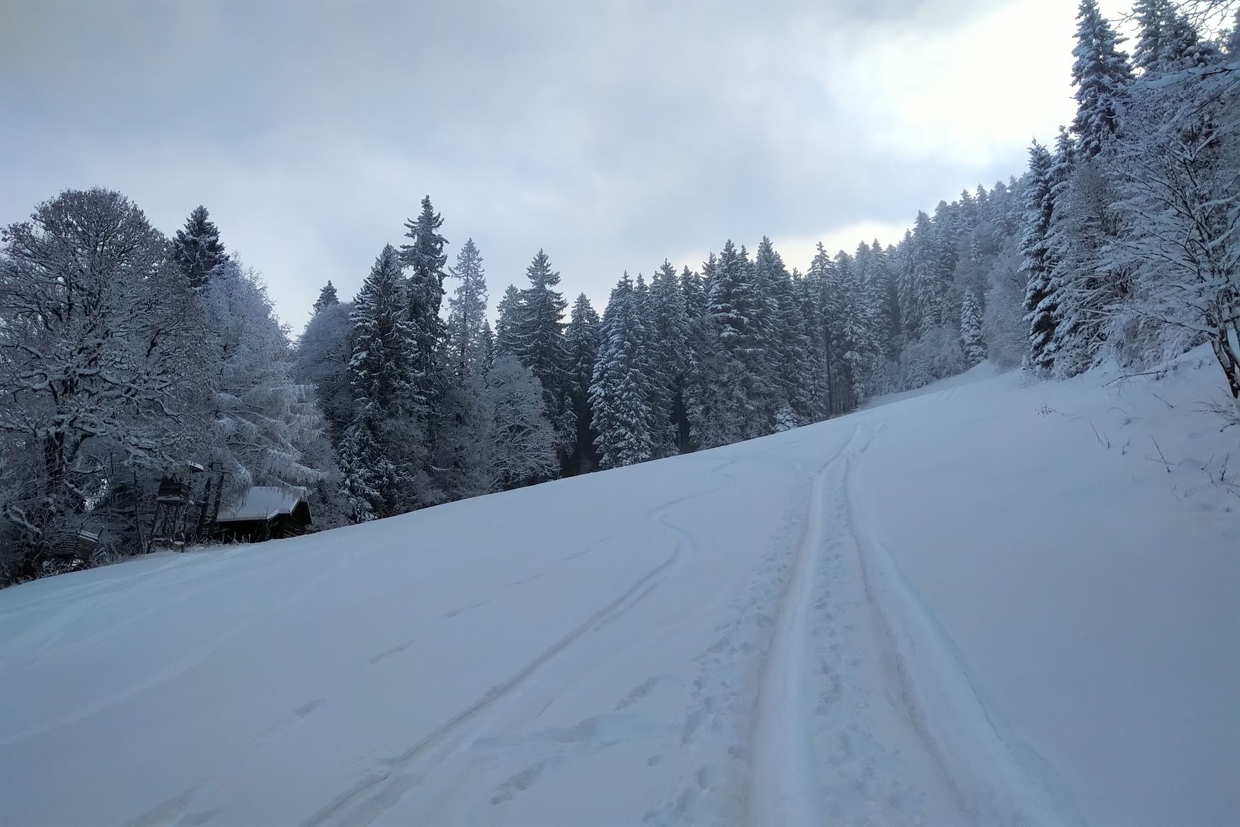 Auf dem Forstweg mussten wir nur insgesamt ca. 15 Minuten die Ski tragen (bei der Abfahrt nur etwas mehr).