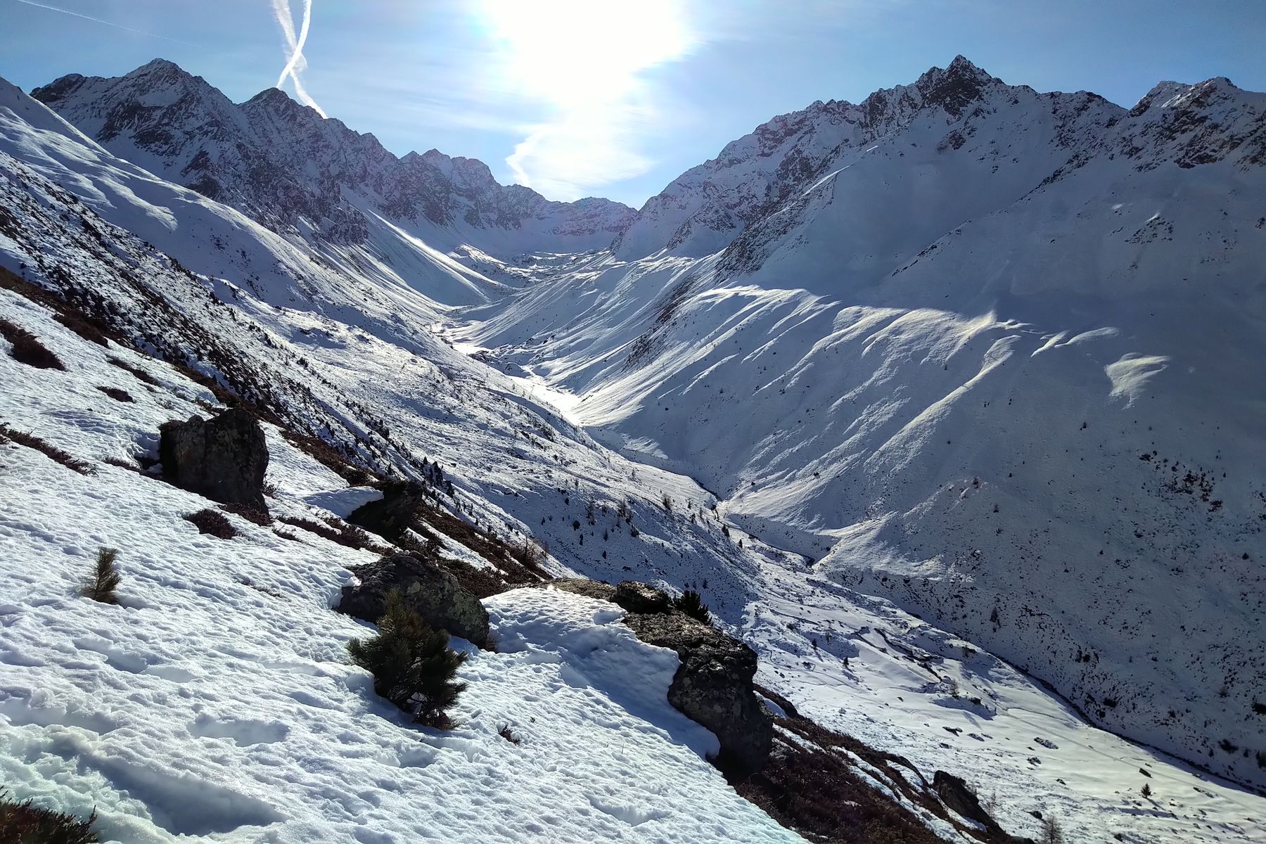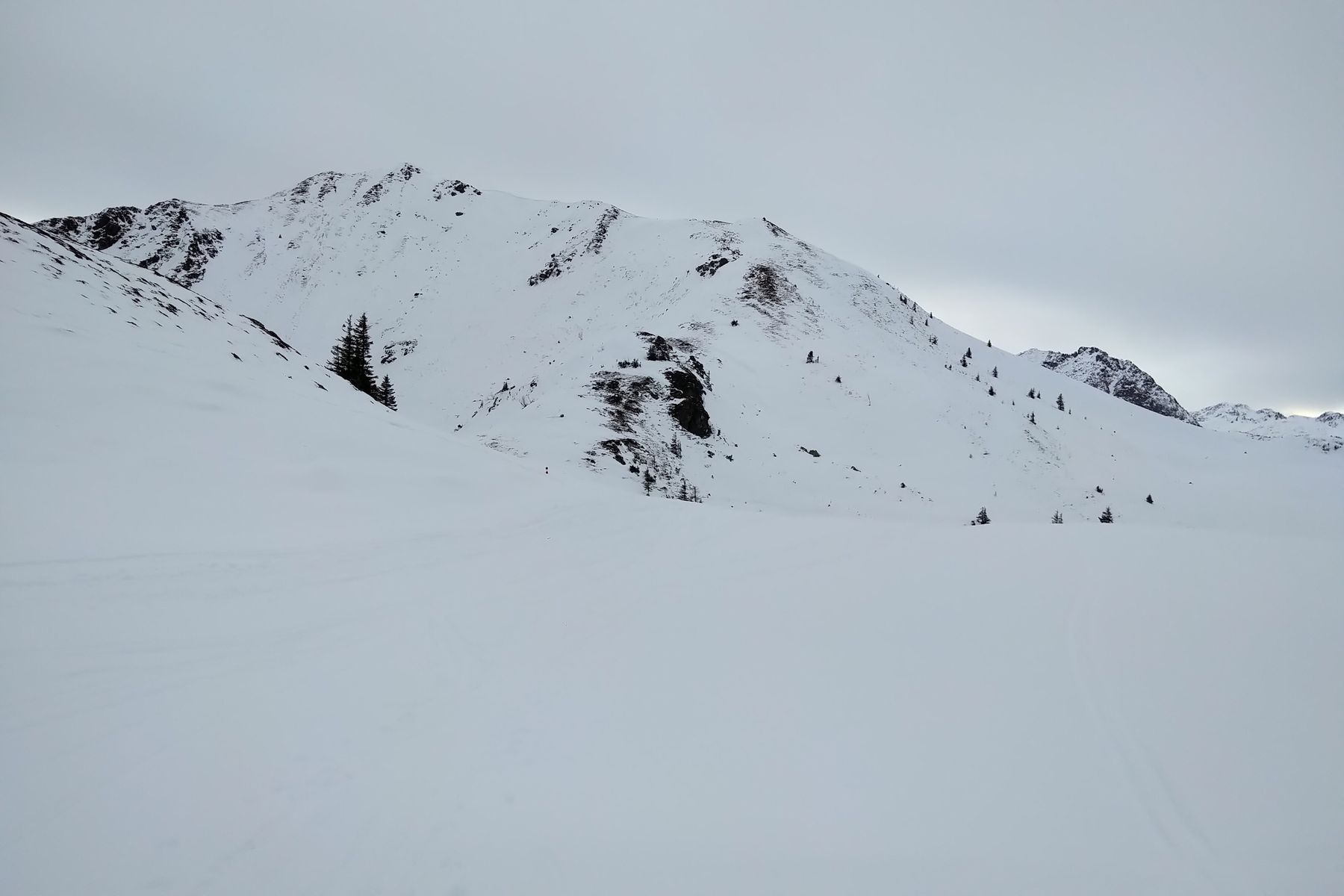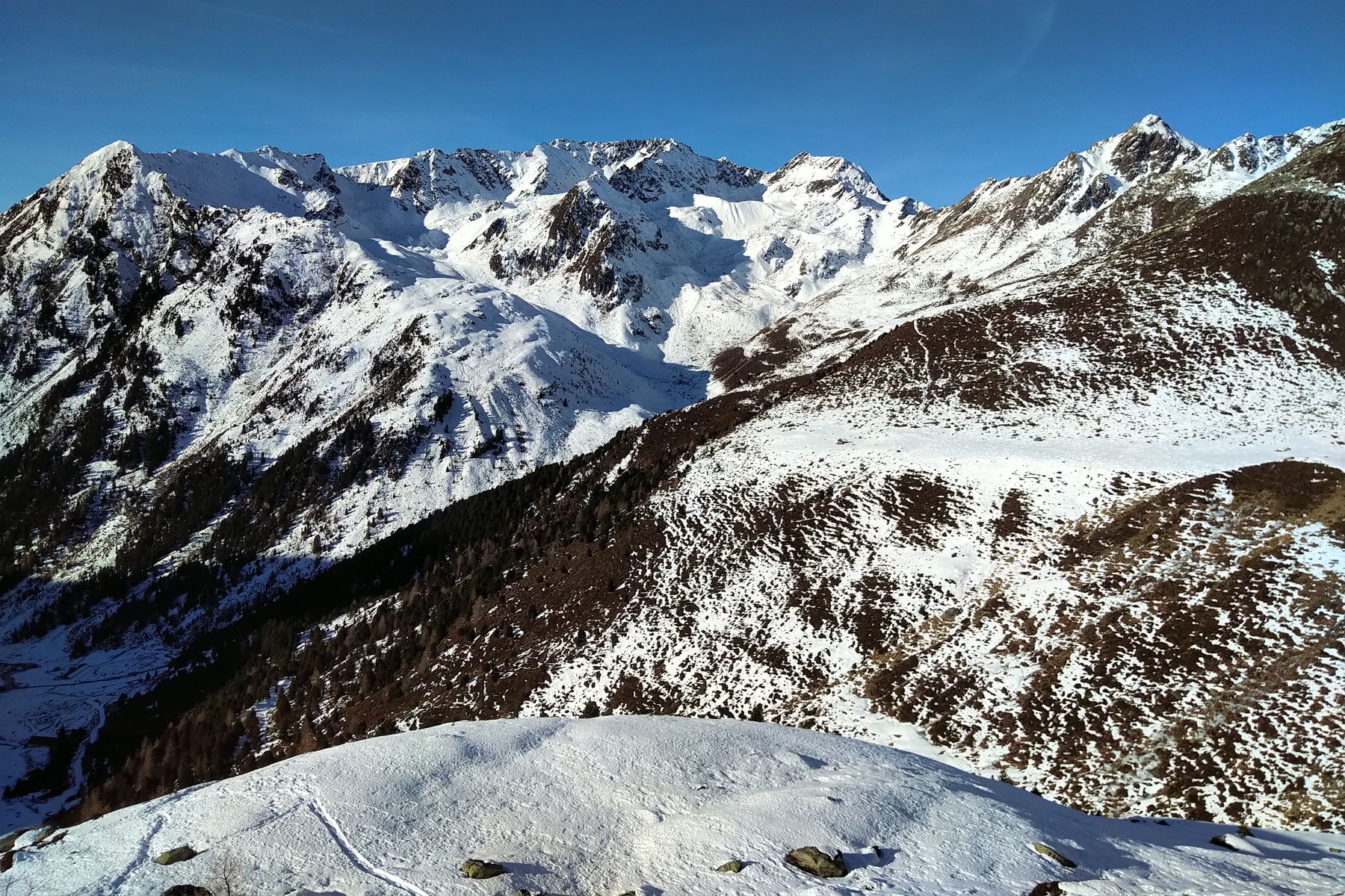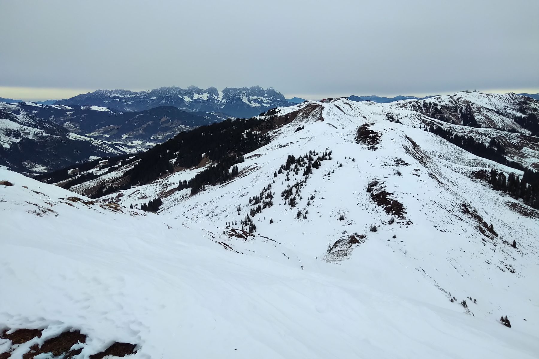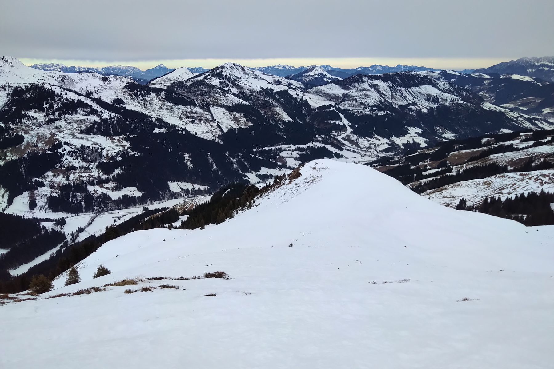 Blick zurück ins Tal, beim Aufstieg zum Dristkopf. Die Abfahrt war am Nachmittag ziemlich gut! Hinten links die Aleitenspitze: