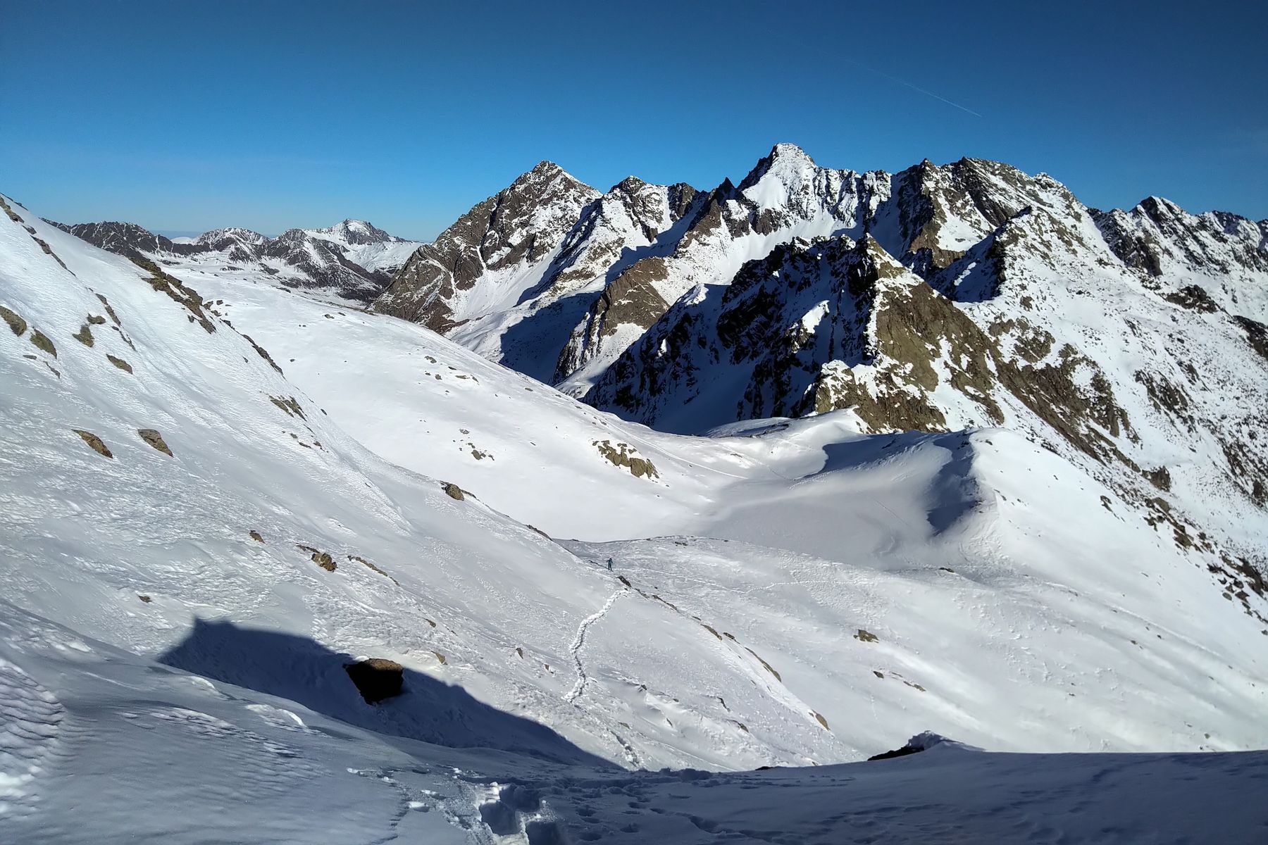 Abfahrt im Filzenkar mit Blick auf die beiden Berge, für die wir ein andermal wiederkommen: