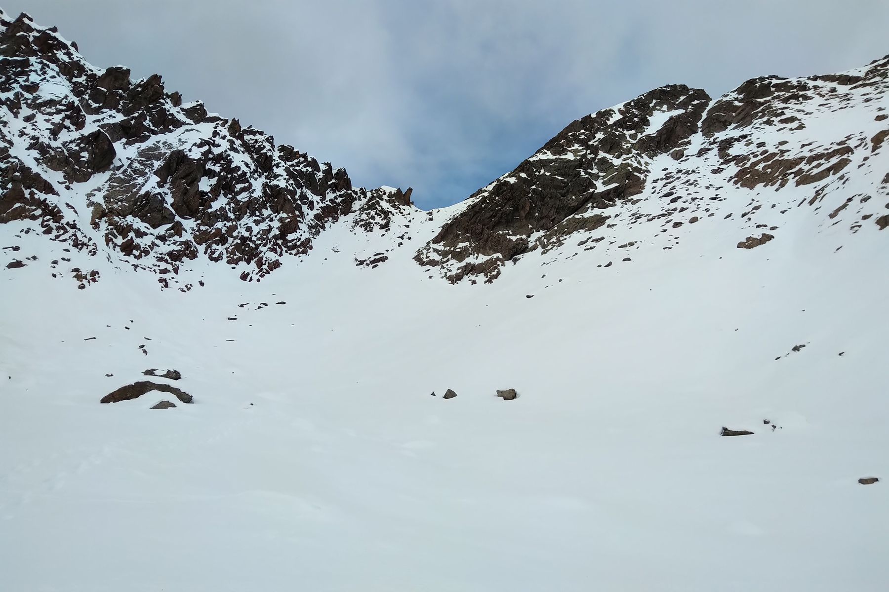 Im Jou de los Cabrones kurz nach der Hütte, hinten in der Bildmitte führt die steile Rampe zum Jou Negro hinauf: