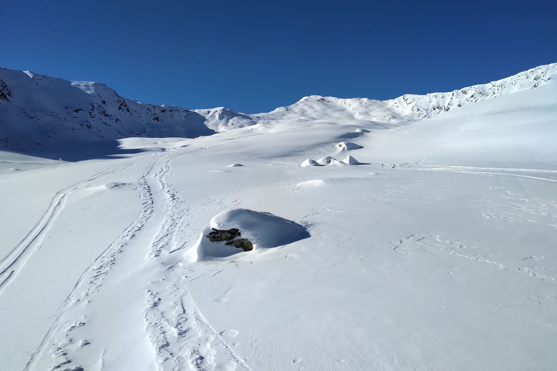 Die nächtliche Abstrahlung war dann an der unteren Grenze der Vorhersagen, so dass wir am Sonntag eine andere Tour ausgesucht haben. Diese Tour (Alternativroute zum Silberpfennig) hat sich im Nachhinein aber als sehr schön herausgestellt! Wir sind über die Filzenalm und das Filzenkar in den Sattel nördlich vom Bockhart aufgestiegen (der Name war heute unpassend). Die Normalroute zum Silberpfennig hat uns wenig angesprochen, so dass wir auf 2300 kurz nach Norden abgefahren sind und nach einer längeren Querung übers Silberkarl zum Silberpfennig aufgestiegen sind. Eine schöne einsame Route und später eine tolle Abfahrt ins Silberkarl!