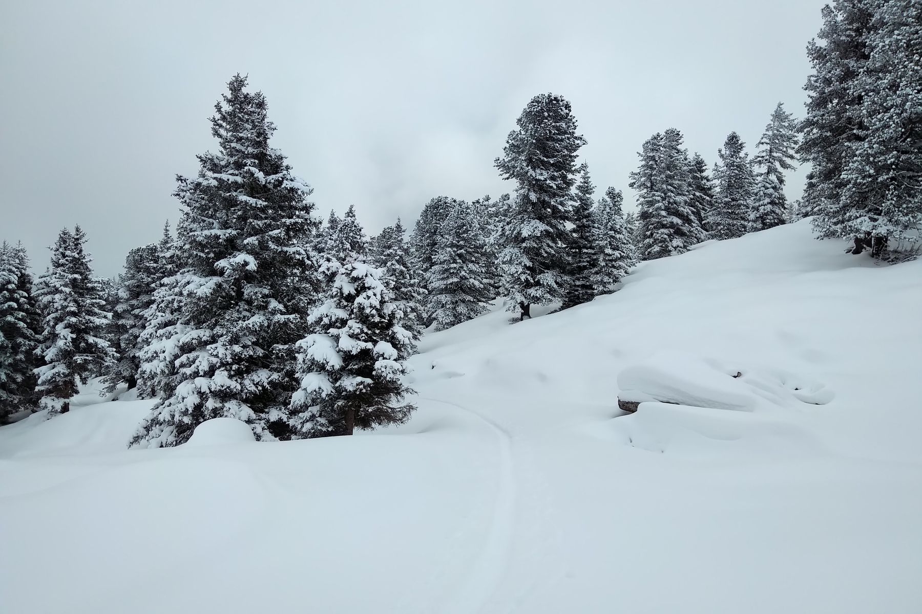 Der Fotscher Windegg war heut am Sonntag auch eine gute Wahl bei Schneefall und schlechter Sicht. Unten genug Schnee für eine entspannte Abfahrt auf der Forststraße, und oben bei bestimmten Hang-Expositionen noch schöner Pulver!
