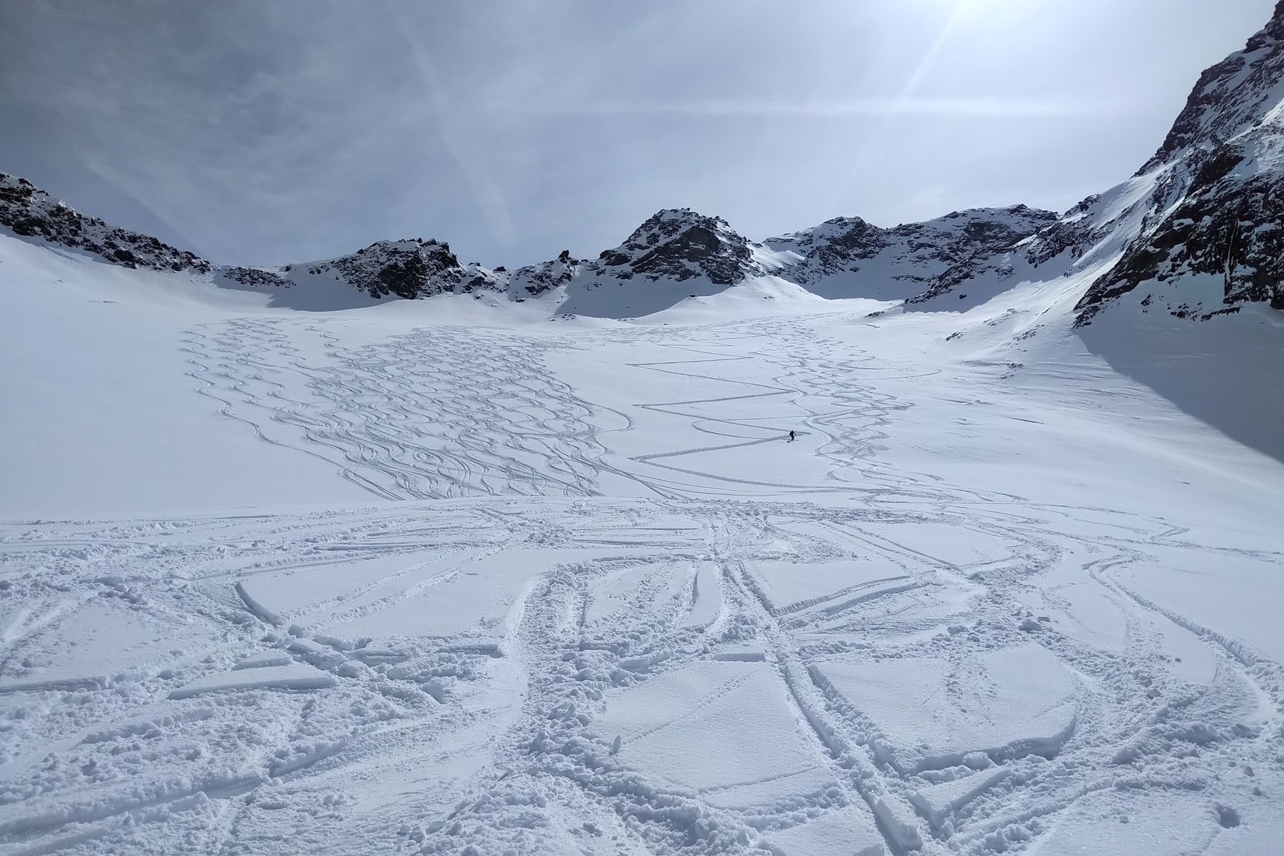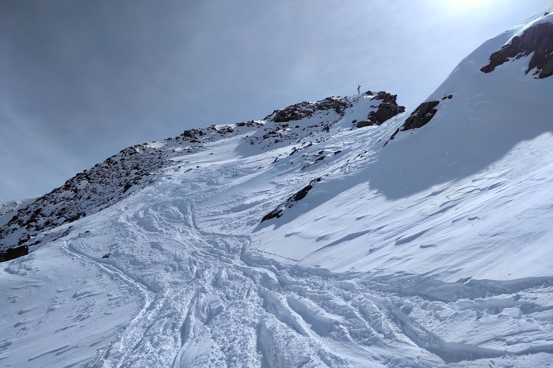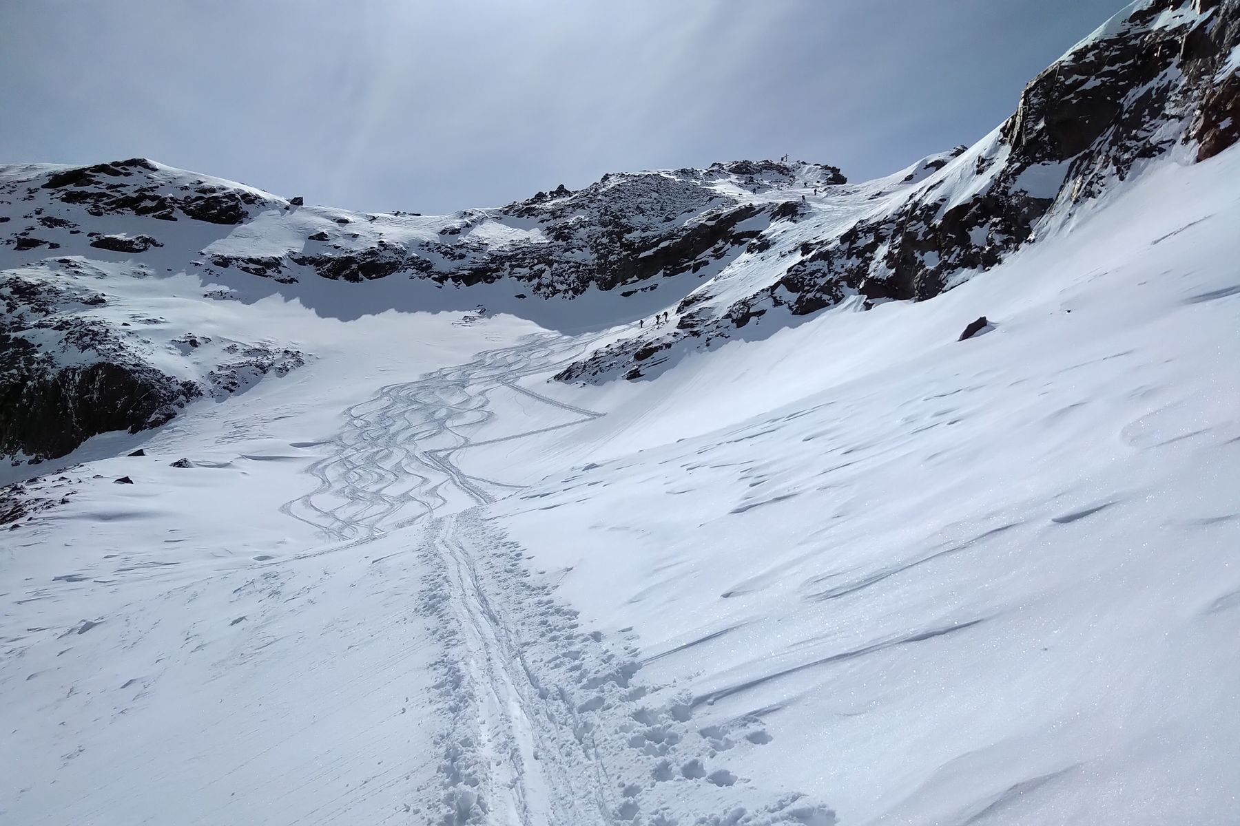 Geniale Abfahrts-Verhältnisse am Samstag! Es war inzwischen zwar schon mehr verspurt, weil einige vor dem Gipfelaufschwung umgedreht sind - aber es war noch genug Platz für eigene Spuren: